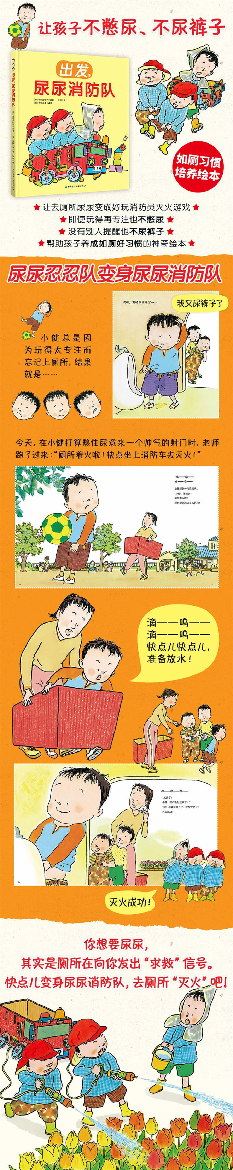 本书就是针对这一类的小朋友,告诉孩子你想要尿尿,其实是厕所在向你发出“求救”信号。快点儿变身尿尿消防队,去厕所“灭火”吧!