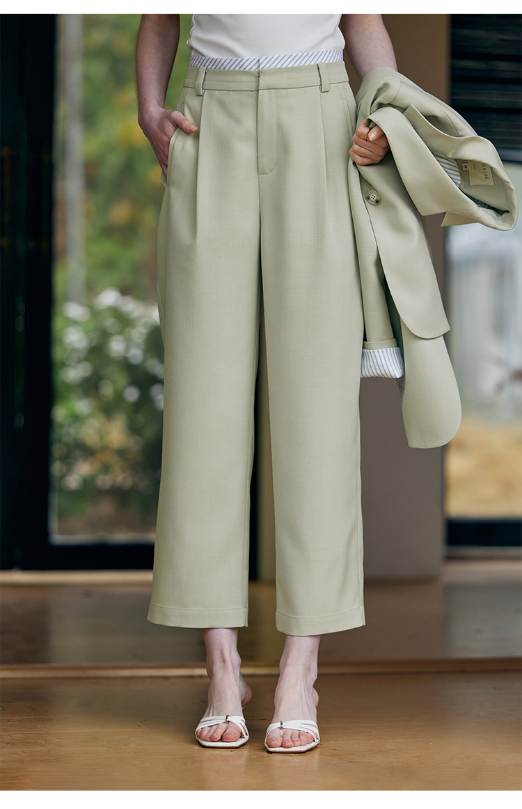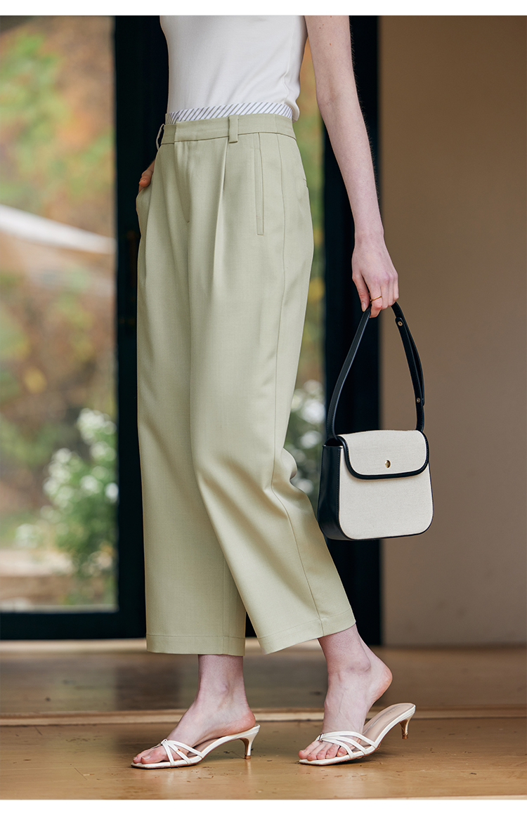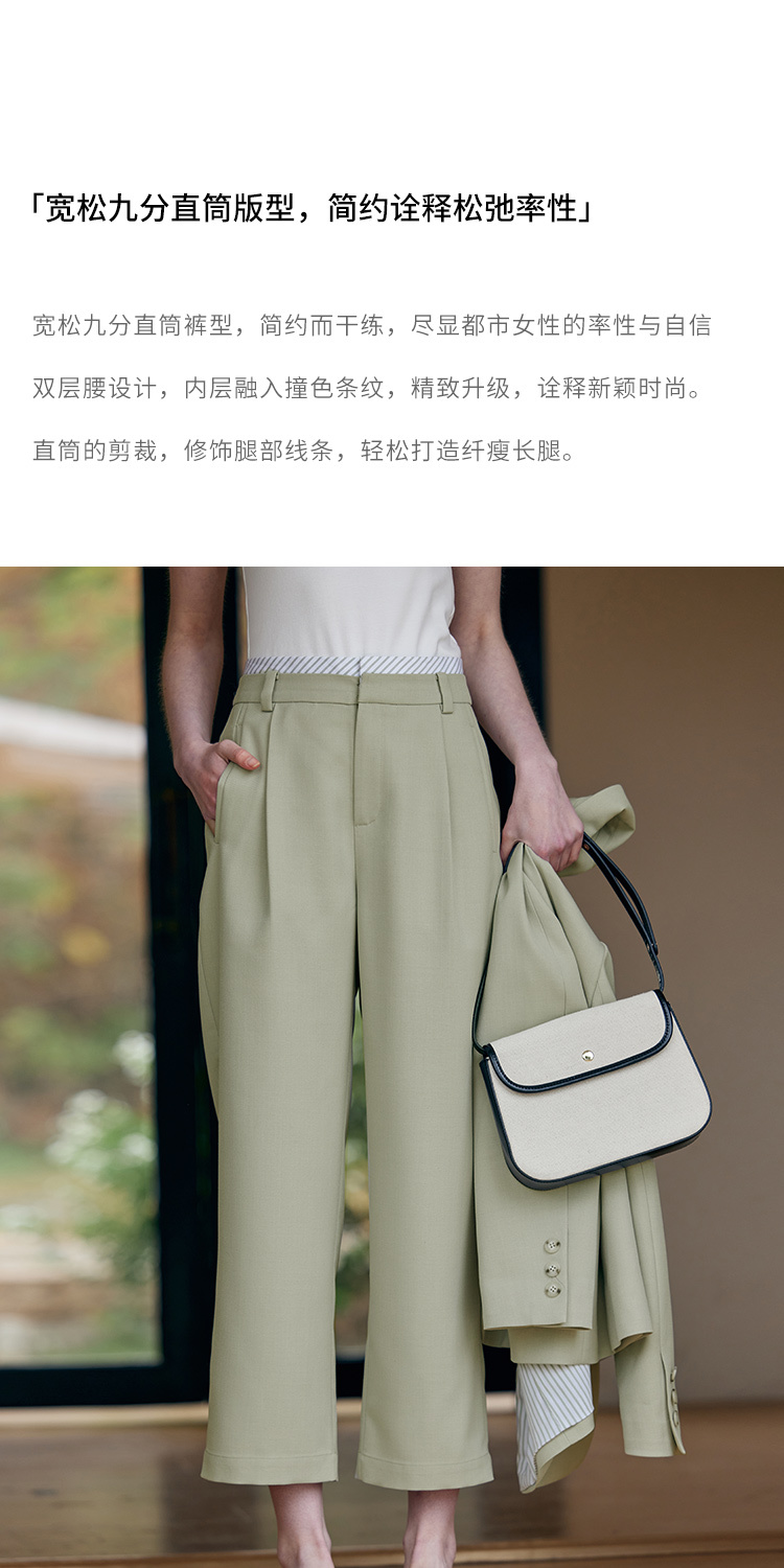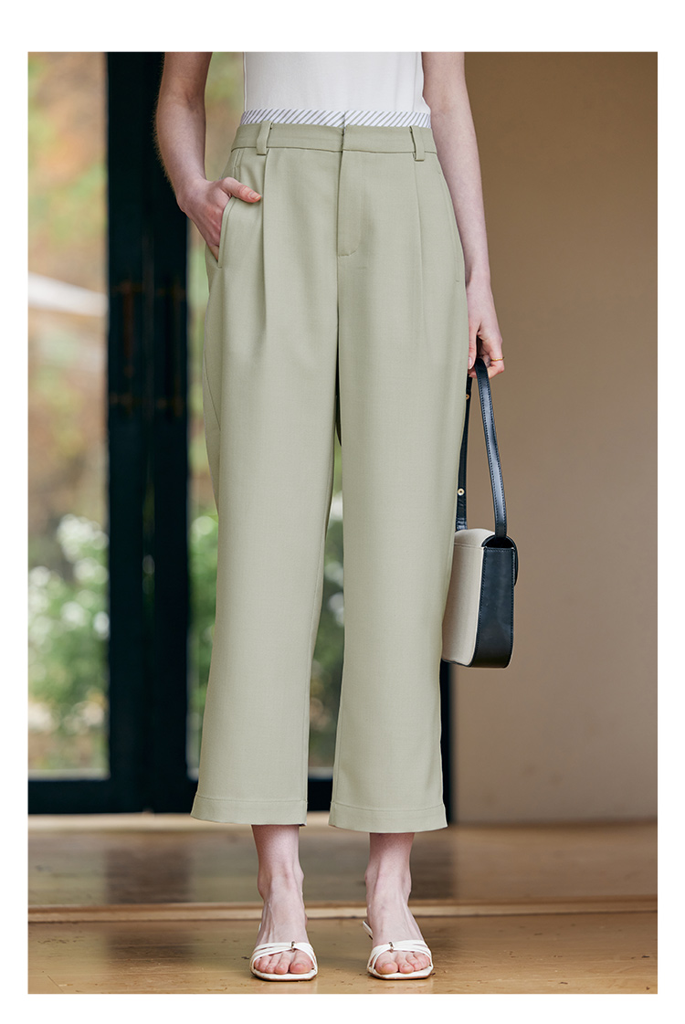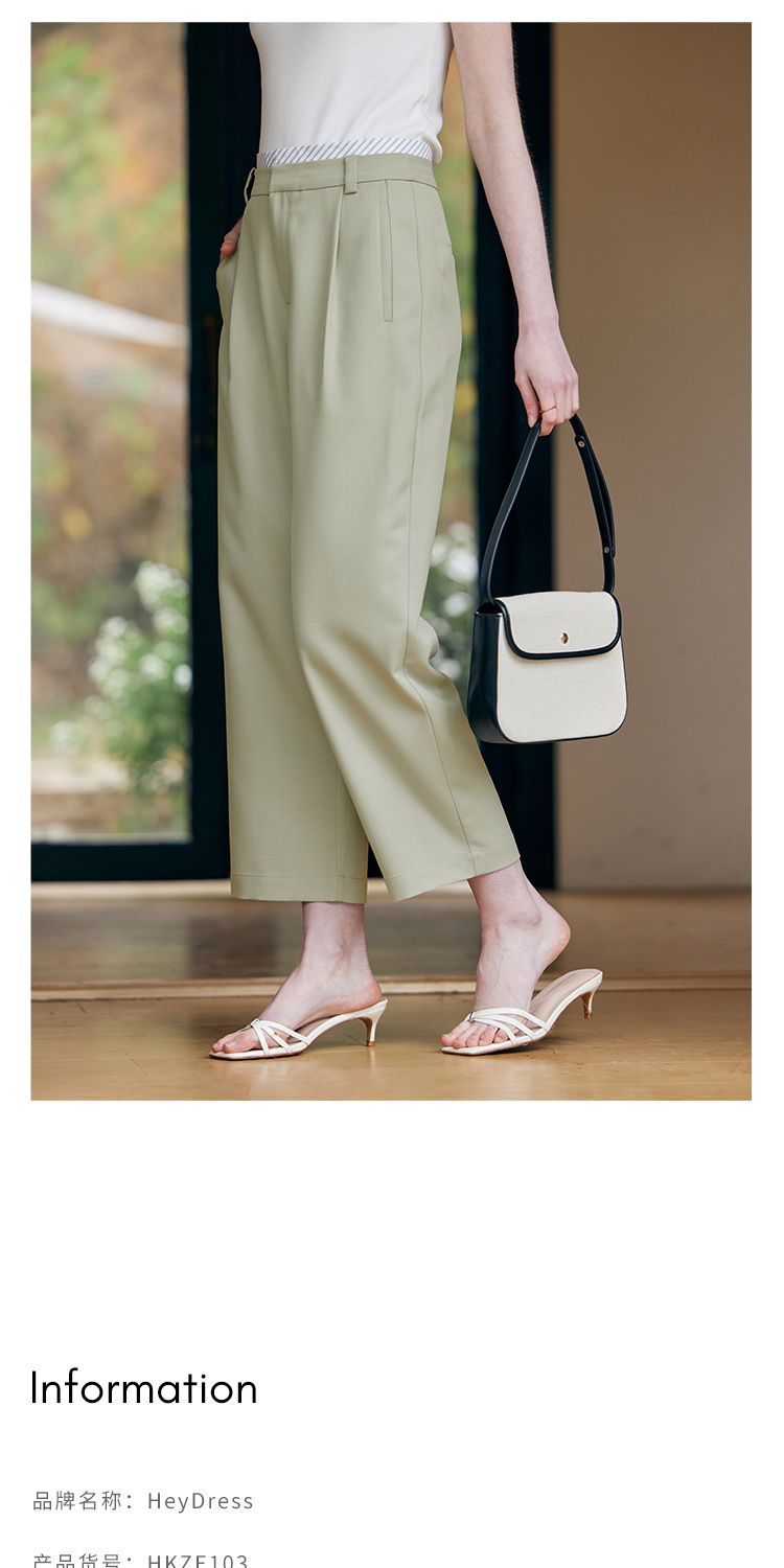 HeyDress豆绿色休闲裤女春季双层高腰显瘦西装裤百搭通勤九分裤子