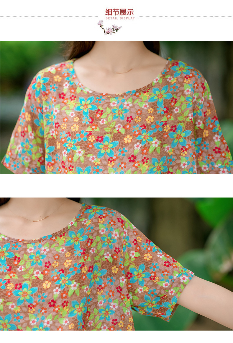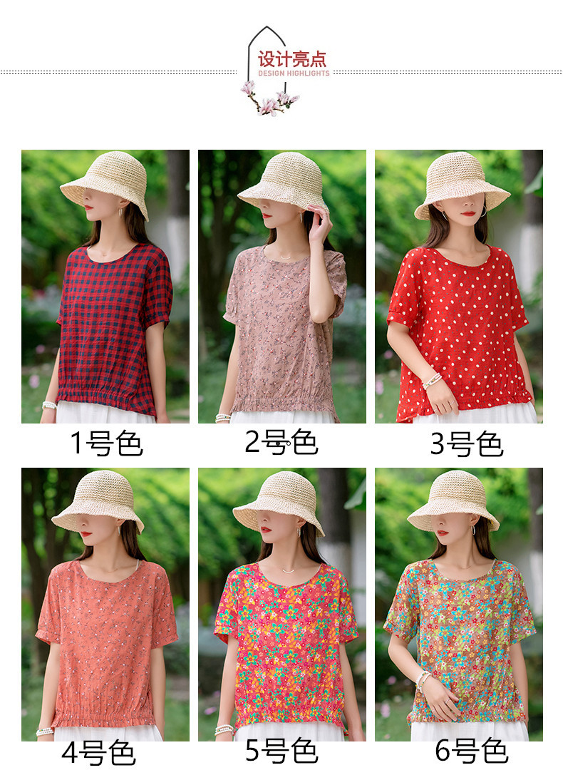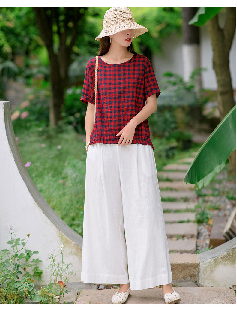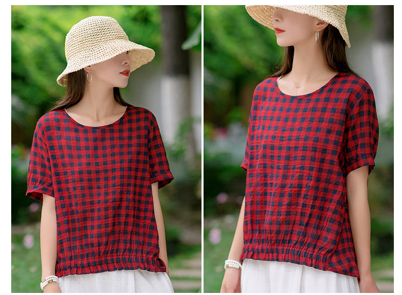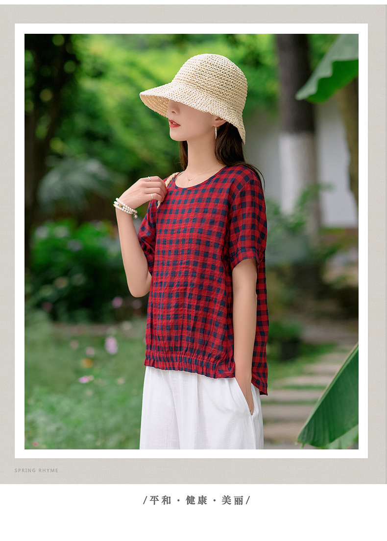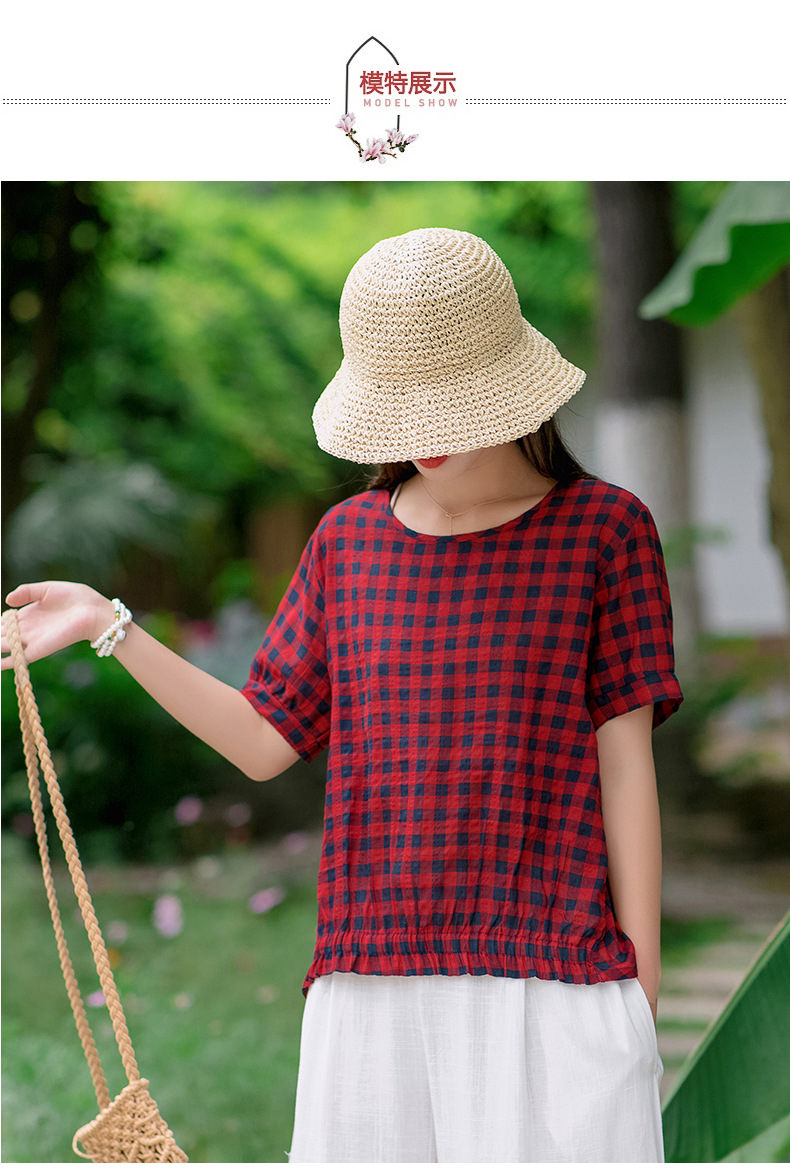 MQ-1918-A809夏新款民族风圆领宽松格子条纹短袖棉麻t恤YY
