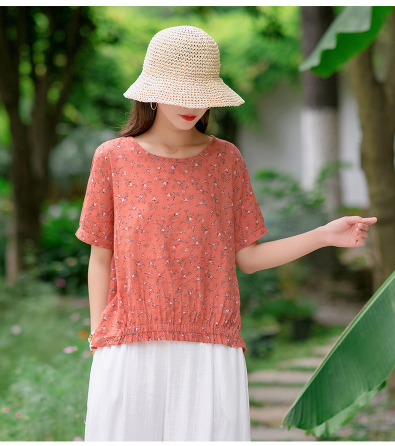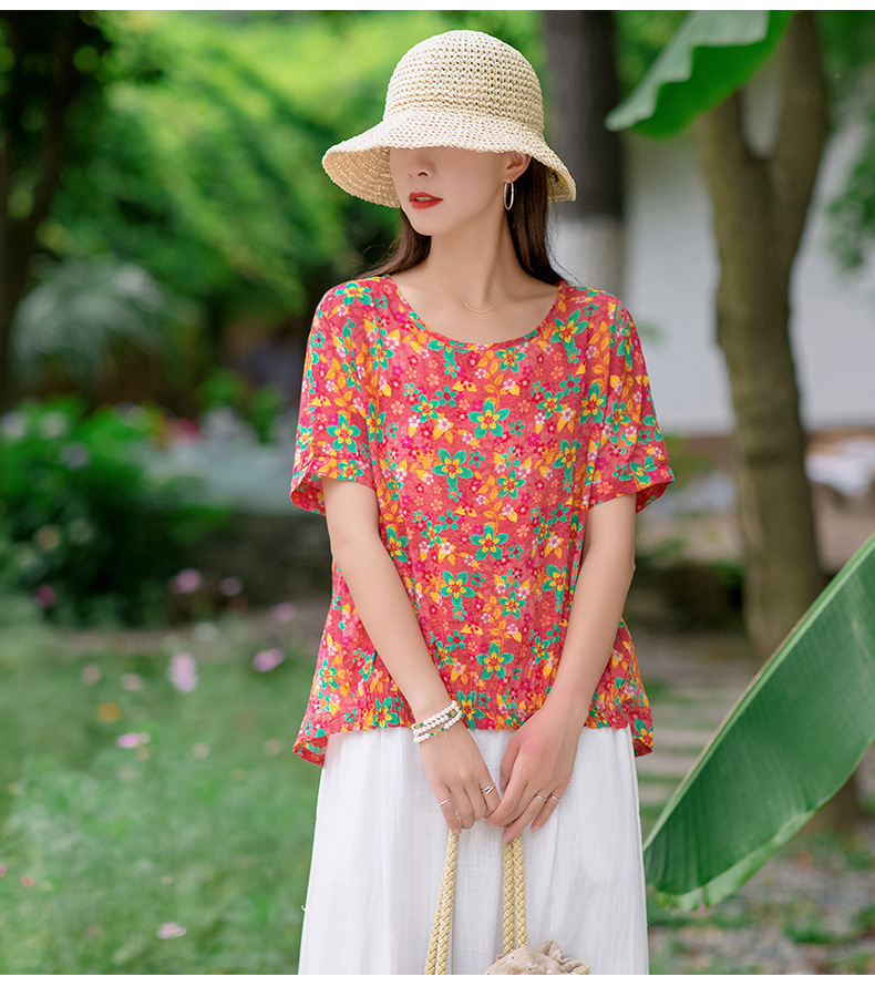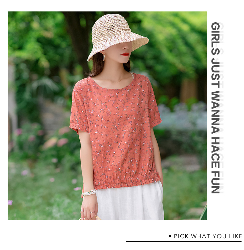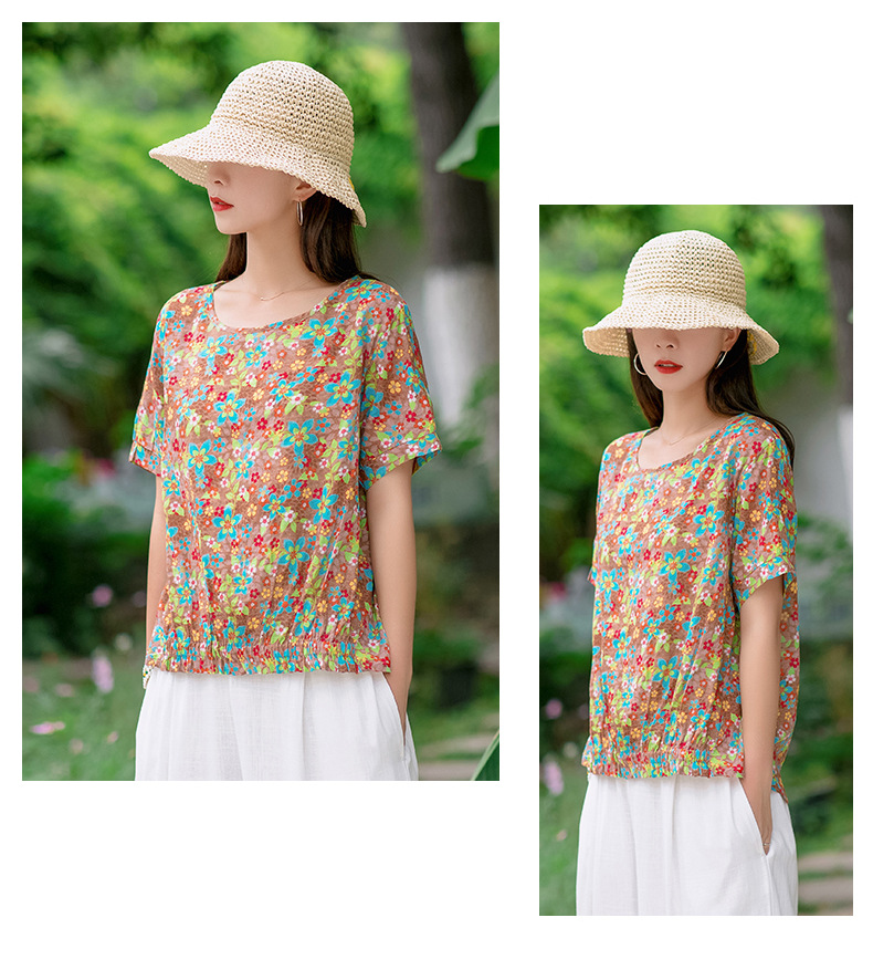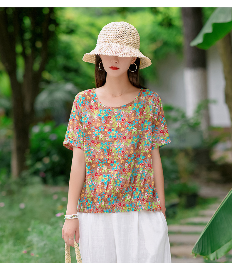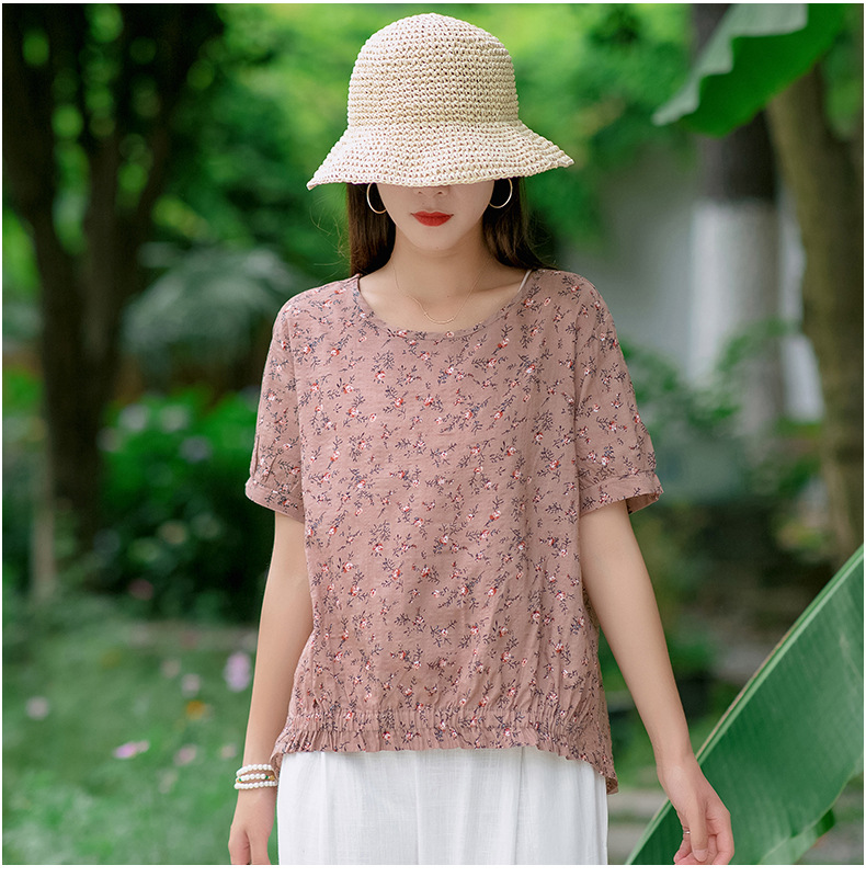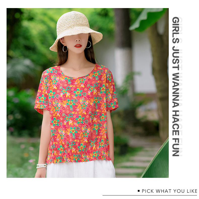 MQ-1918-A809夏新款民族风圆领宽松格子条纹短袖棉麻t恤YY