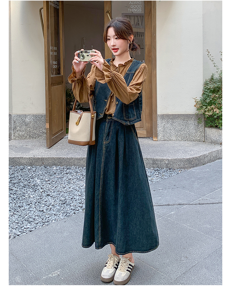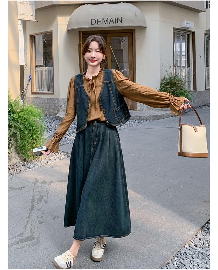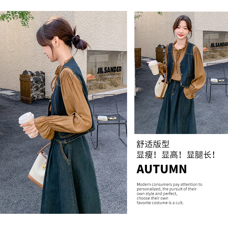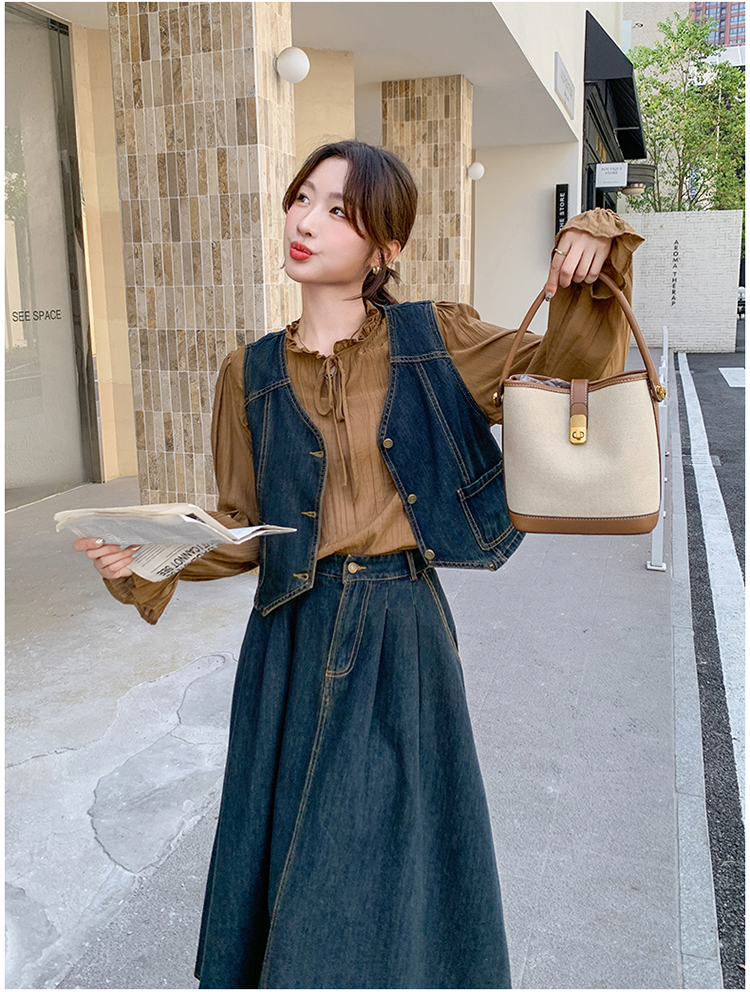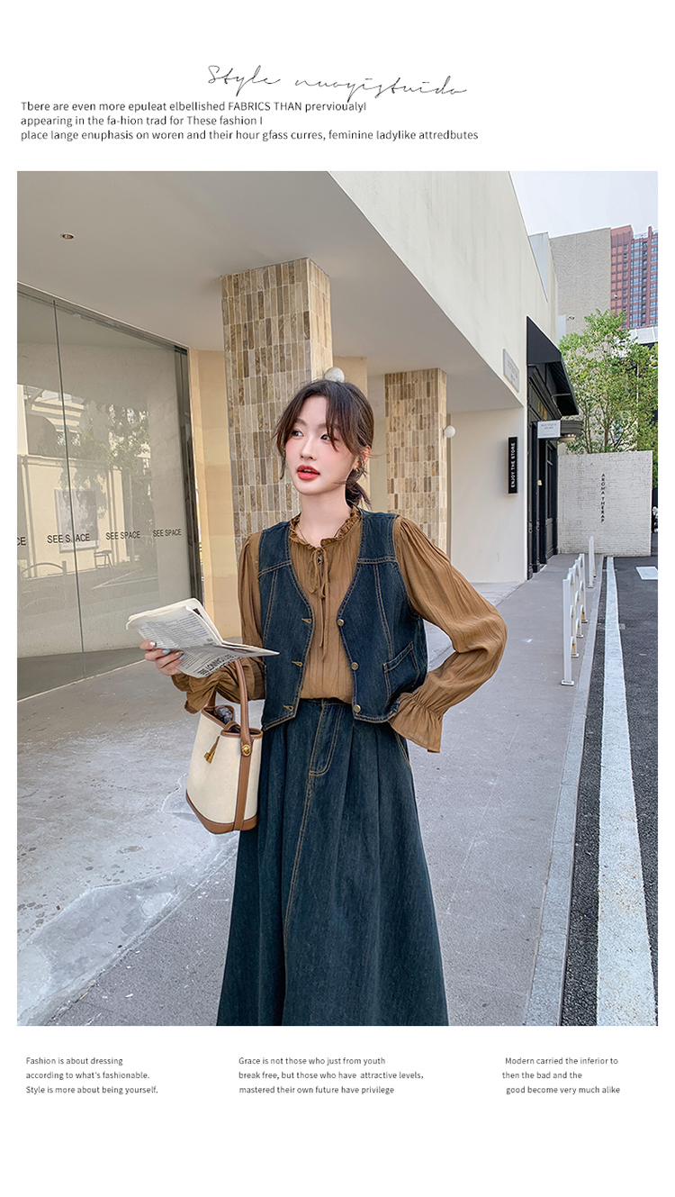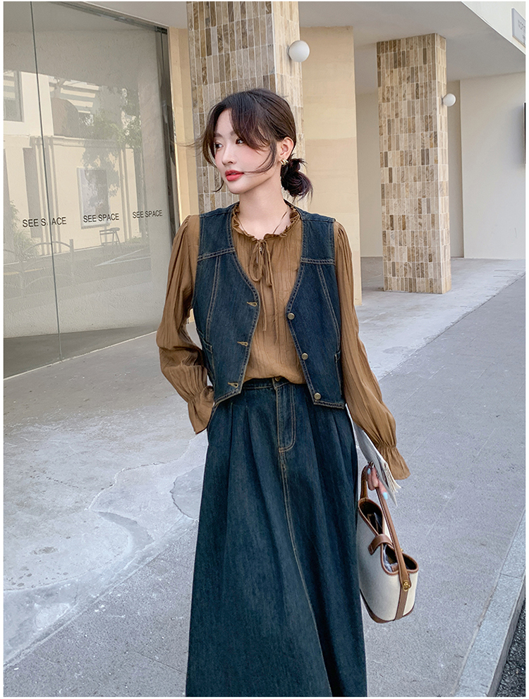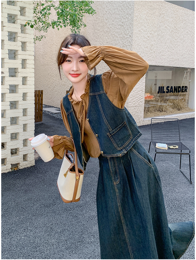 时尚休闲复古牛仔马甲+衬衫+半裙三件套裙HR-YINXX6618