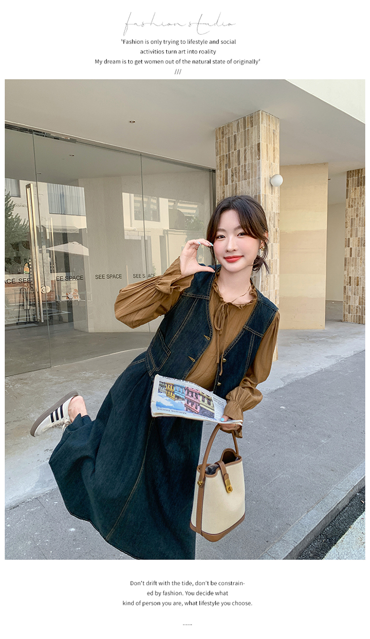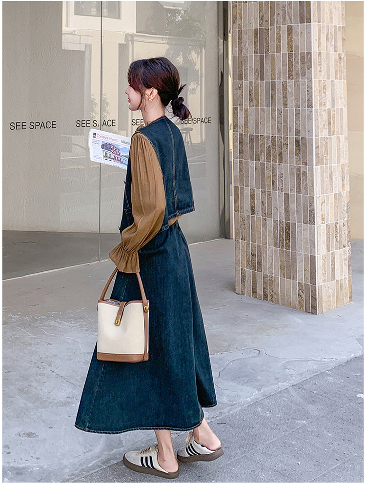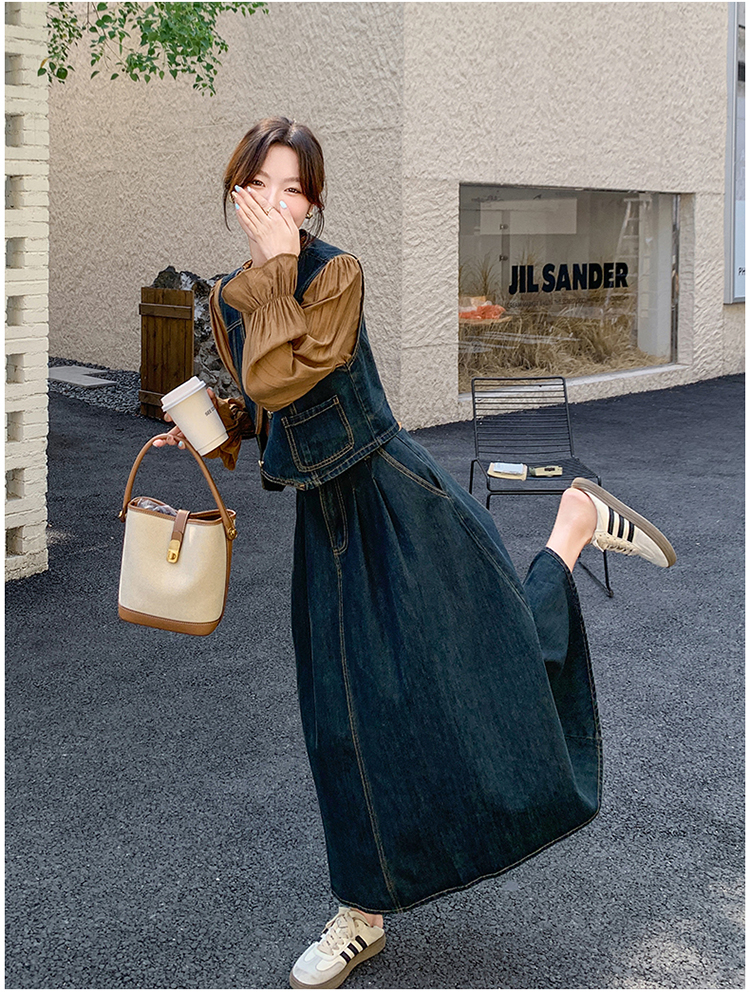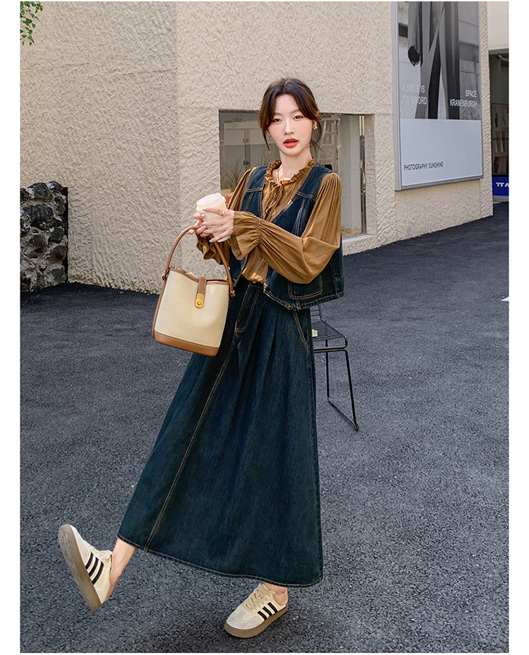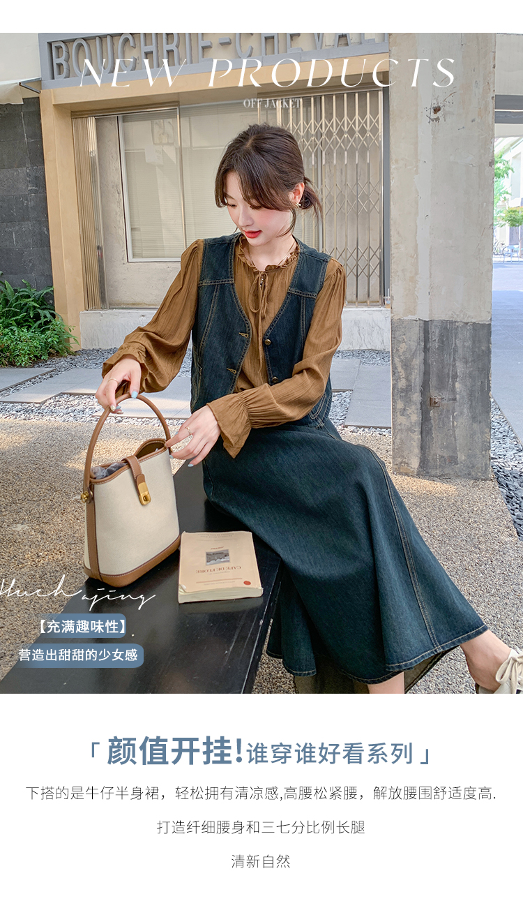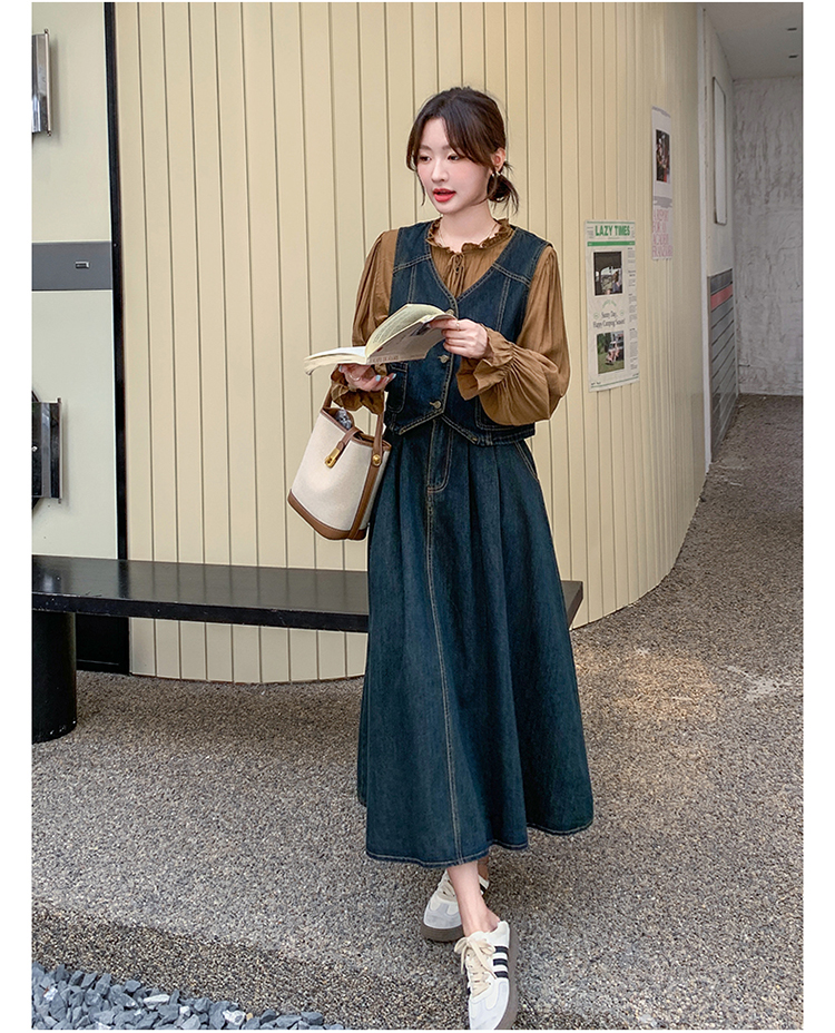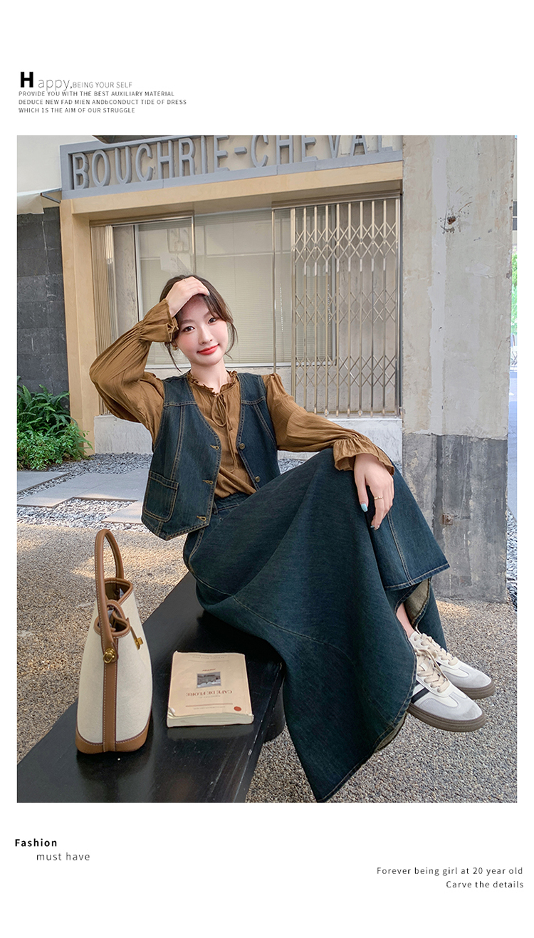 时尚休闲复古牛仔马甲+衬衫+半裙三件套裙HR-YINXX6618