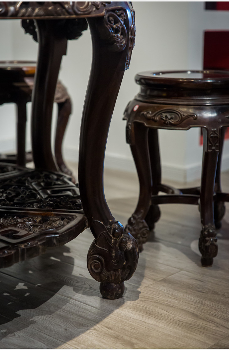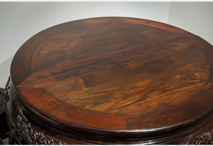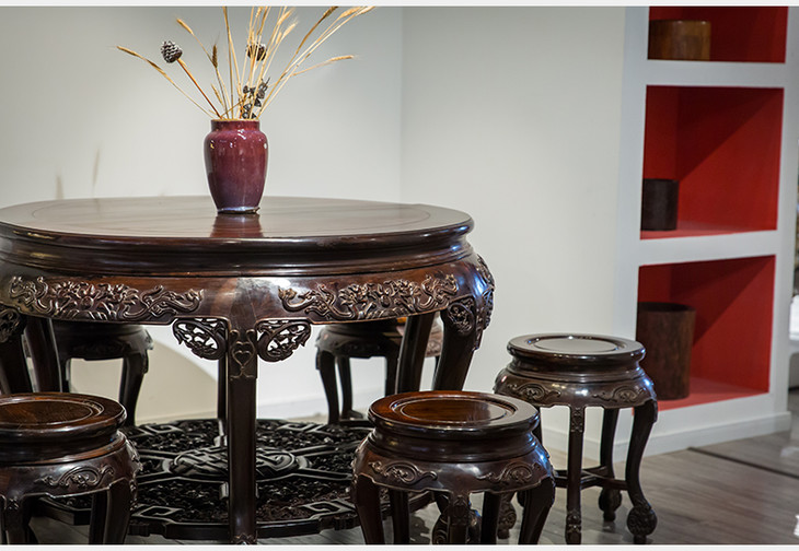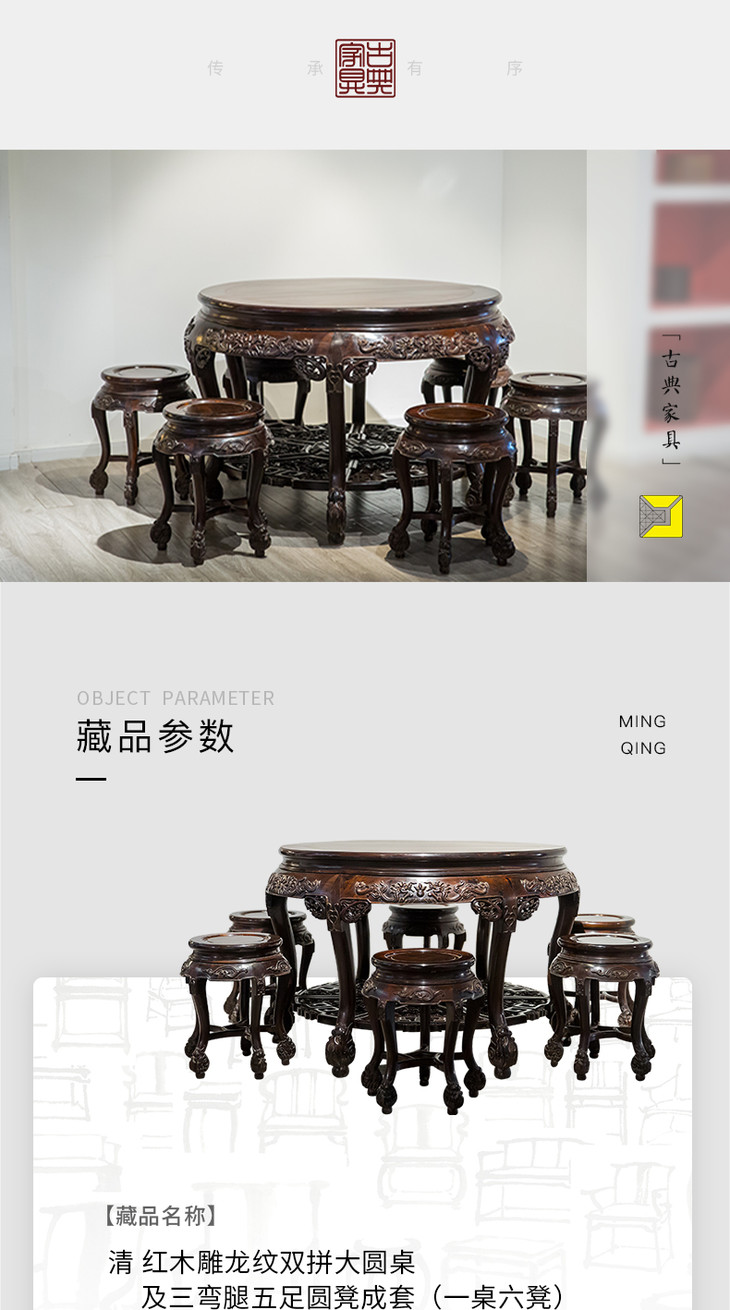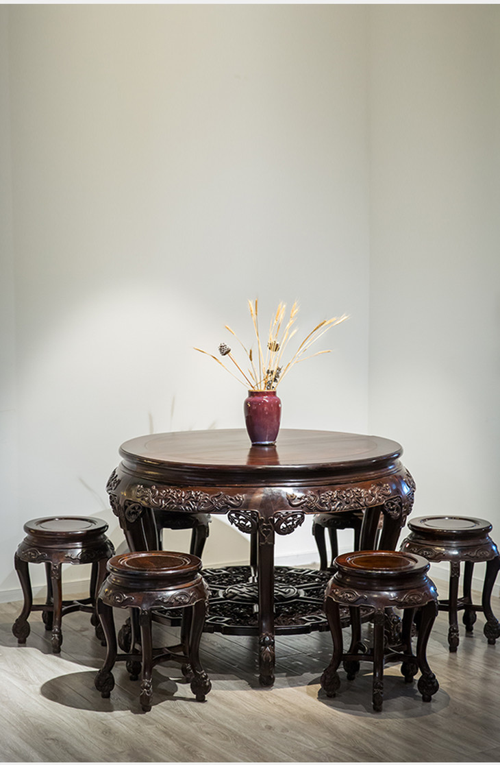 清代 红木雕龙纹双拼大圆桌及三弯腿五足圆凳成套(一桌六凳)