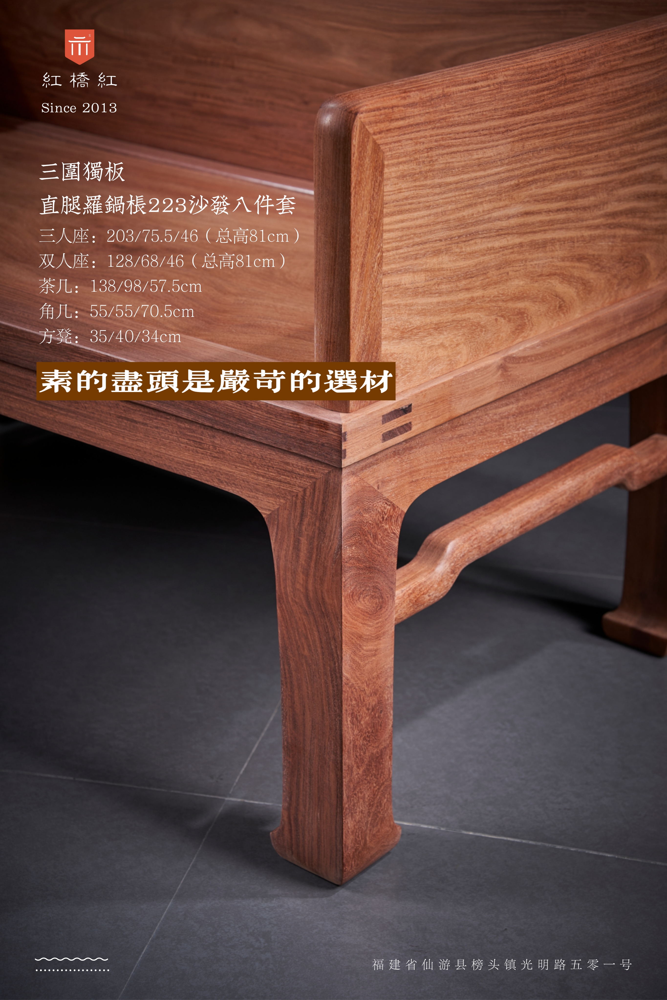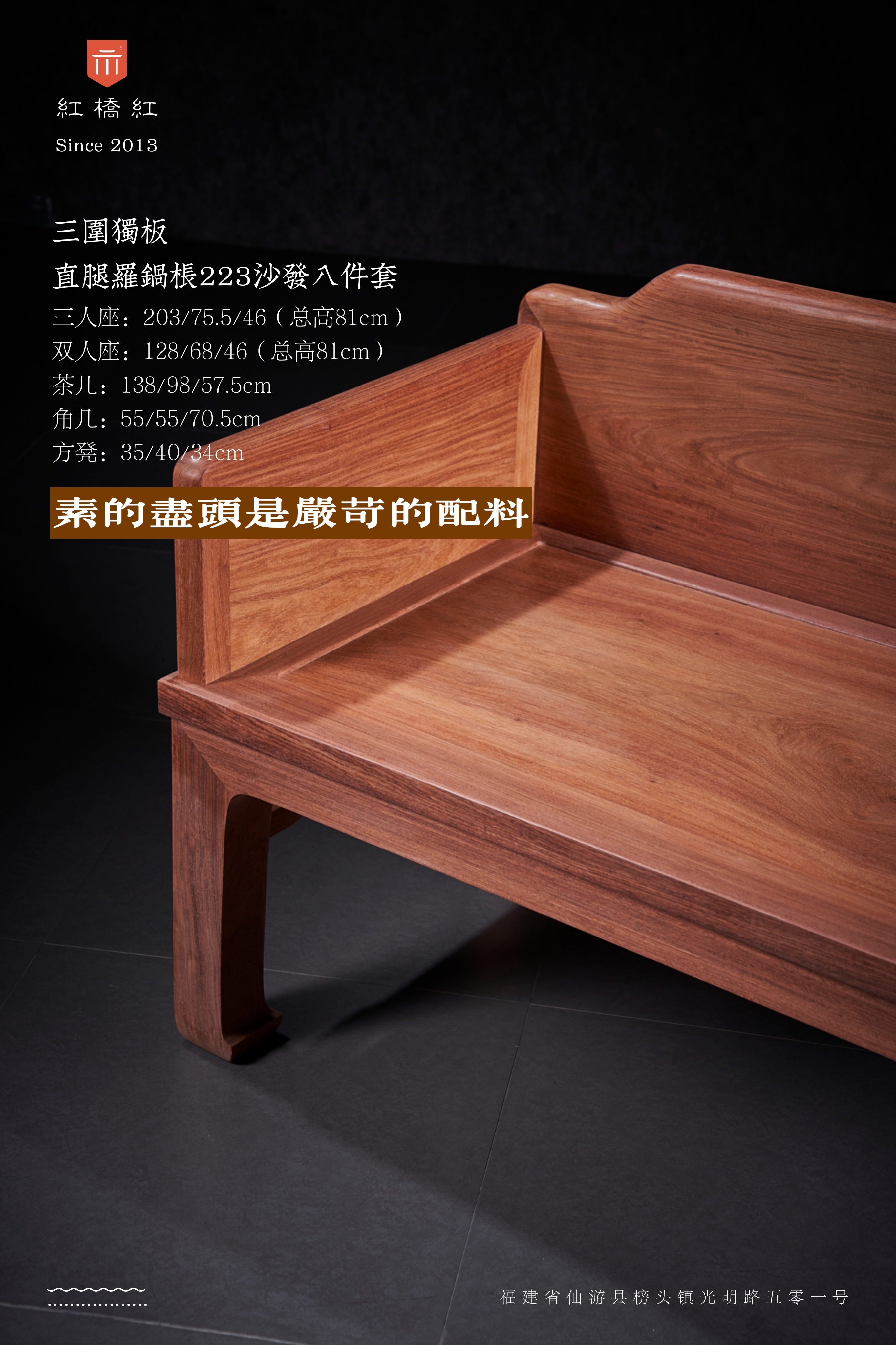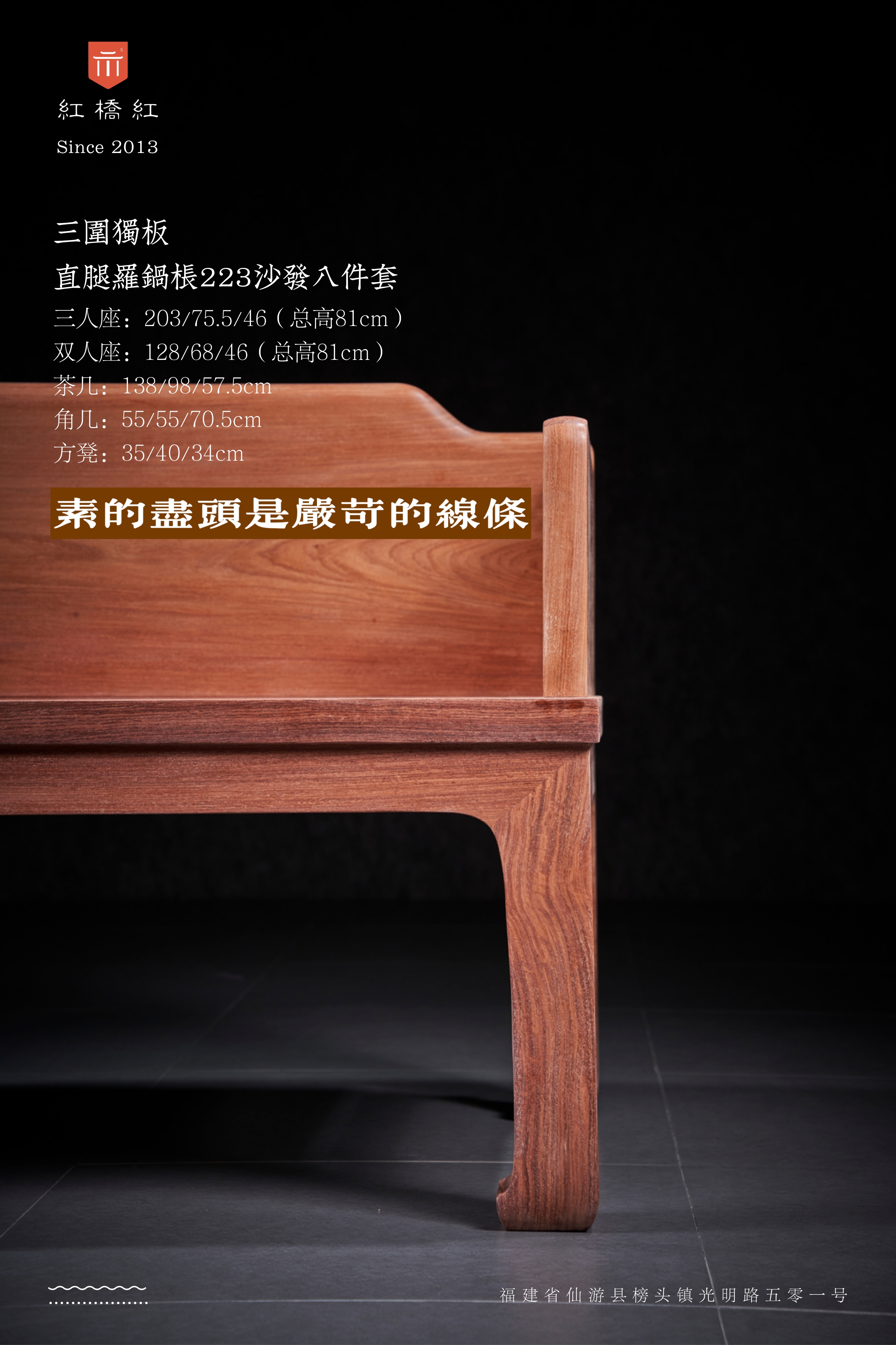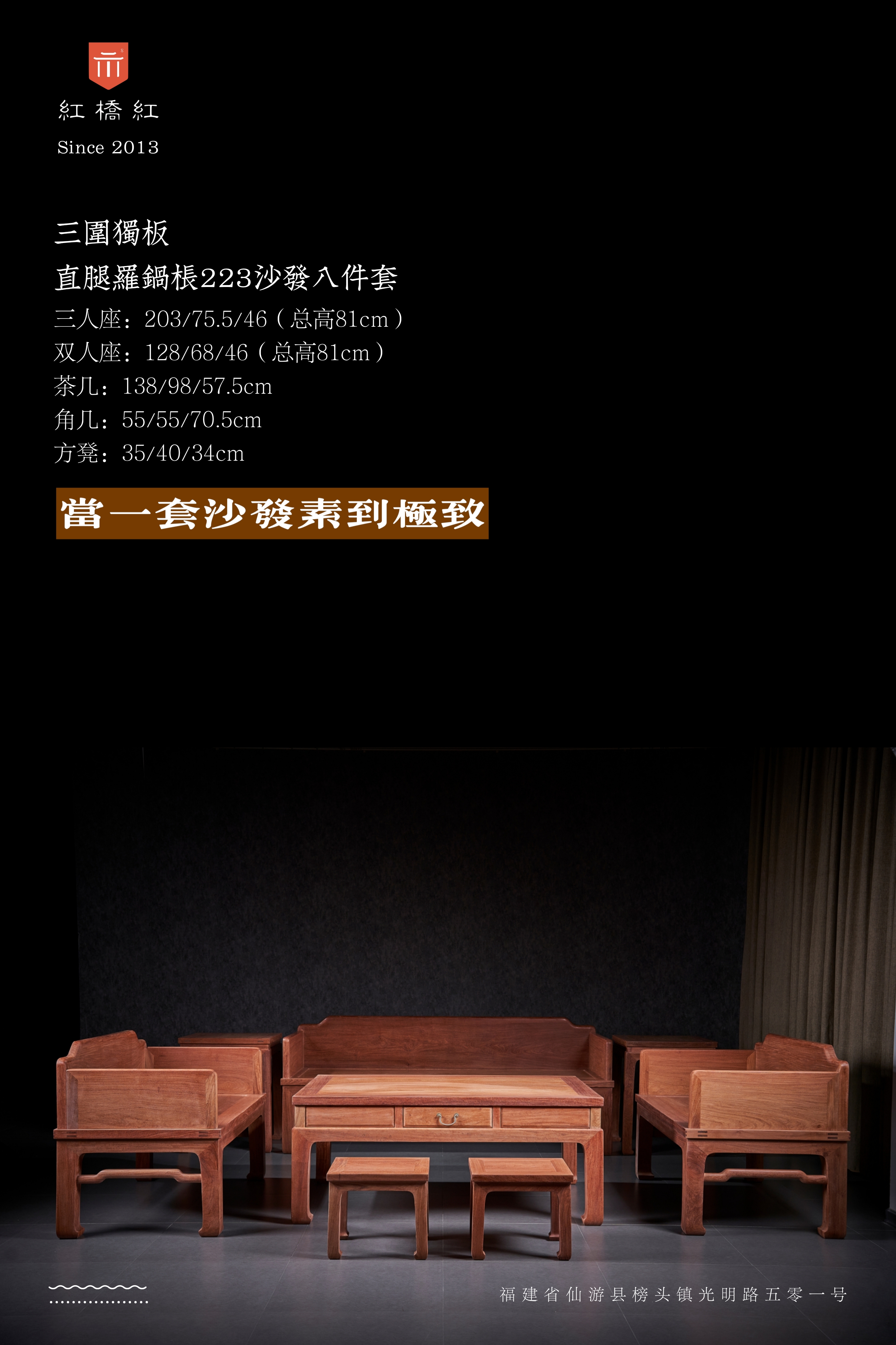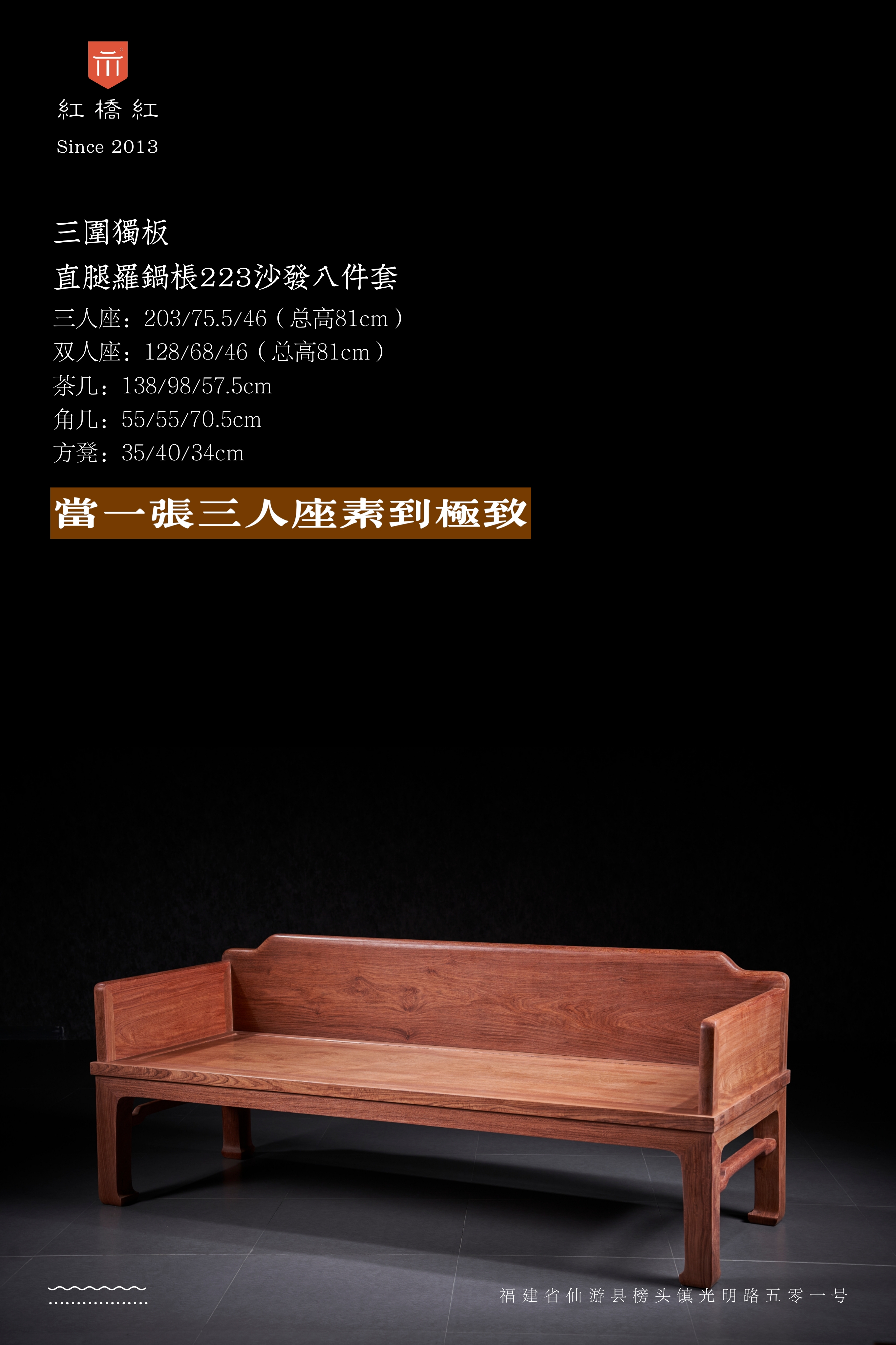 中国嘉德香港2017年秋季五周年庆典拍卖会“哲匠斤墨—名家藏明式家具精品及雅玩”专场上拍一张明黄花梨无束腰马蹄腿独板围子罗汉床近例,以34,350,000港币成交。以此古韵今用,汲取设计灵感,结合当代生活与空间需求,成此款三围独板直腿罗锅枨223沙发八件套。