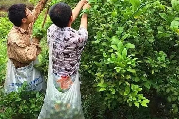 黄柠檬露天成长,没有套袋,果子会粗糙一些(外貌不太靓丽)。待到果子成熟采摘时,农人就会肩挎一个大兜或木蓝子,往山里走,挑成熟度足够的果子采摘。