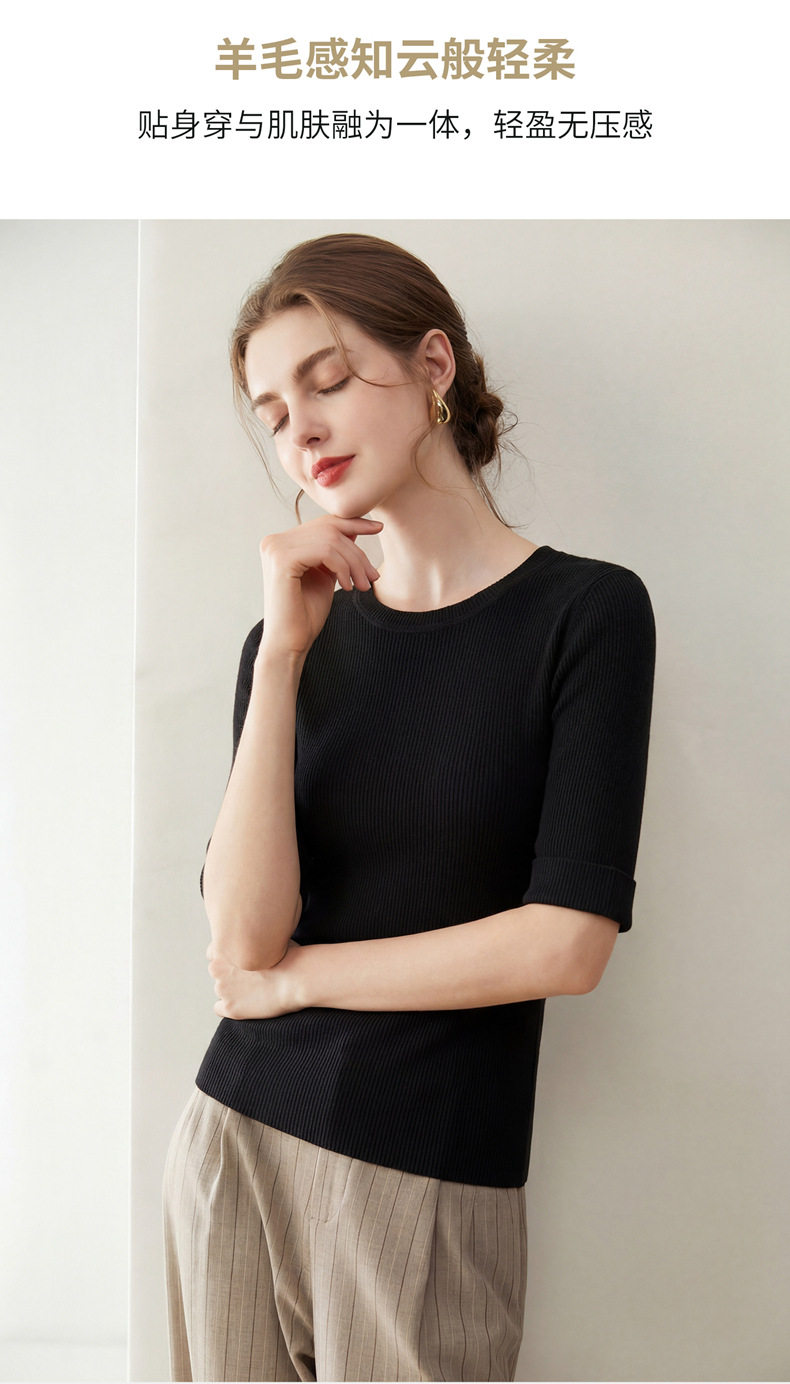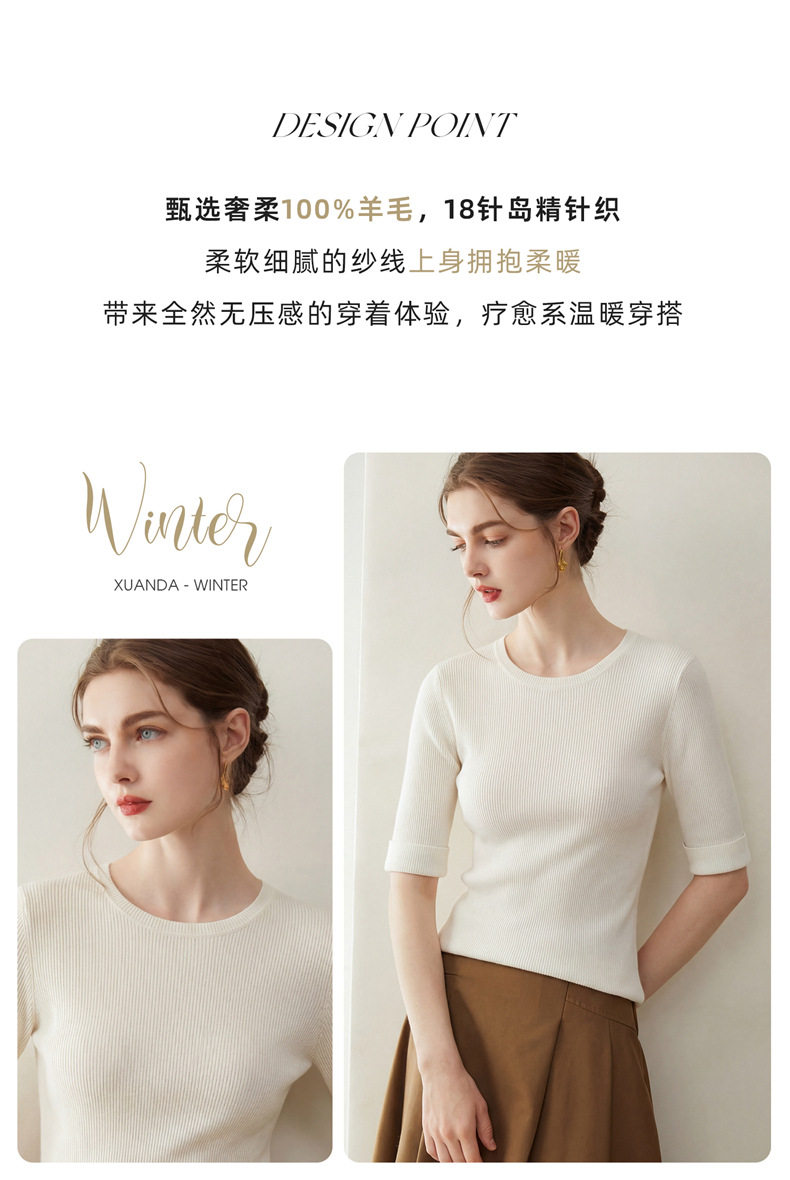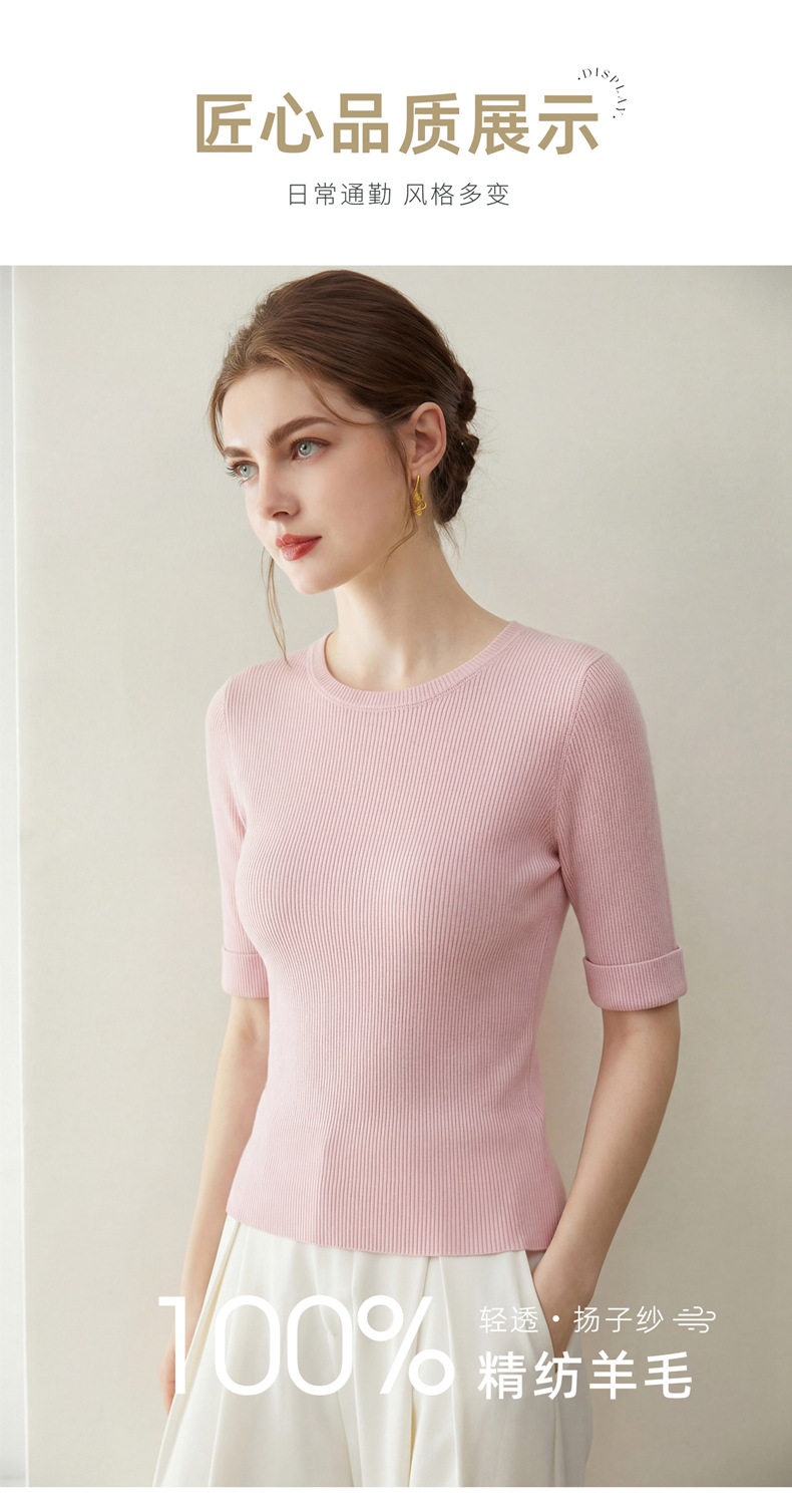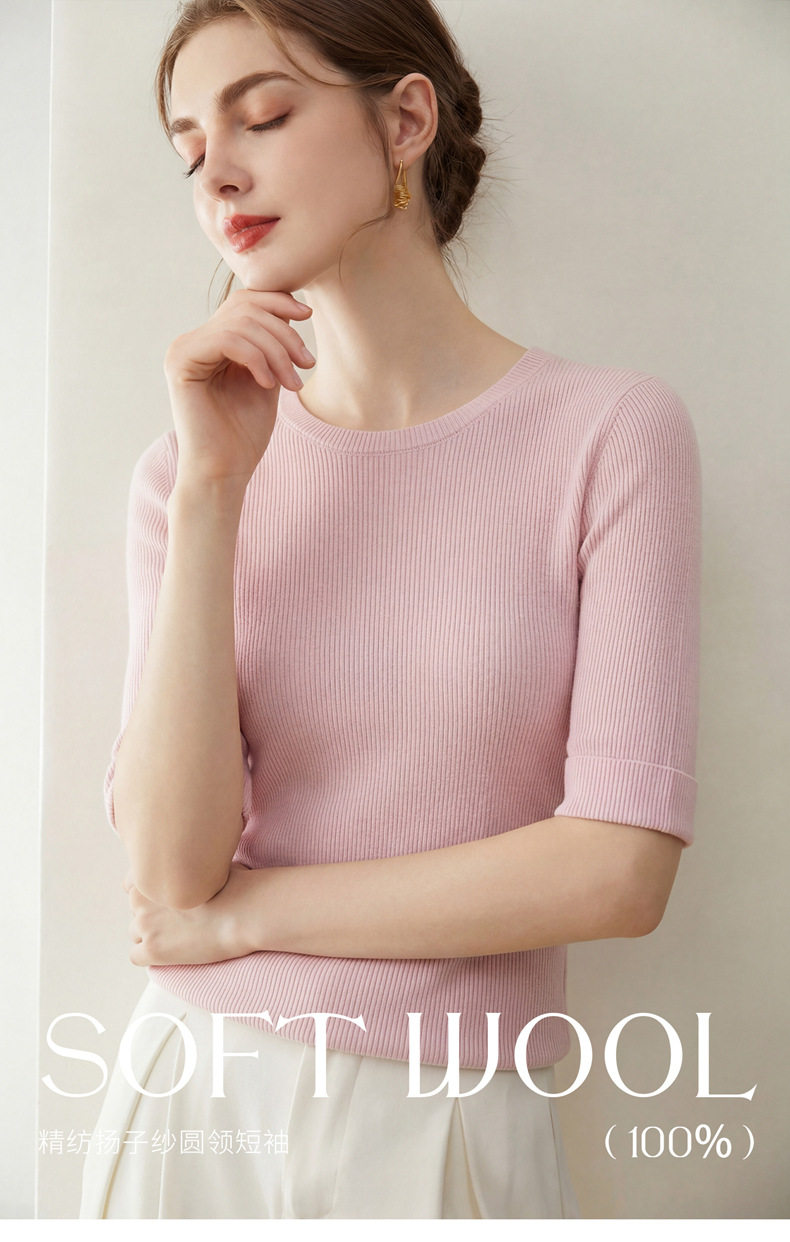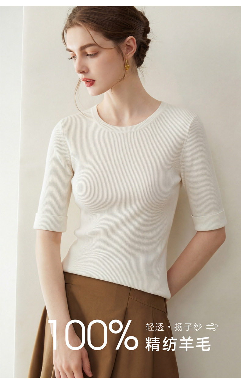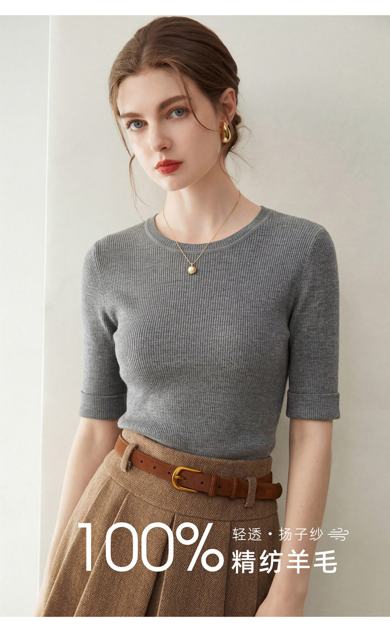 「自」全新升级【铂金会员293/天猫389/差价96】(14009)洛诗琳袖口挽边羊毛针织短袖2026新款优雅修身五分袖上衣