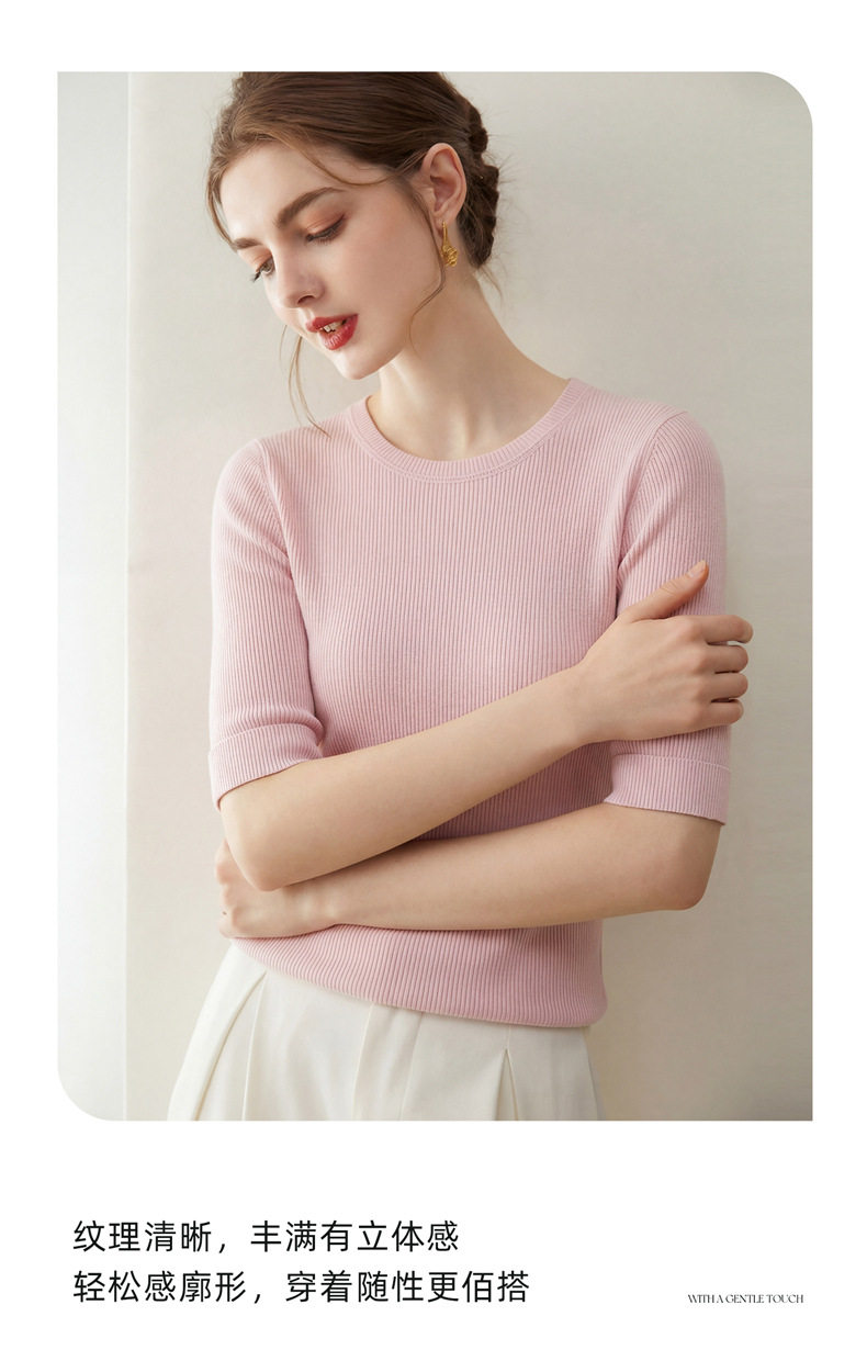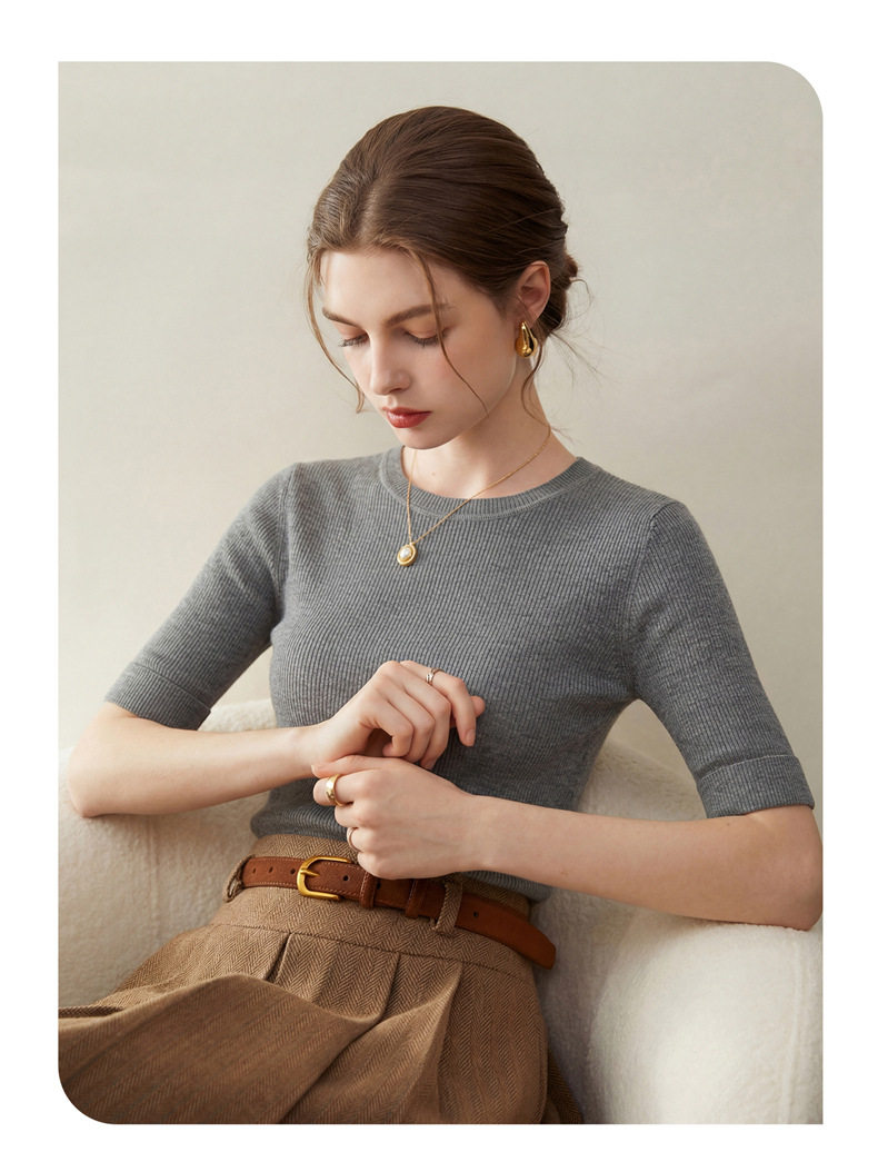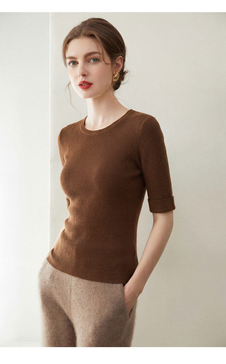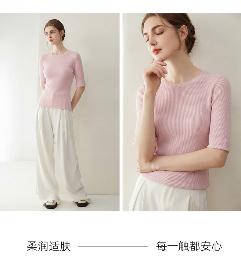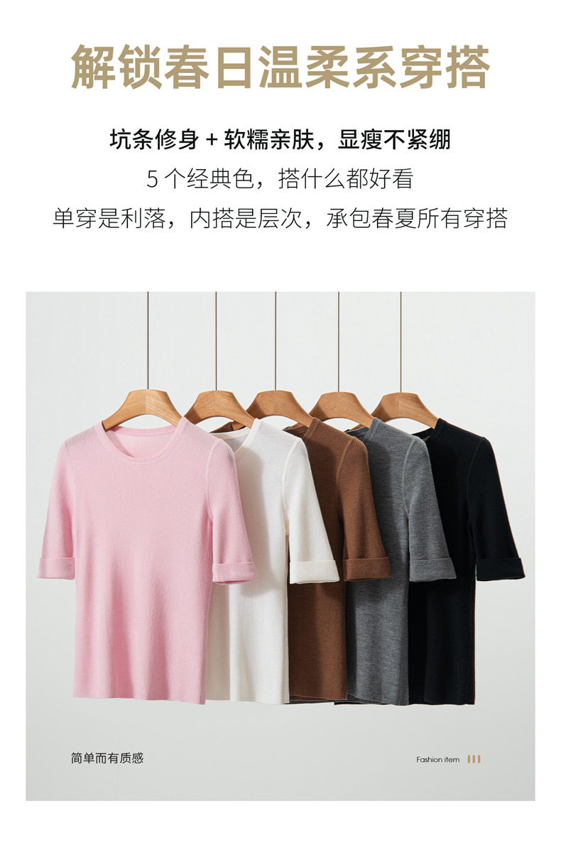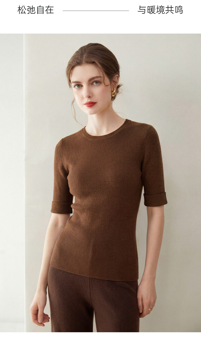 「自」全新升级【铂金会员293/天猫389/差价96】(14009)洛诗琳袖口挽边羊毛针织短袖2026新款优雅修身五分袖上衣