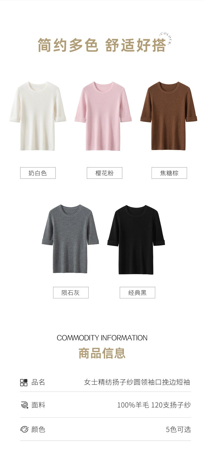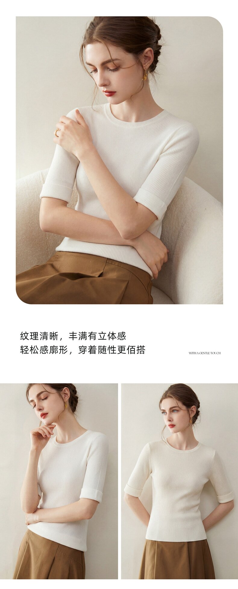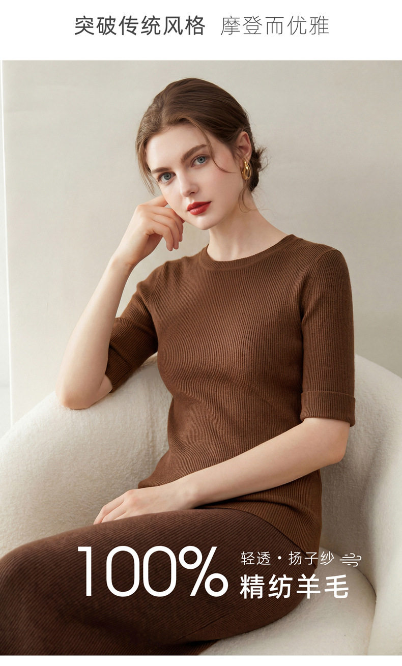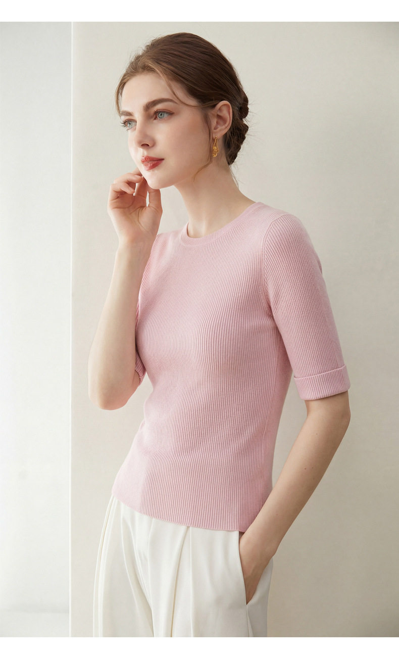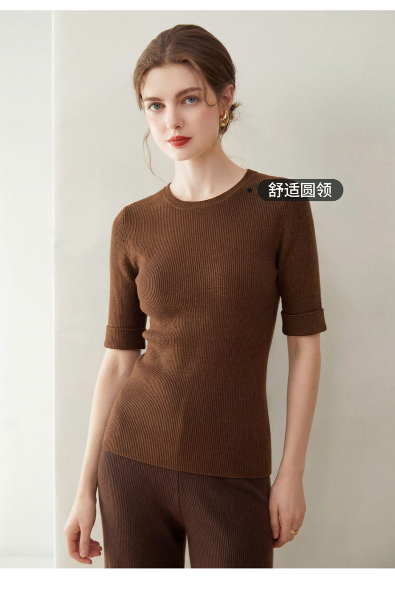 「自」全新升级【铂金会员293/天猫389/差价96】(14009)洛诗琳袖口挽边羊毛针织短袖2026新款优雅修身五分袖上衣