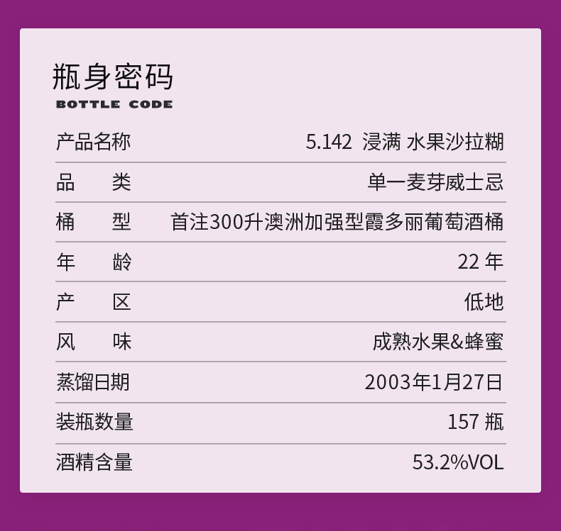 【SMWS】5.142 浸满 水果沙拉糊 22年 单一麦芽 威士忌 霞多丽葡萄酒桶