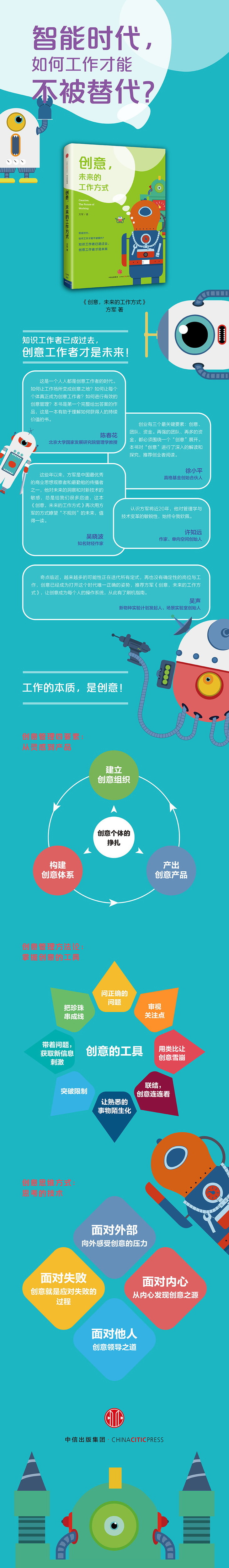《创意,未来的工作方式》对百年以来的价值创造群体变迁进行梳理,作者结合自身的丰富实践经验指出,创作者、程序员、管理者、创业者是未来创意人的典型原型,并总结提炼群体创意管理的四要素:个体的创意、创意的组织、创意的体系、创意的产品。本书还提供了一系列创意管理工具、创意思考方法,可作为我们创意工作和生活的的指引。