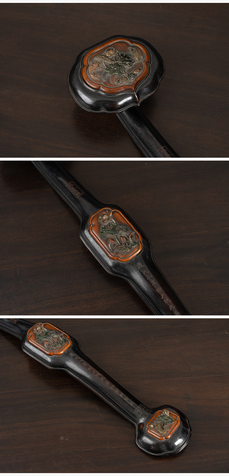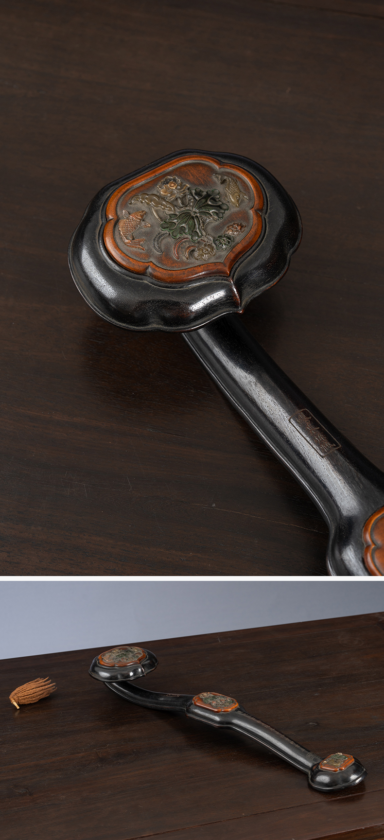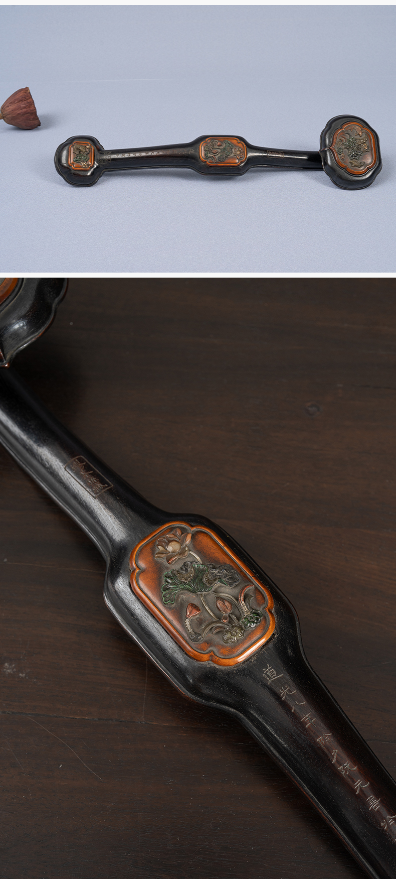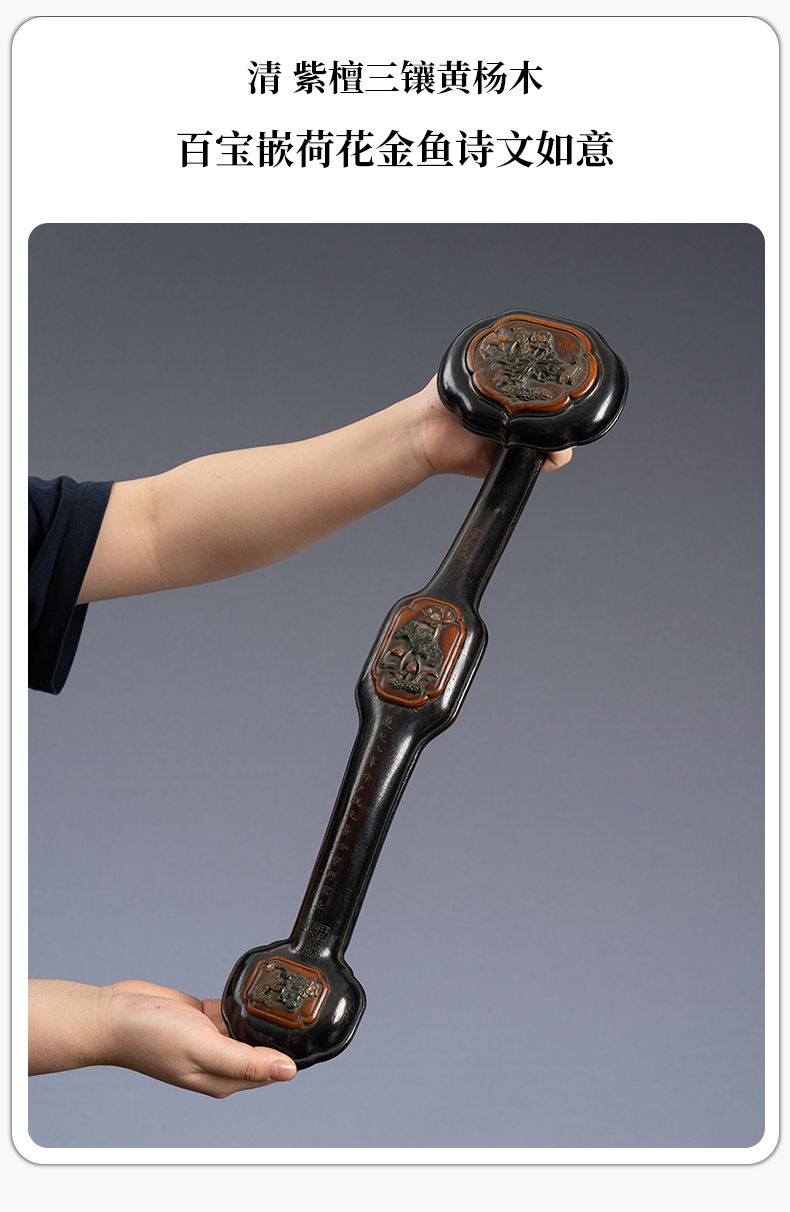清 紫檀三镶黄杨木百宝嵌荷花金鱼诗文如意