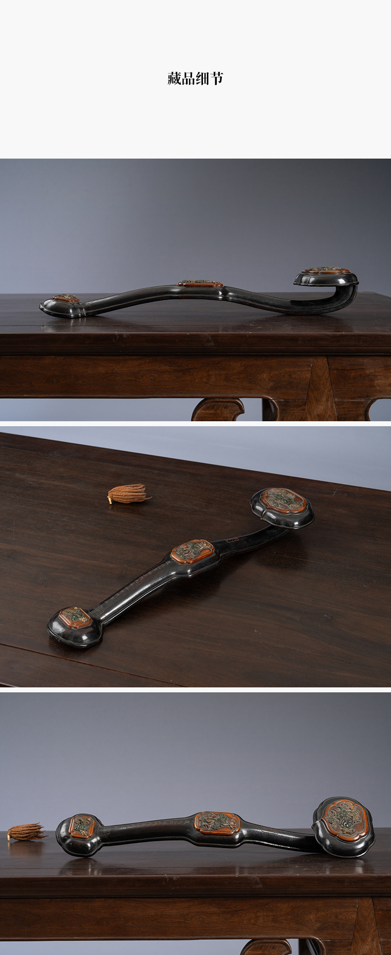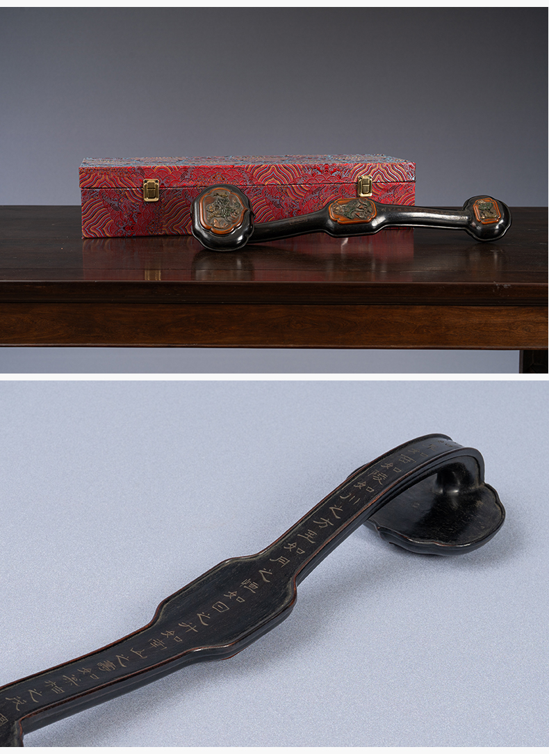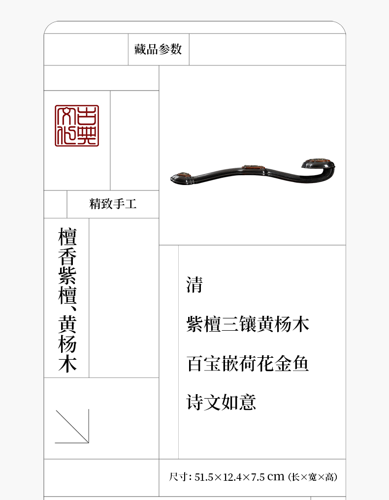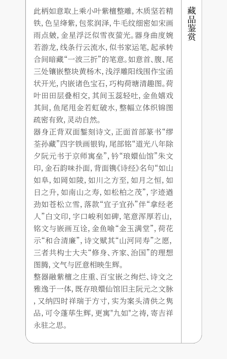清 紫檀三镶黄杨木百宝嵌荷花金鱼诗文如意