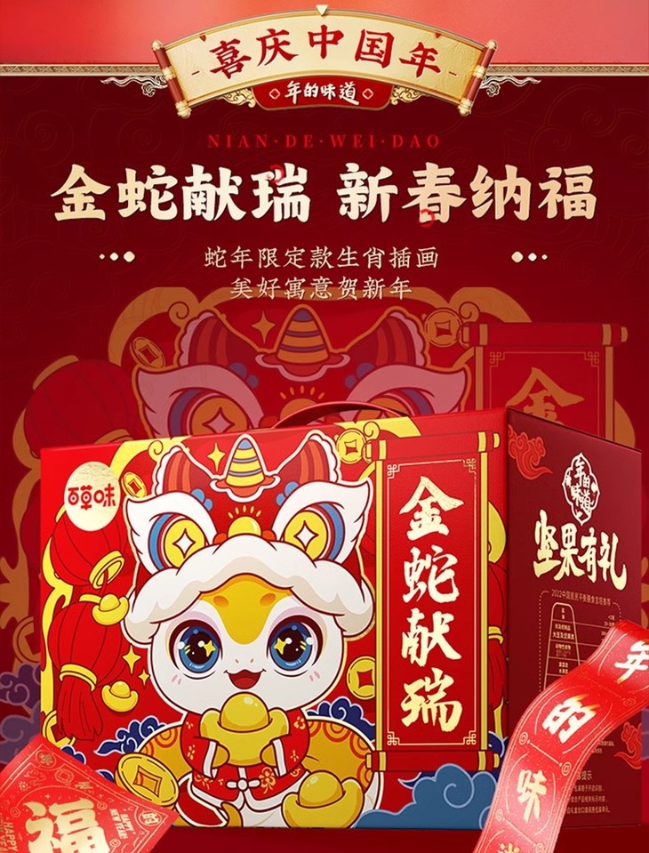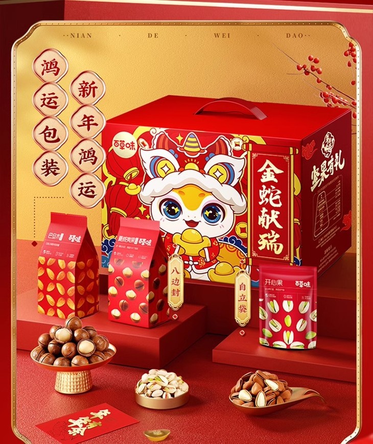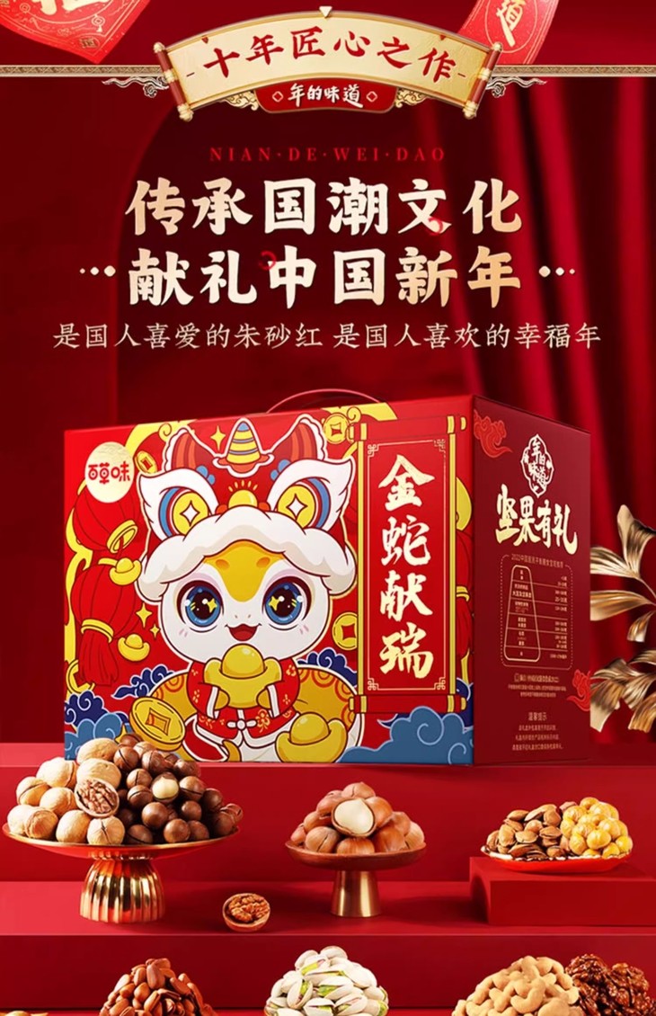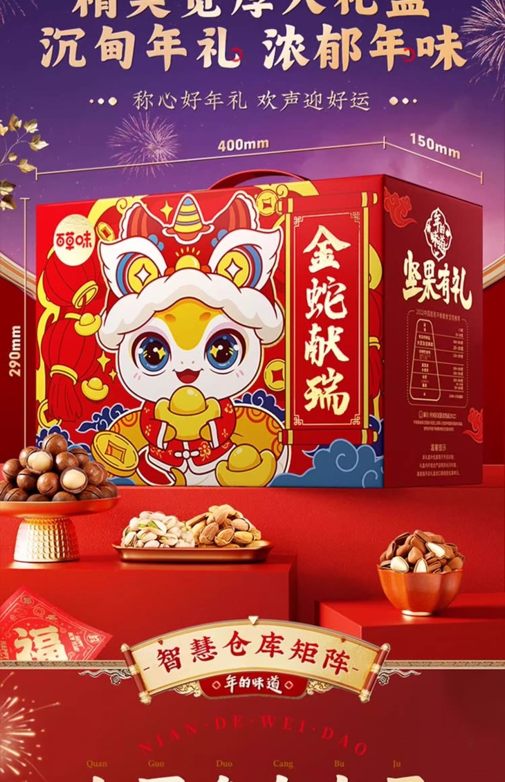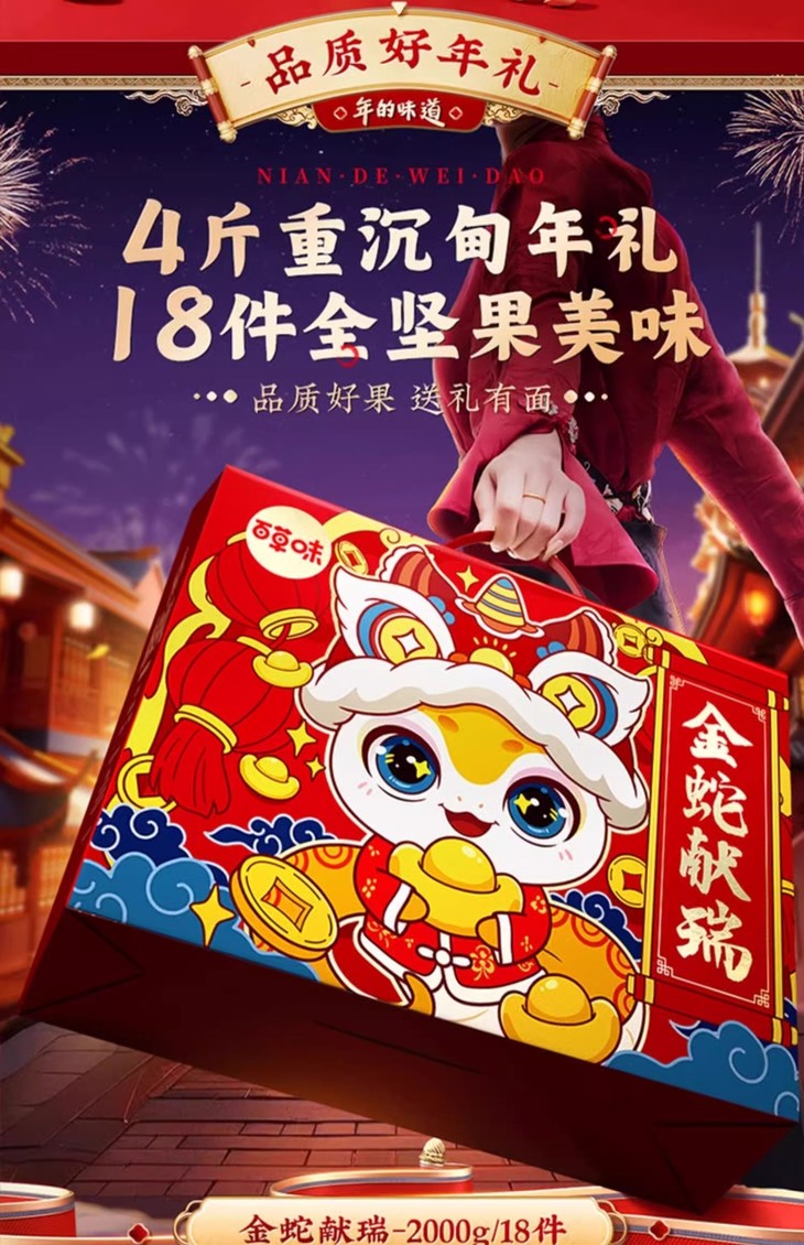 百草味坚果大礼包 【金蛇献瑞-生肖款-全坚果礼盒2000g18袋(豪华礼)】混合干果礼