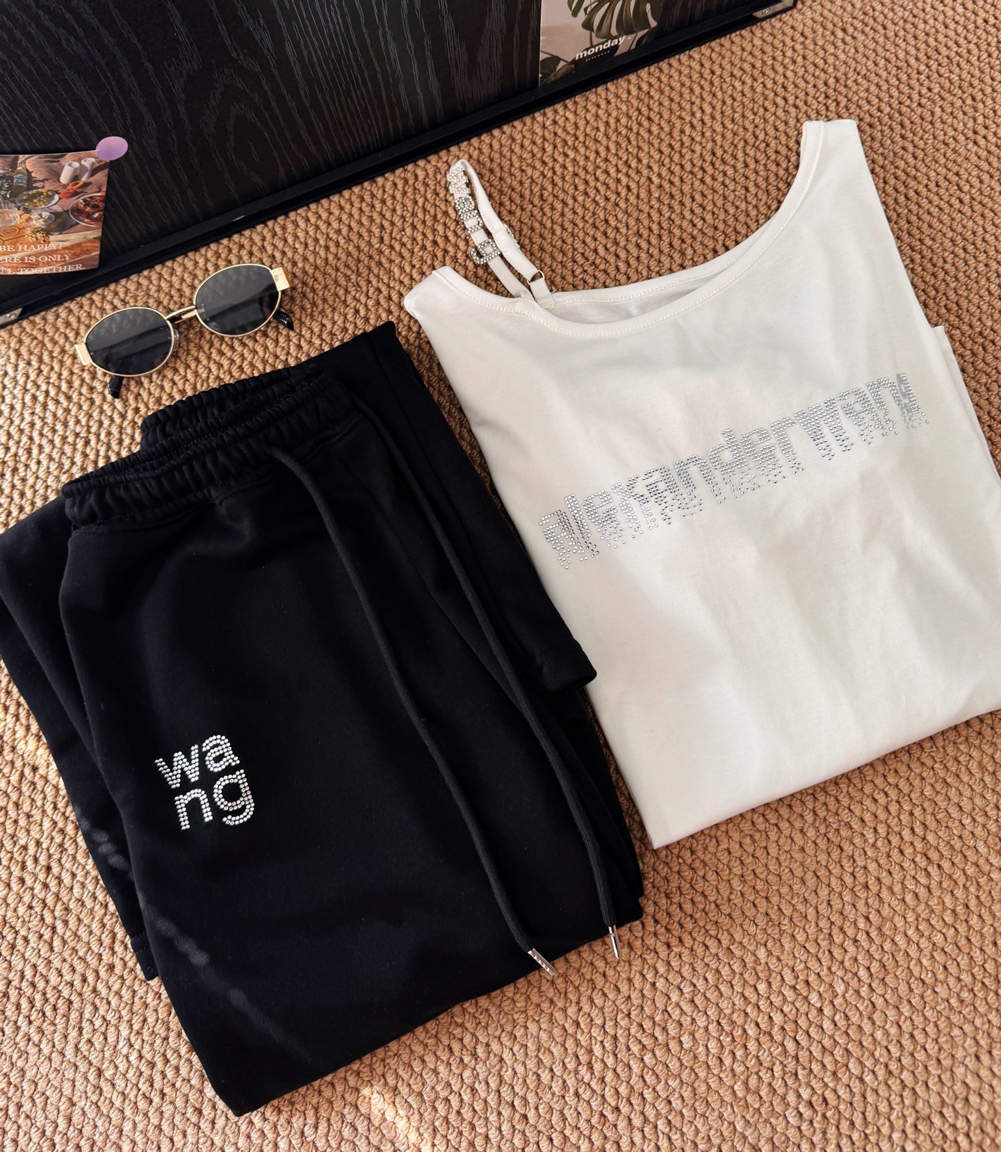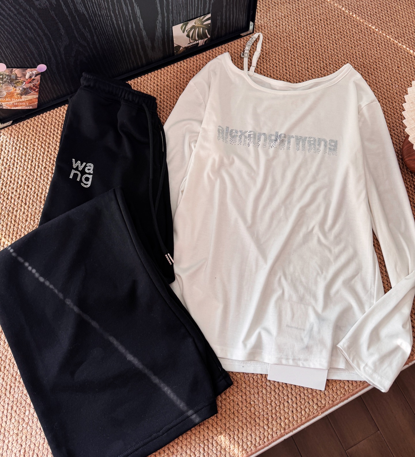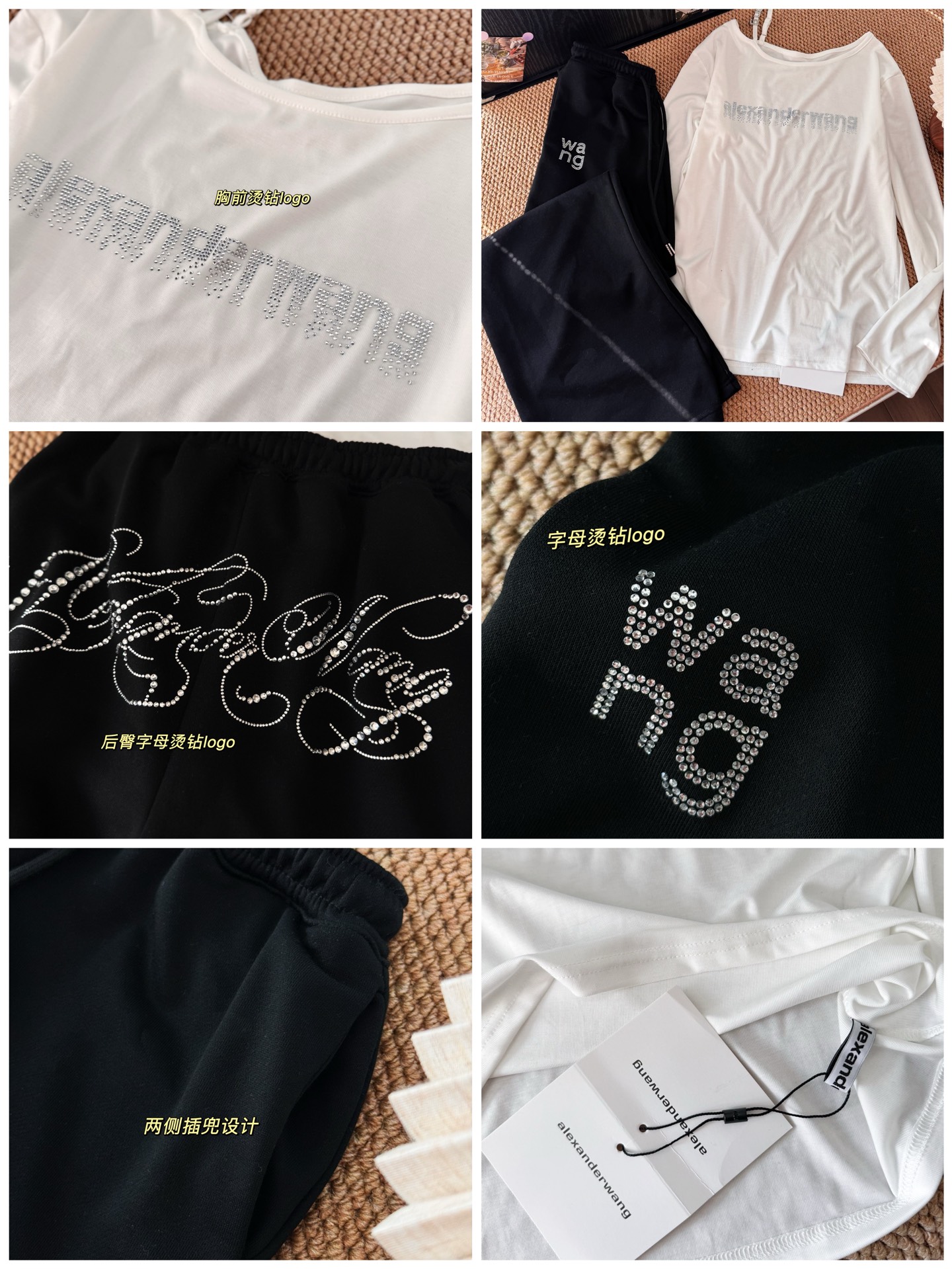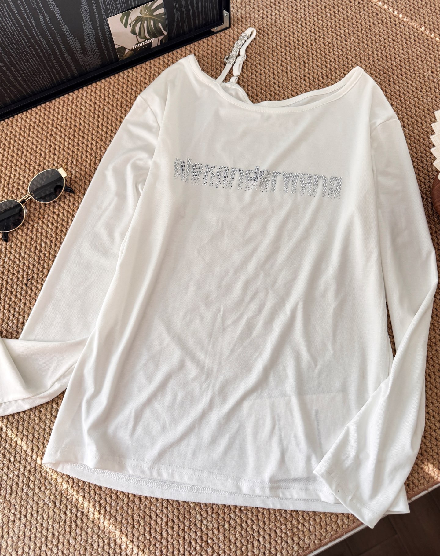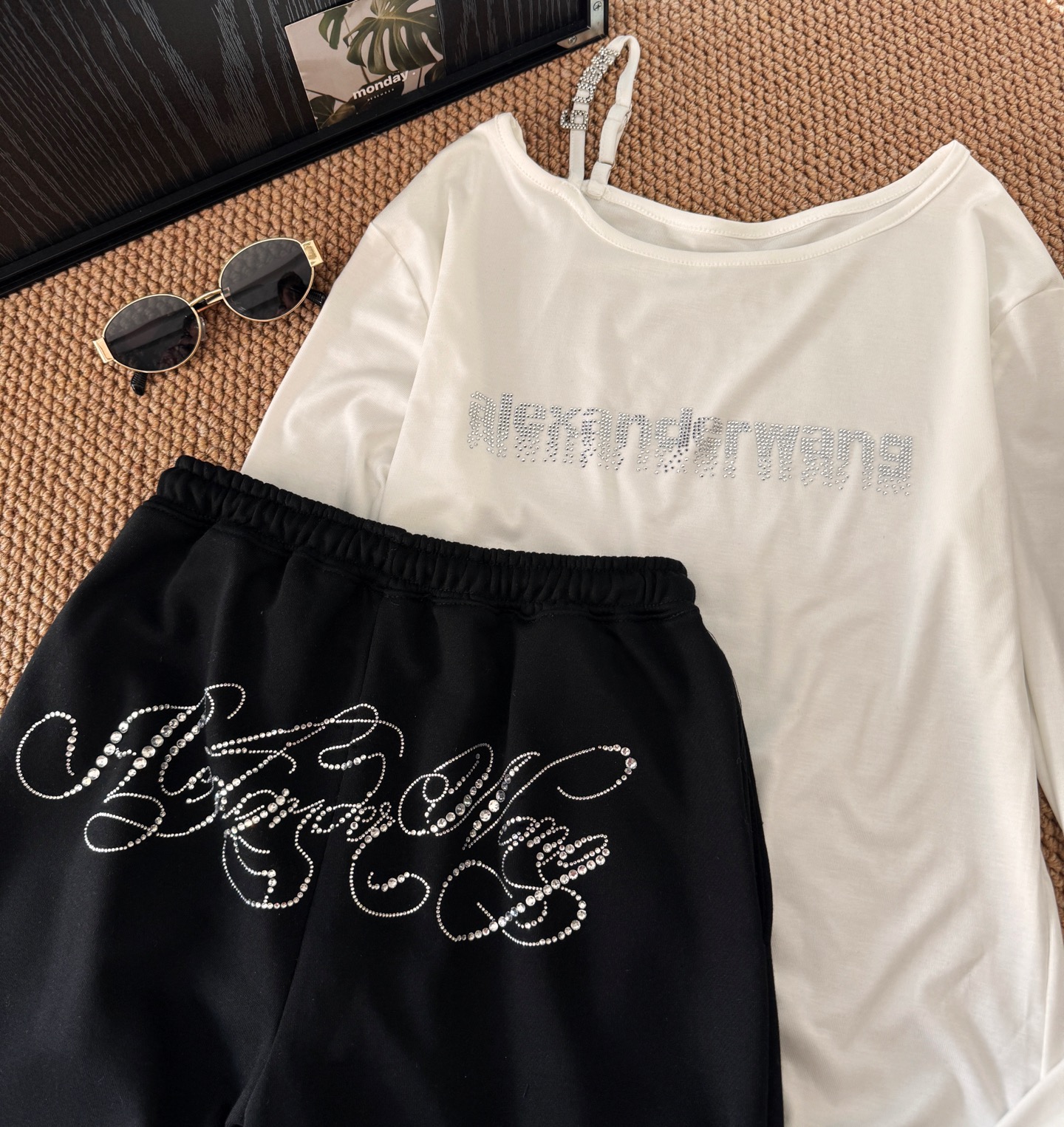160 货号140326160 LL ▪️品名:𝐀𝐥𝐞𝐱𝐚𝐧𝐝𝐞𝐫 𝐰𝐚𝐧*大王字母重工烫钻斜肩长袖休闲裤套装®