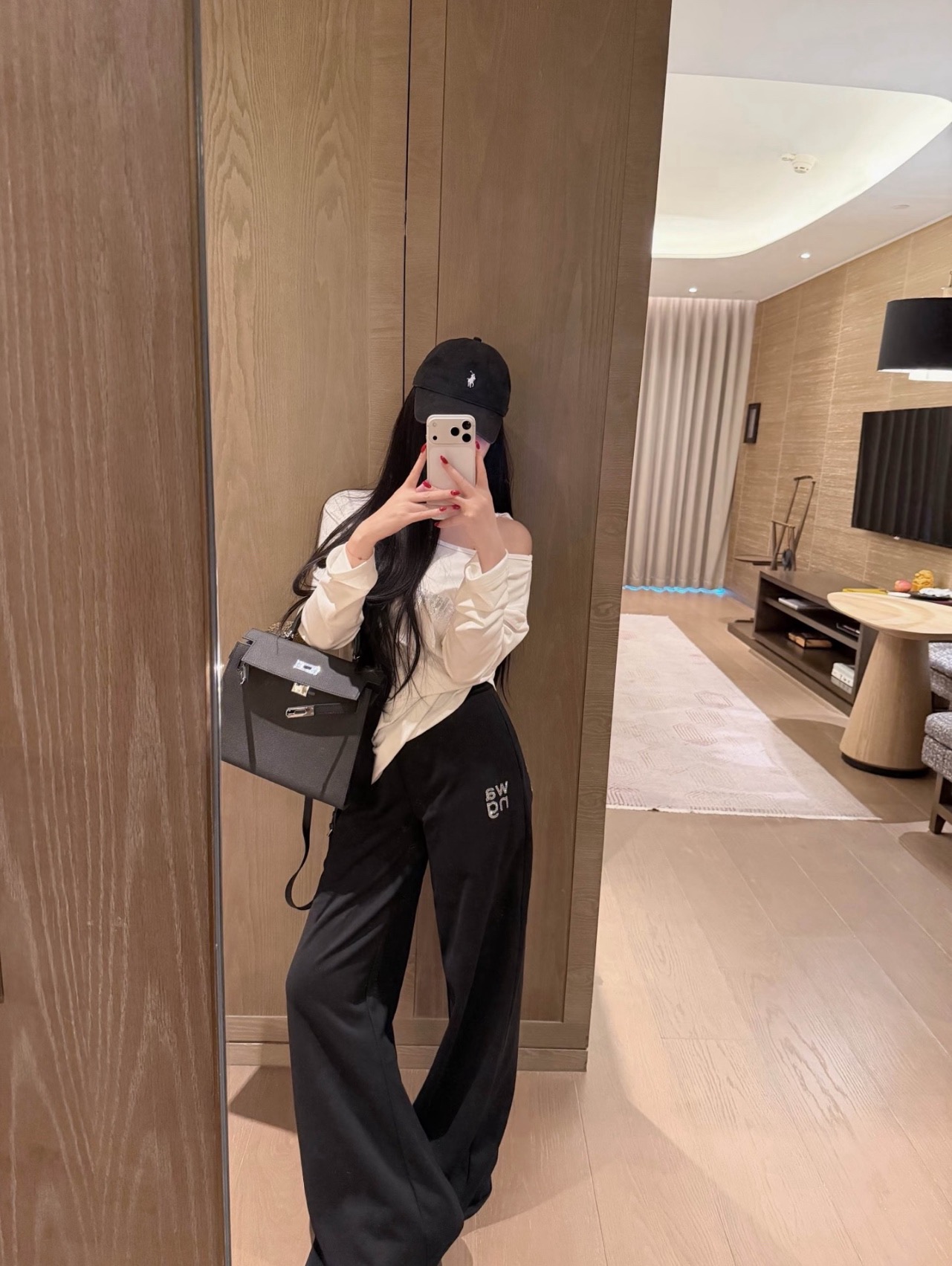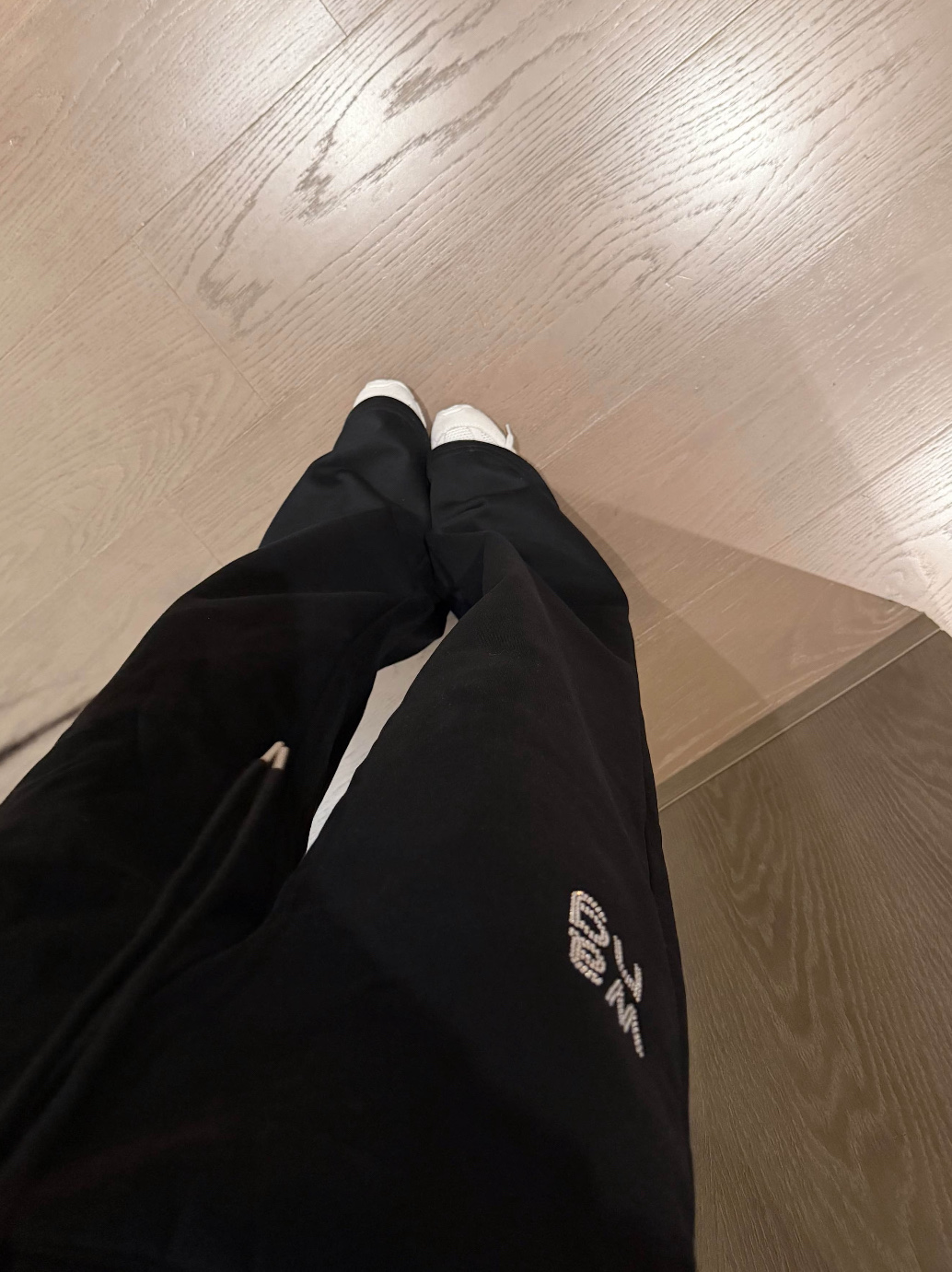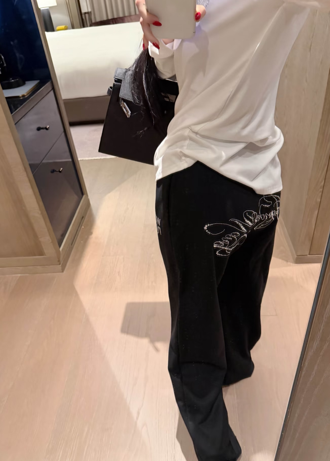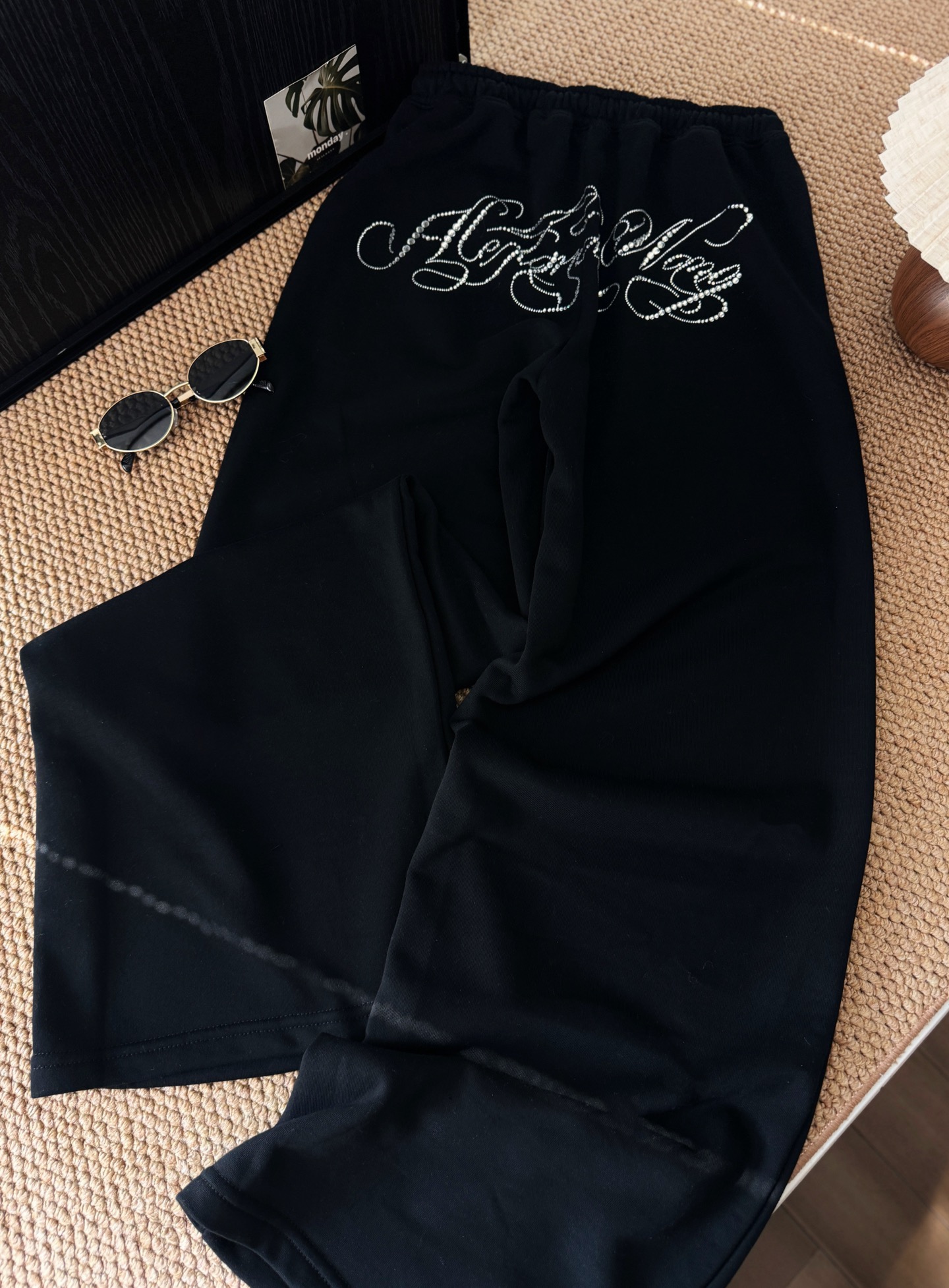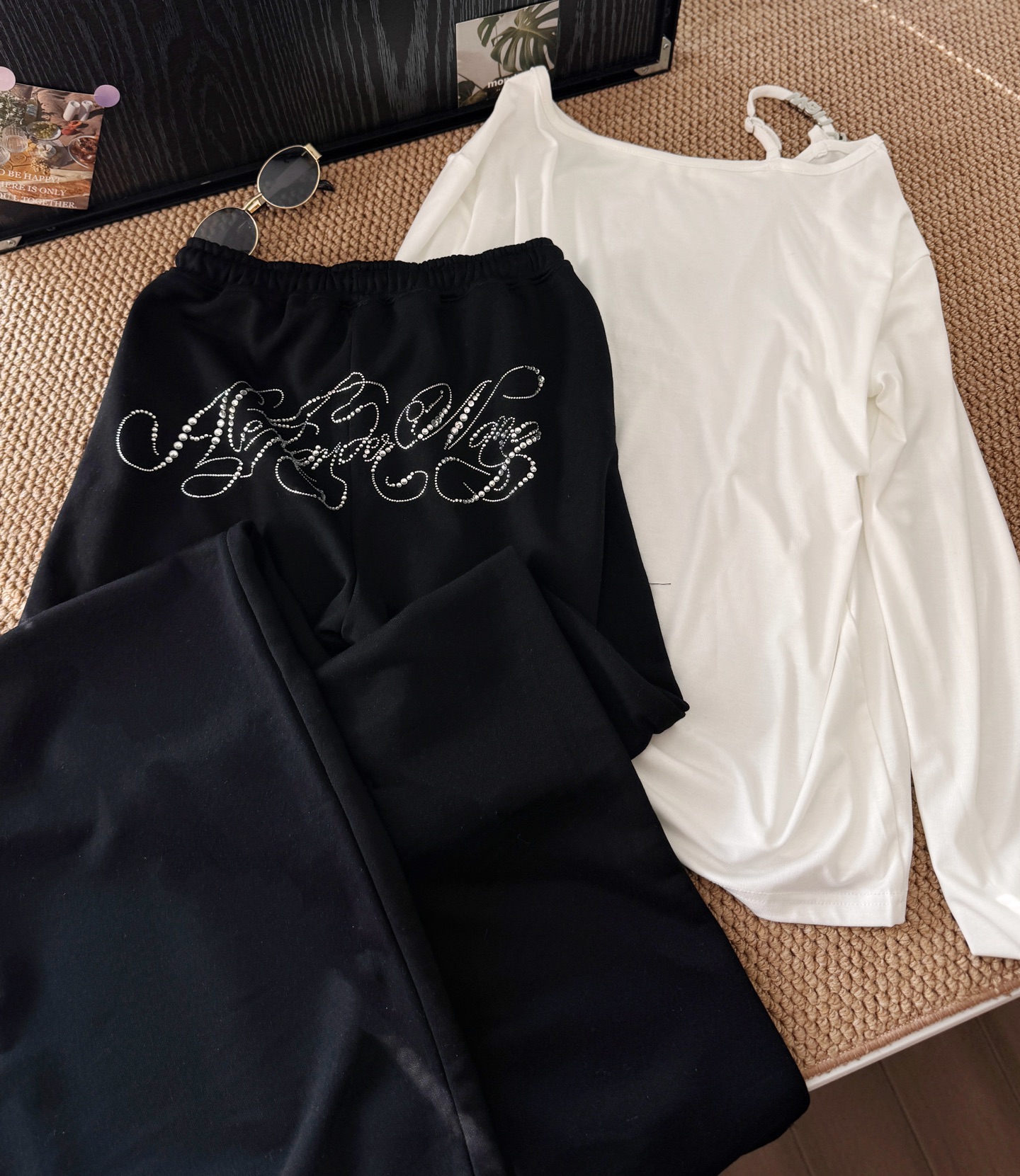 160 货号140326160 LL ▪️品名:𝐀𝐥𝐞𝐱𝐚𝐧𝐝𝐞𝐫 𝐰𝐚𝐧*大王字母重工烫钻斜肩长袖休闲裤套装®