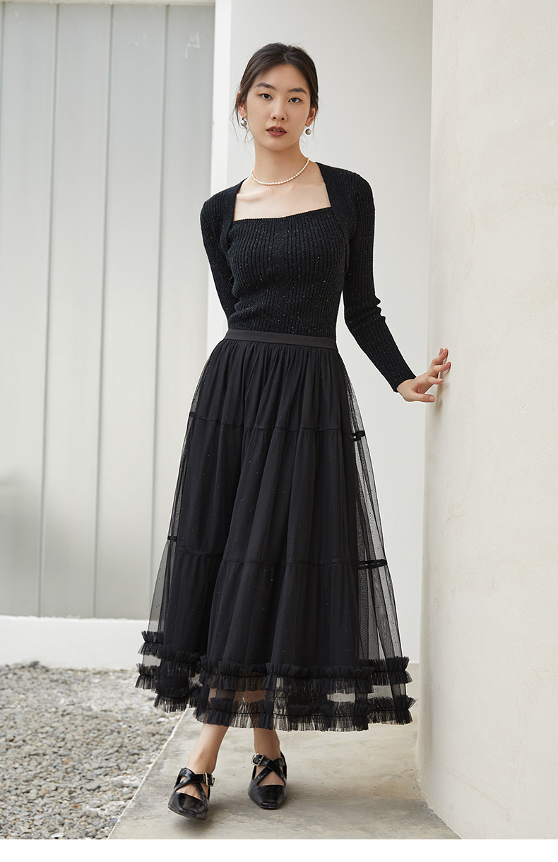 黑色亮丝假两件针织衫 方领修身长袖上衣 秋冬季辣妹风显瘦百搭叠穿打底毛衣