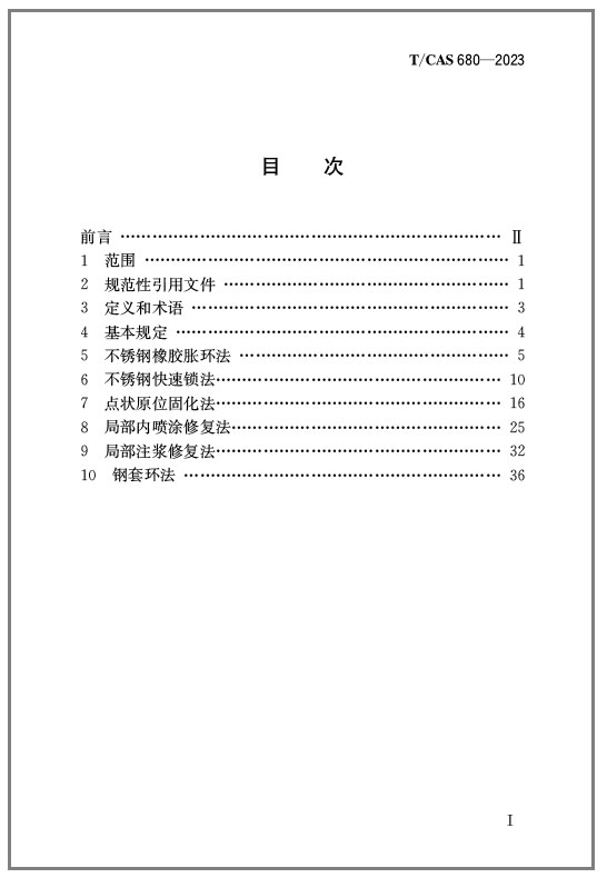 本文件规定了不锈钢橡胶胀环法、不锈钢快速锁法、点状原位固化法、局部内喷涂修复法、局部注浆修复法和钢套环法局部修复技术的基本要求。 本文件适用于排水管道局部修复的设计、施工及验收。 本文件不适用于排水管道的非开挖结构性修复、管道内局部插入较小管径或严重影响过流能力的局部修复施工。 本标准依据 T/CAS 1.1—2017《团体标准的结构和编写指南》编写。 本标准起草单位:北京北排建设有限公司,北京焕发管道修复有限公司,上海善治环境技术有限公司,上海誉帆环境科技股份有限公司,武汉中仪物联技术股份有限公司,北京华宇航市政建设工程有限公司等