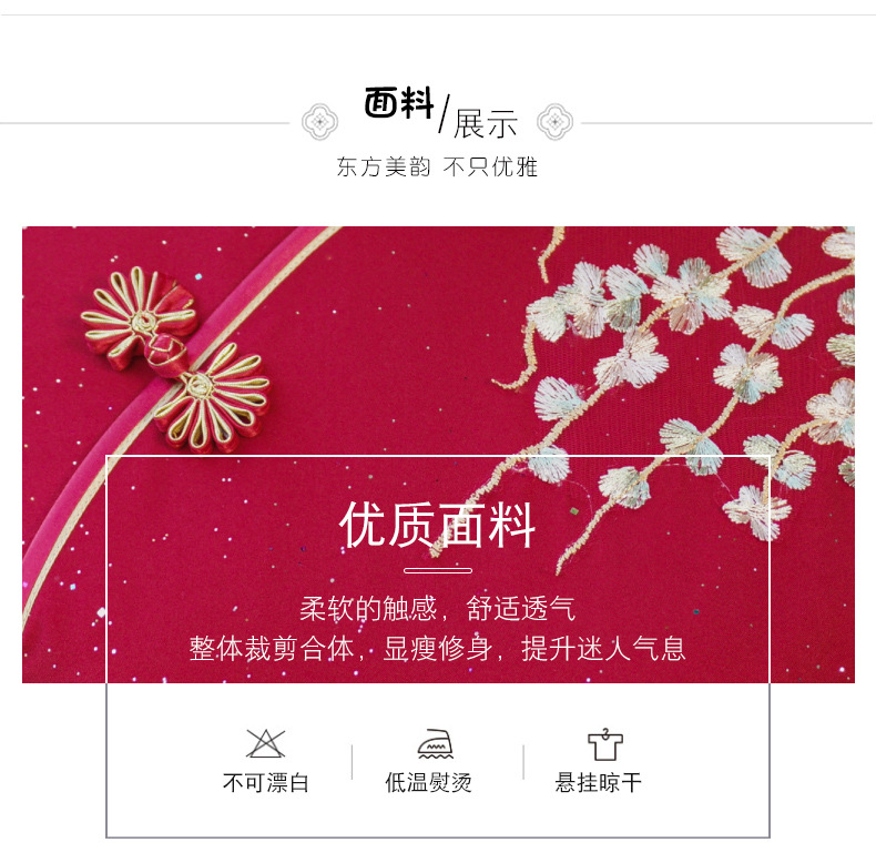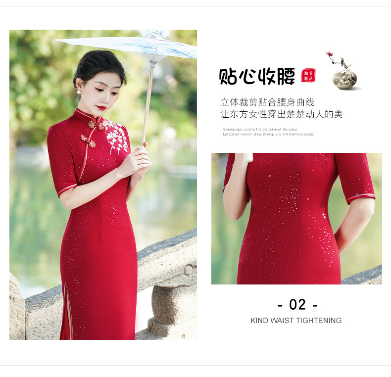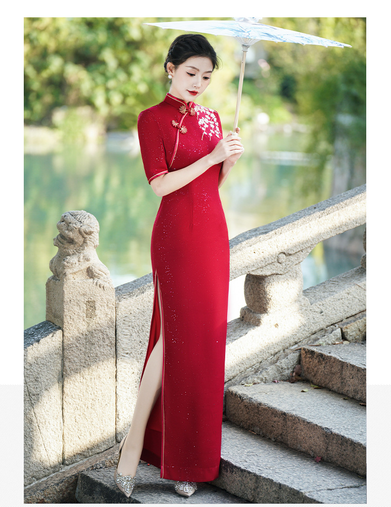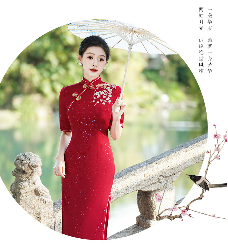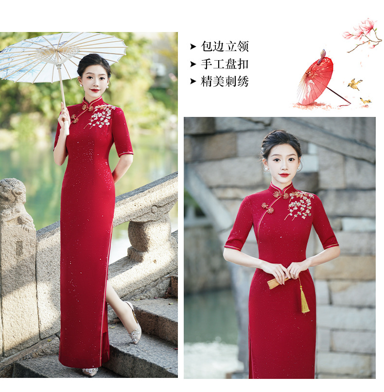 红色走秀旗袍2025舞台演出表演走秀礼仪主持人婚纱礼服旗袍秋季款