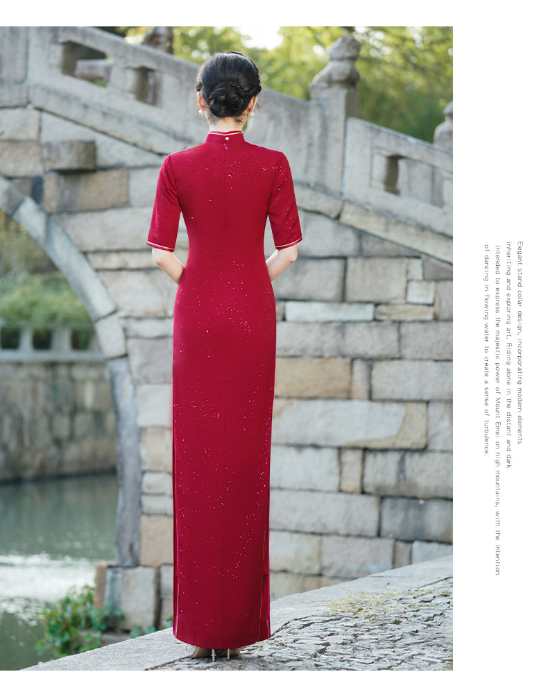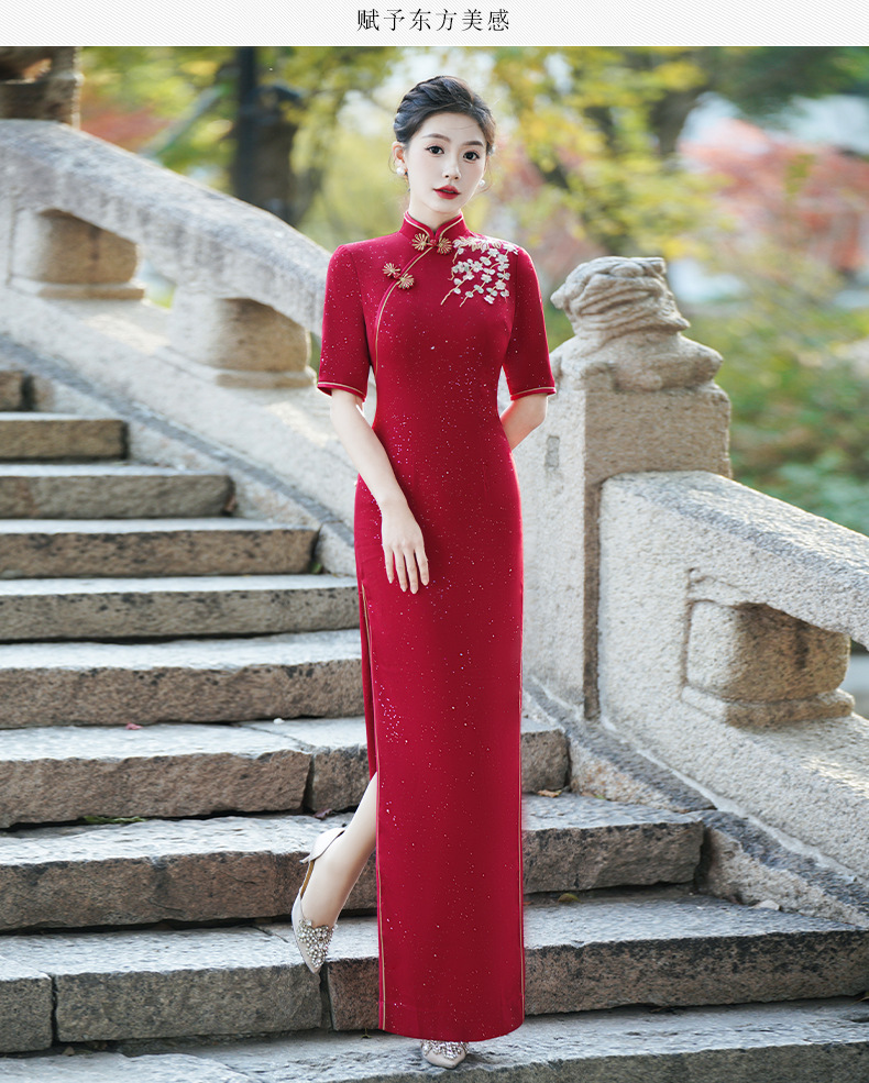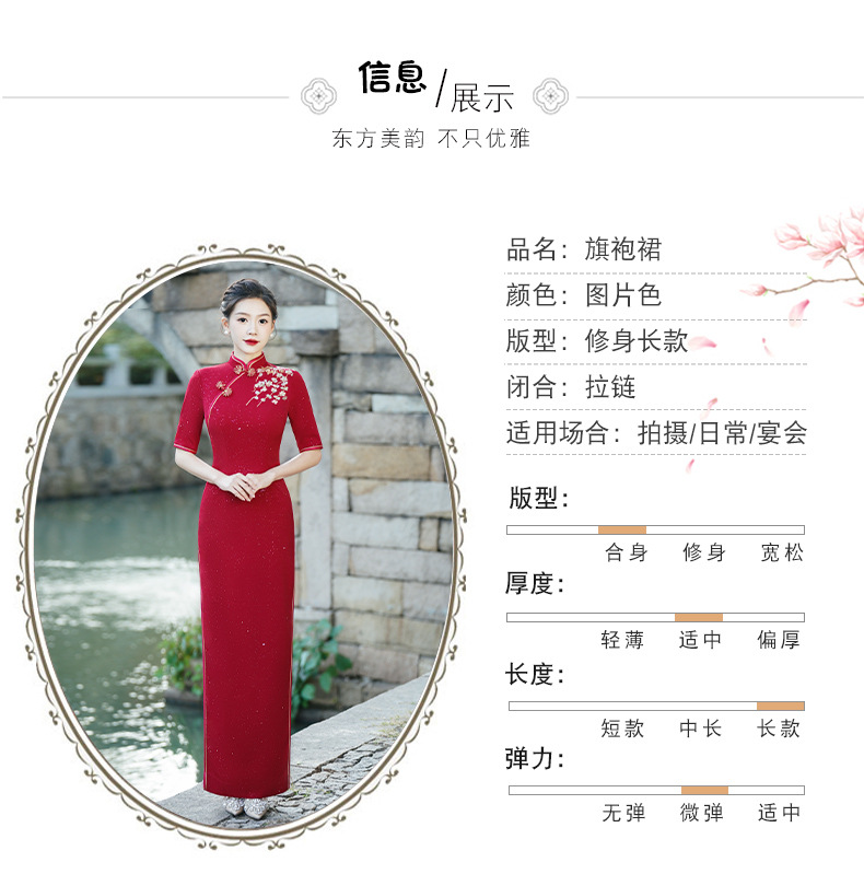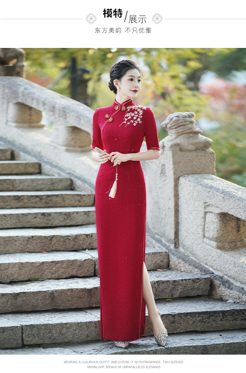 红色走秀旗袍2025舞台演出表演走秀礼仪主持人婚纱礼服旗袍秋季款