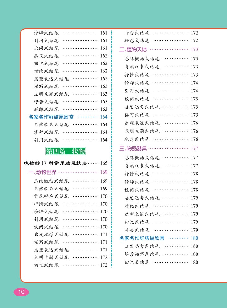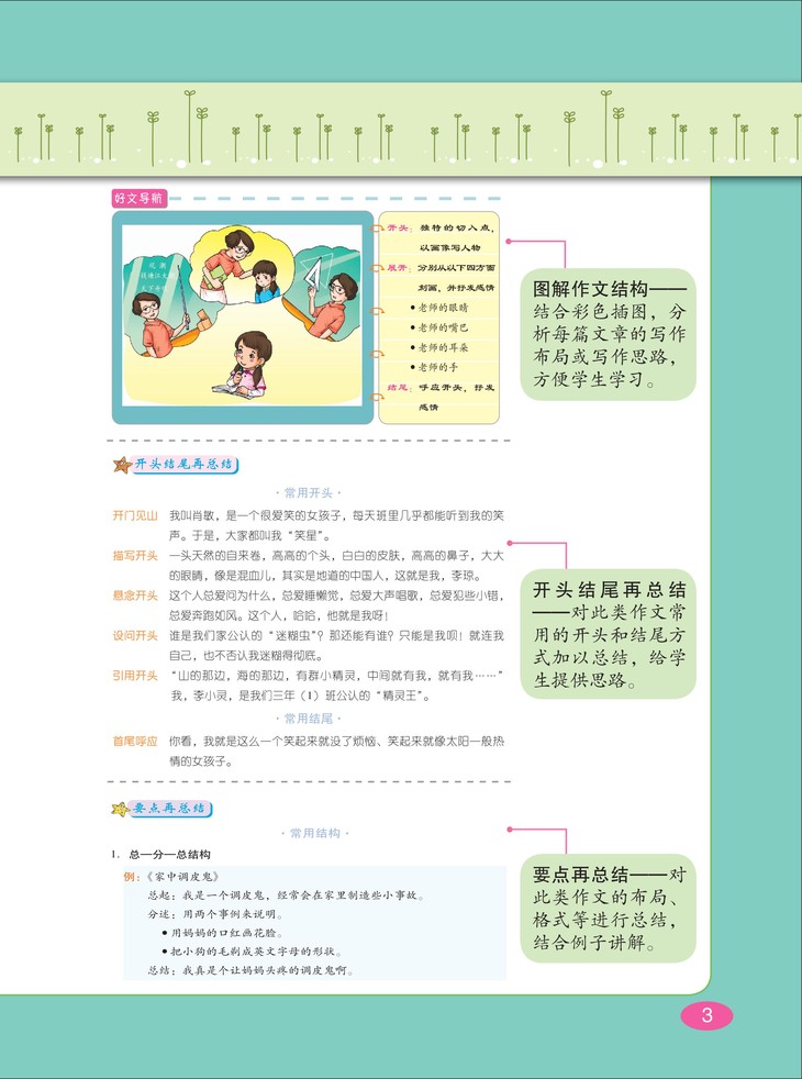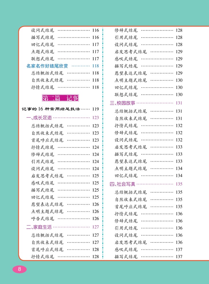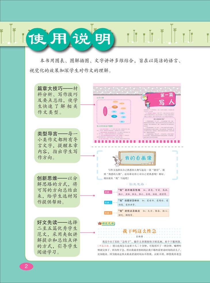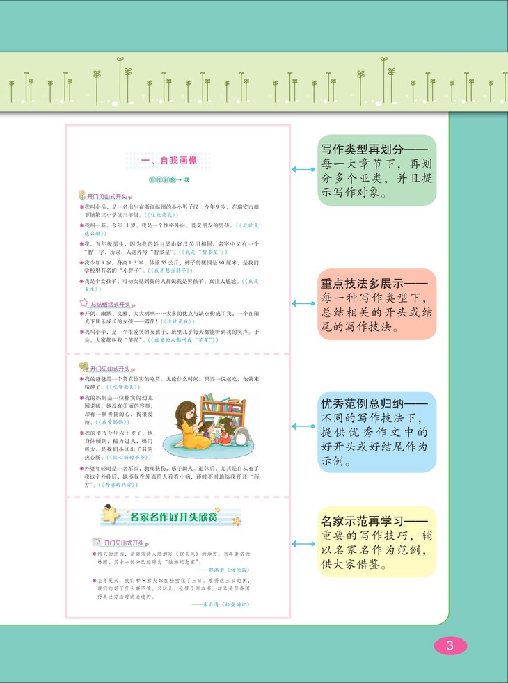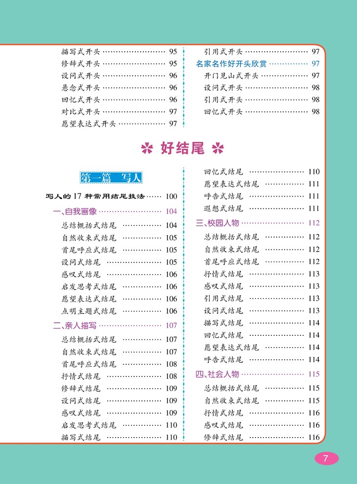 针对各类写作对象进行技法总结,大量优秀作文、名家名作的好开头与好结尾示