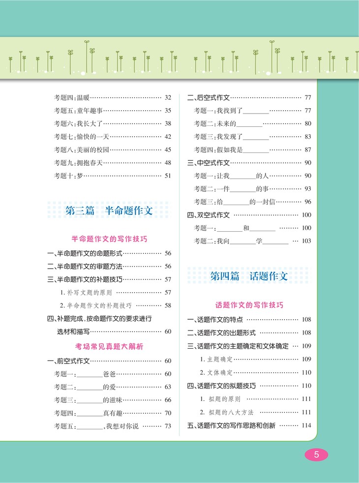 针对小学生语文考试中的作文题型进行分类讲解和示范。小学语文考试,尤其小升初的考试中,常见的是四大作文类型,即命题作文、半命题作文、话题作文和材料作文。本书根据这些作文类型的出题形式,讲解相应的应考写作技能,归纳常见的考场真题类型,进行文题解析和思维引导,并选择优秀作文范本,供学生学习参考。