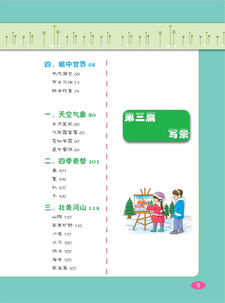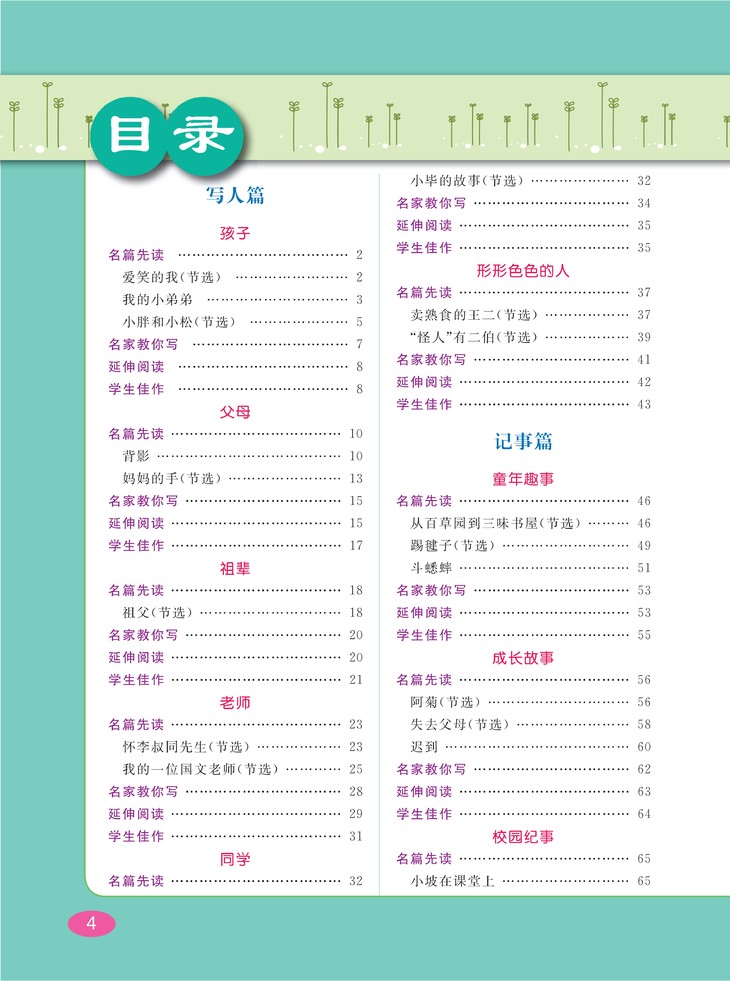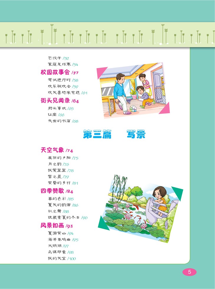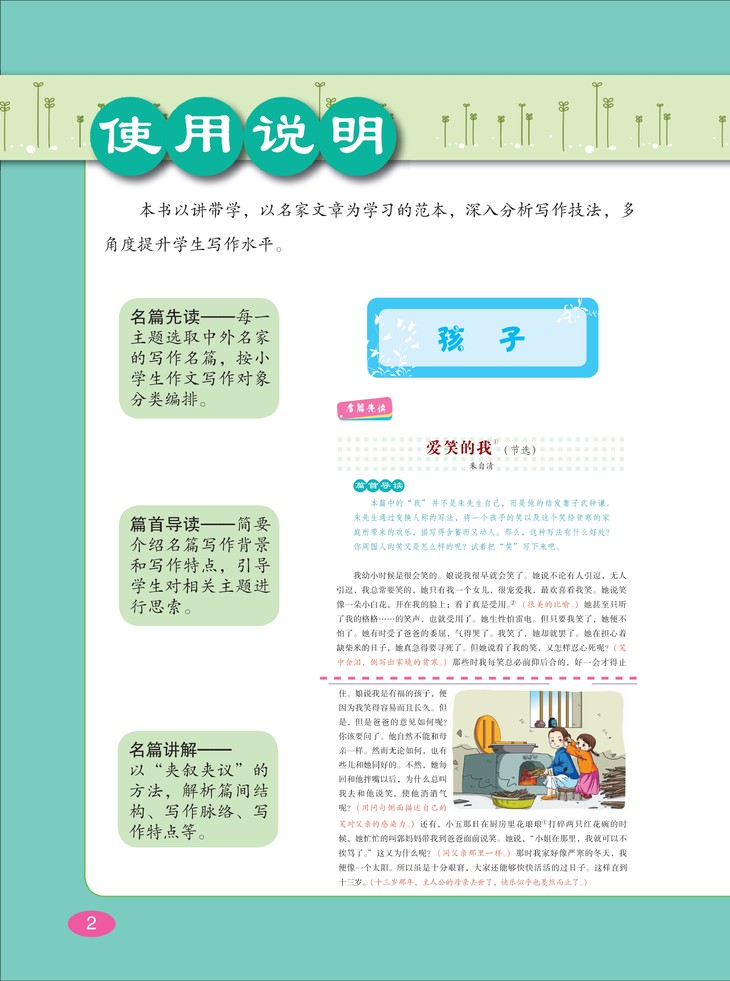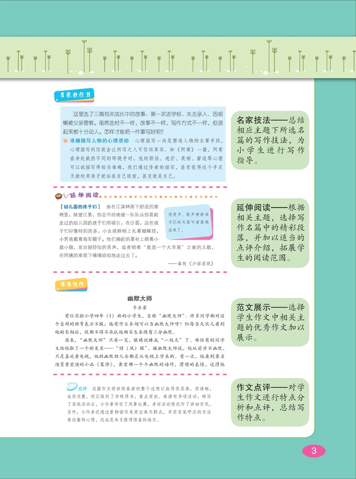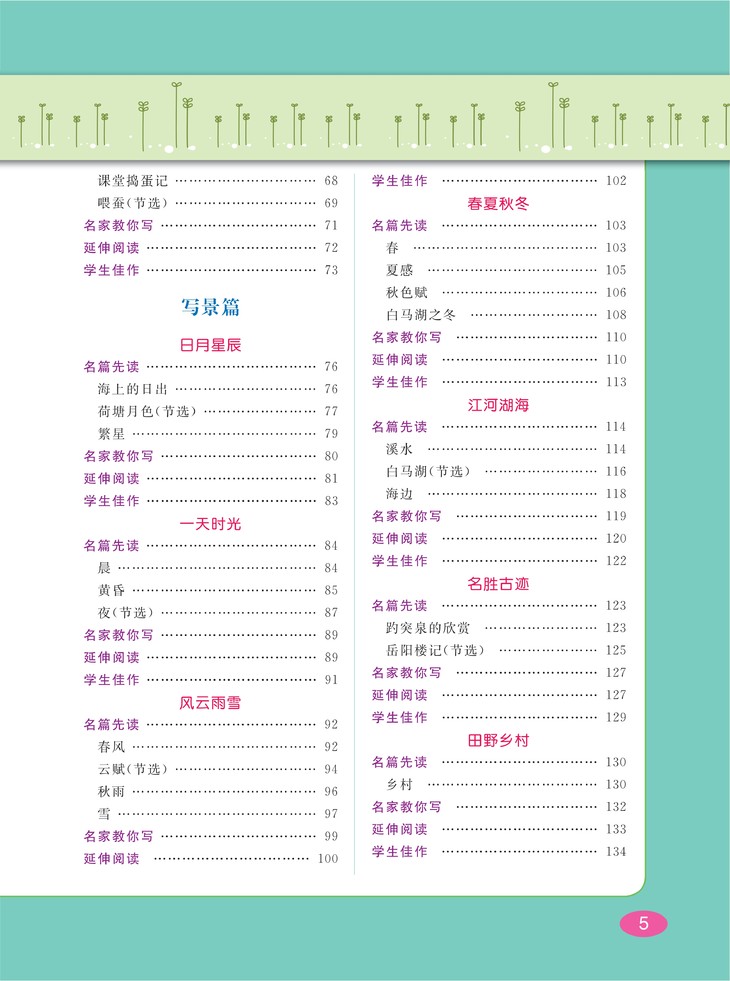 按写人、记事、写景、状物、应用等五个方面,选取老舍、巴金、叶圣陶、丰子恺、朱自清等数十位中外文学大师写作的经典篇章和经典段落加以讲解,并从中提炼出相关主题的写作技法,有利于提升小学生的写作水平和阅读鉴赏水平。需要说明的是,书中所选文章遵从原作者行文用字的习惯,不作改动,以保持原作风貌,所以有些汉字或标点的用法与当今的汉字规范有所不同,这点需要小读者们格外注意。