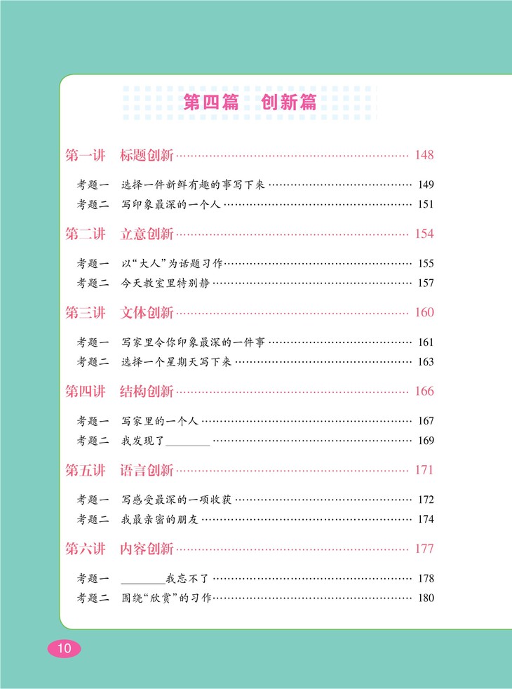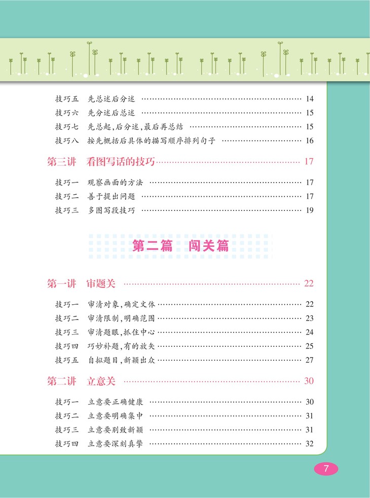 本书从小学生写作的技法入手,通过“基础篇”“闯关篇”“提升篇”“创新篇”等篇目讲解,从基础的写好句、写好段到作文如何审题、立意、布局等,结合实例,总结出各种实用的写作技巧;通过“病历档案”的解析,结合图解形式,提升各类型作文的写作技巧,并提供了多样化的写作创新思路,相信对小学生的写作大有帮助。