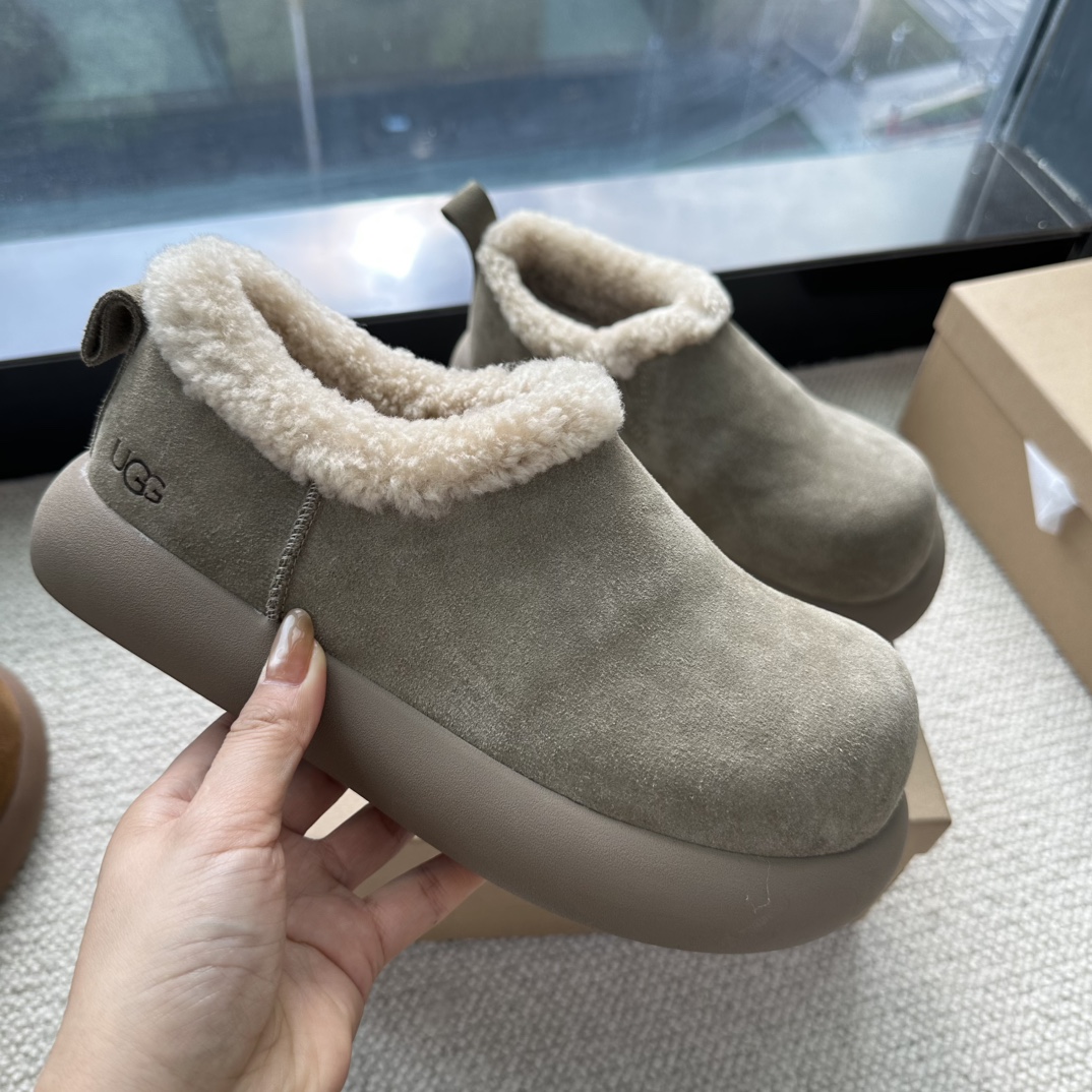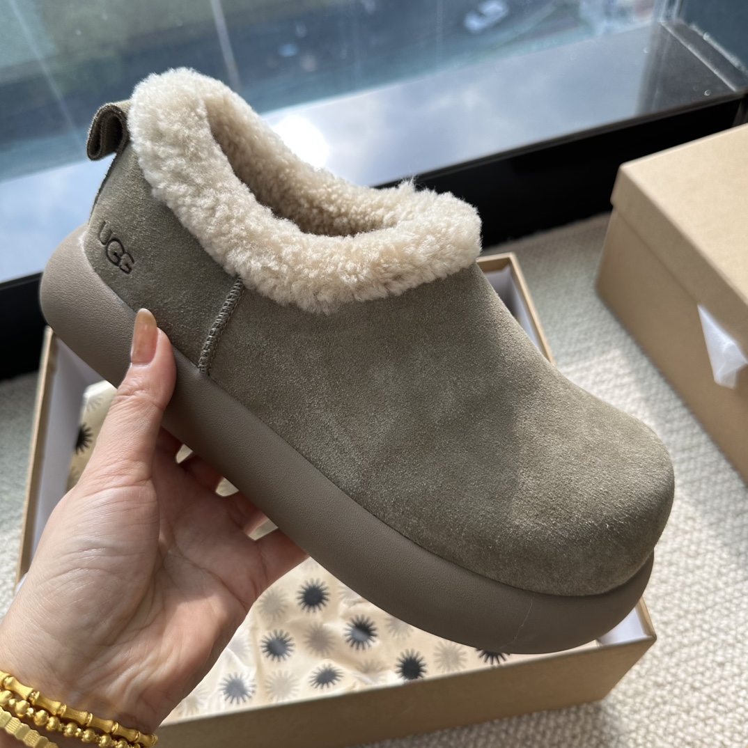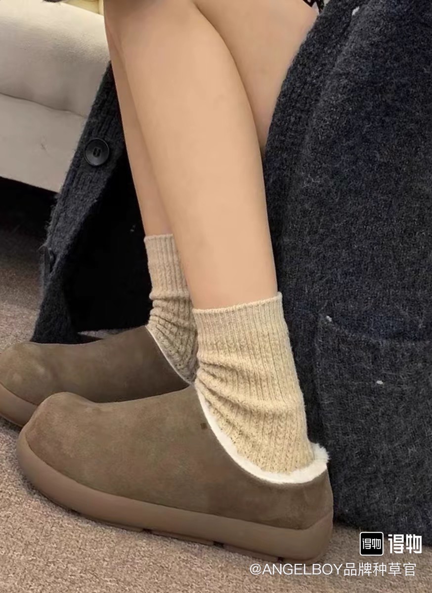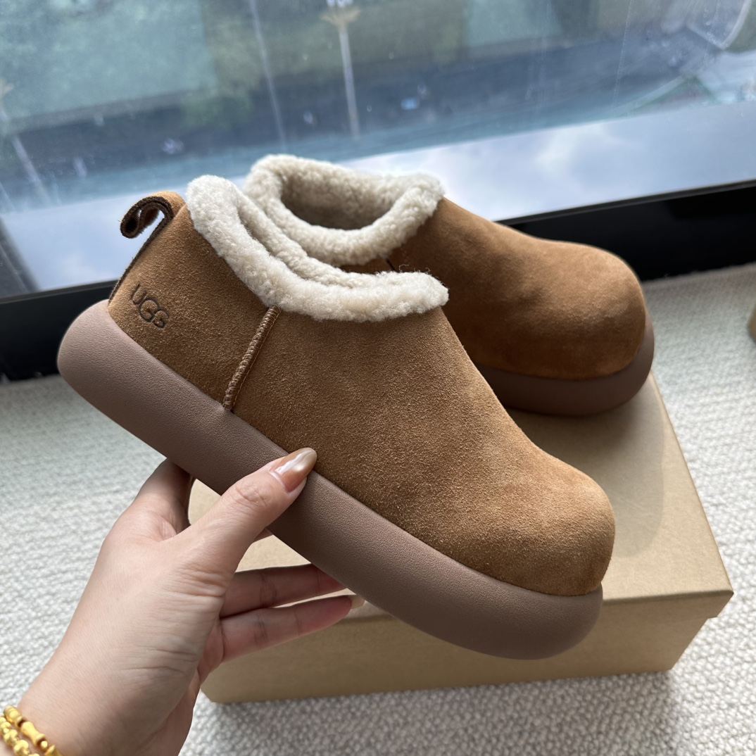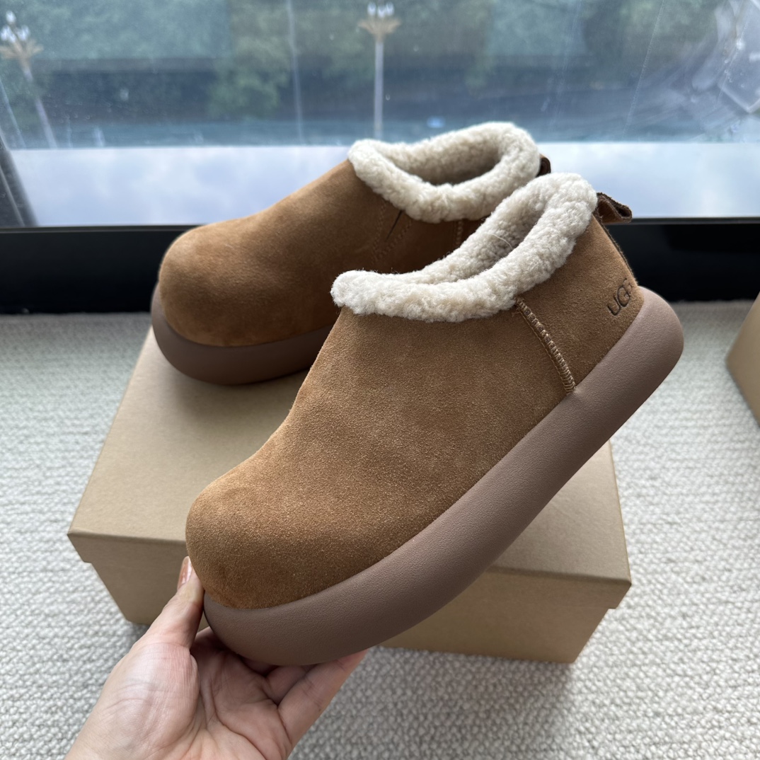 莞产‼️🔥油叽叽| ‼️ 增高厚底设计 小土豆。谁能想到一双棉拖能把舒适和时髦平衡得这么绝!UGG这波操作真的赢麻了~ 高级感拉满,内里的羊毛绒软乎乎的,踩进去像陷进云朵里,秋冬在家穿它,脚丫子再也不会冷冰冰~而且它的版型好特别,圆头厚底的设计,慵懒又随性,配堆堆袜出街也很有氛围感,直接拿捏住今年最火的“丑萌风”! 几个低饱和大地色都很百搭,不管是居家还是搭配卫衣、大衣,都能穿出不一样的风格,真的是秋冬宝藏单品没错了! 尺码:35 36 37 38 39 40 拍预定选项!✈️ 东莞发货
