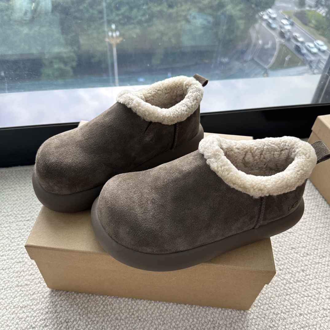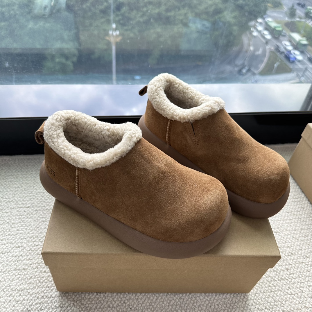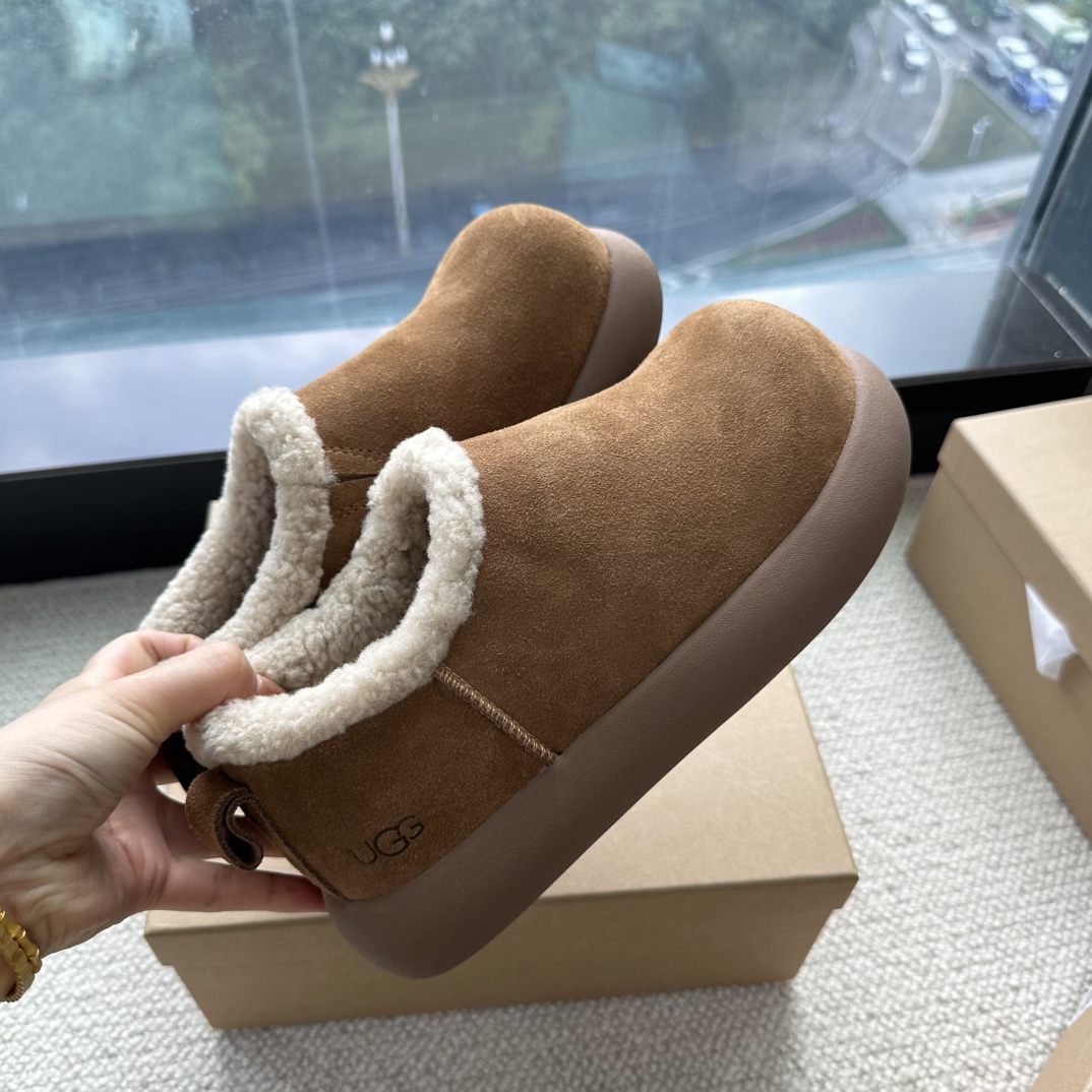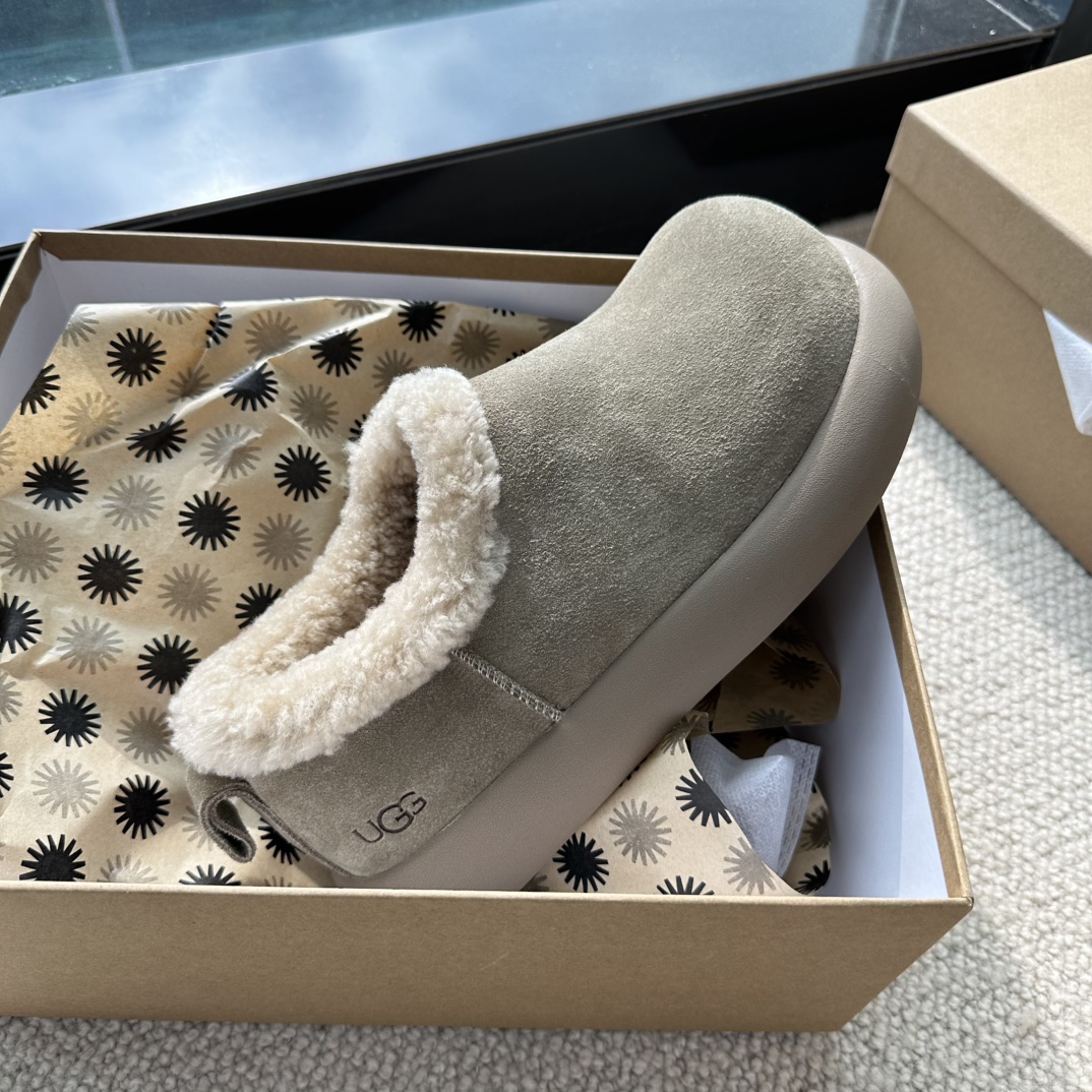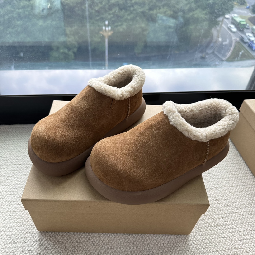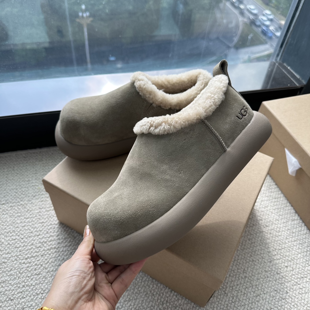 莞产‼️🔥油叽叽| ‼️ 增高厚底设计 小土豆。谁能想到一双棉拖能把舒适和时髦平衡得这么绝!UGG这波操作真的赢麻了~ 高级感拉满,内里的羊毛绒软乎乎的,踩进去像陷进云朵里,秋冬在家穿它,脚丫子再也不会冷冰冰~而且它的版型好特别,圆头厚底的设计,慵懒又随性,配堆堆袜出街也很有氛围感,直接拿捏住今年最火的“丑萌风”! 几个低饱和大地色都很百搭,不管是居家还是搭配卫衣、大衣,都能穿出不一样的风格,真的是秋冬宝藏单品没错了! 尺码:35 36 37 38 39 40 拍预定选项!✈️ 东莞发货