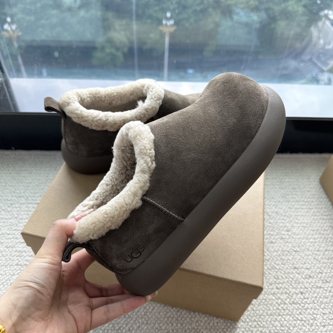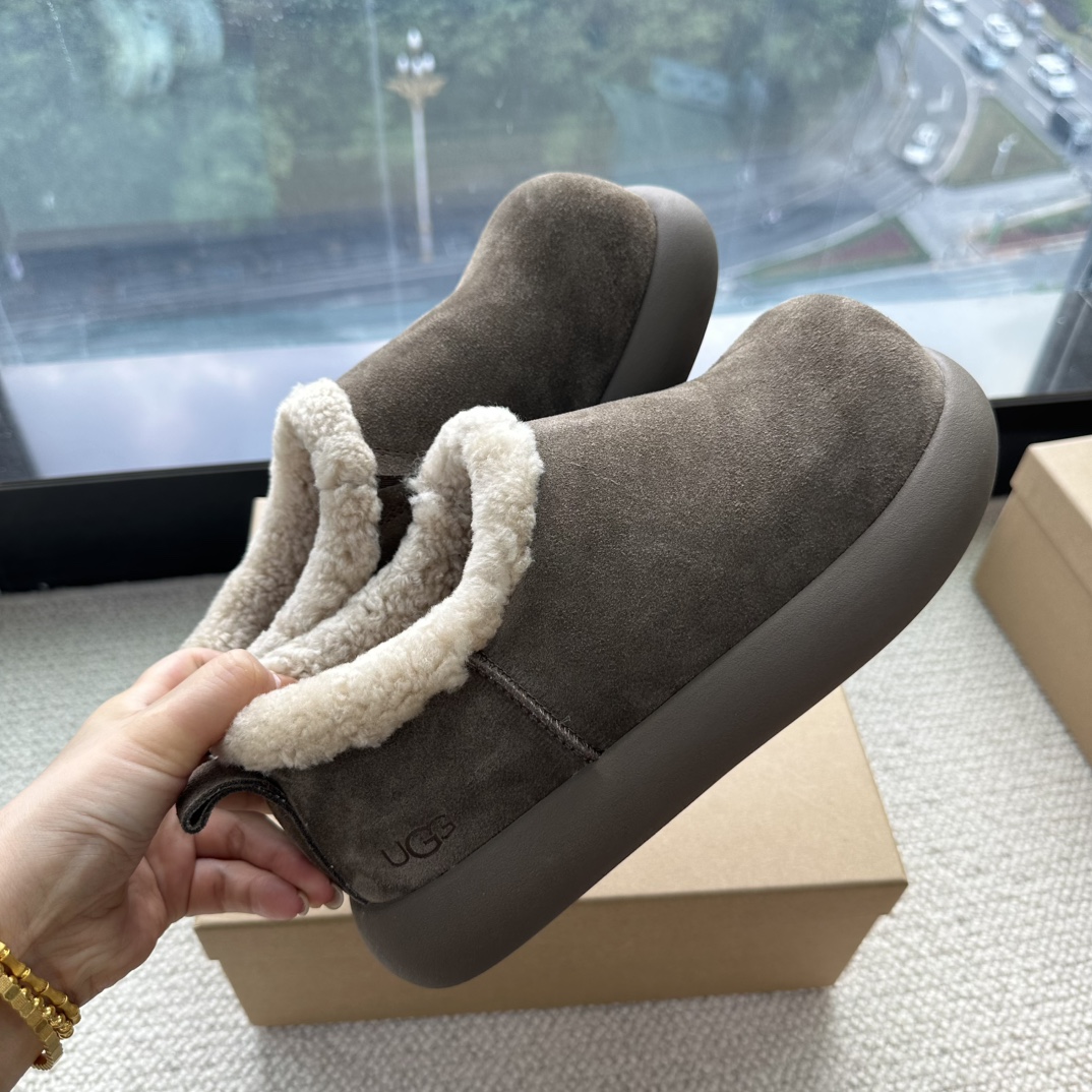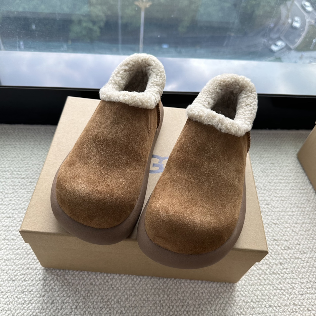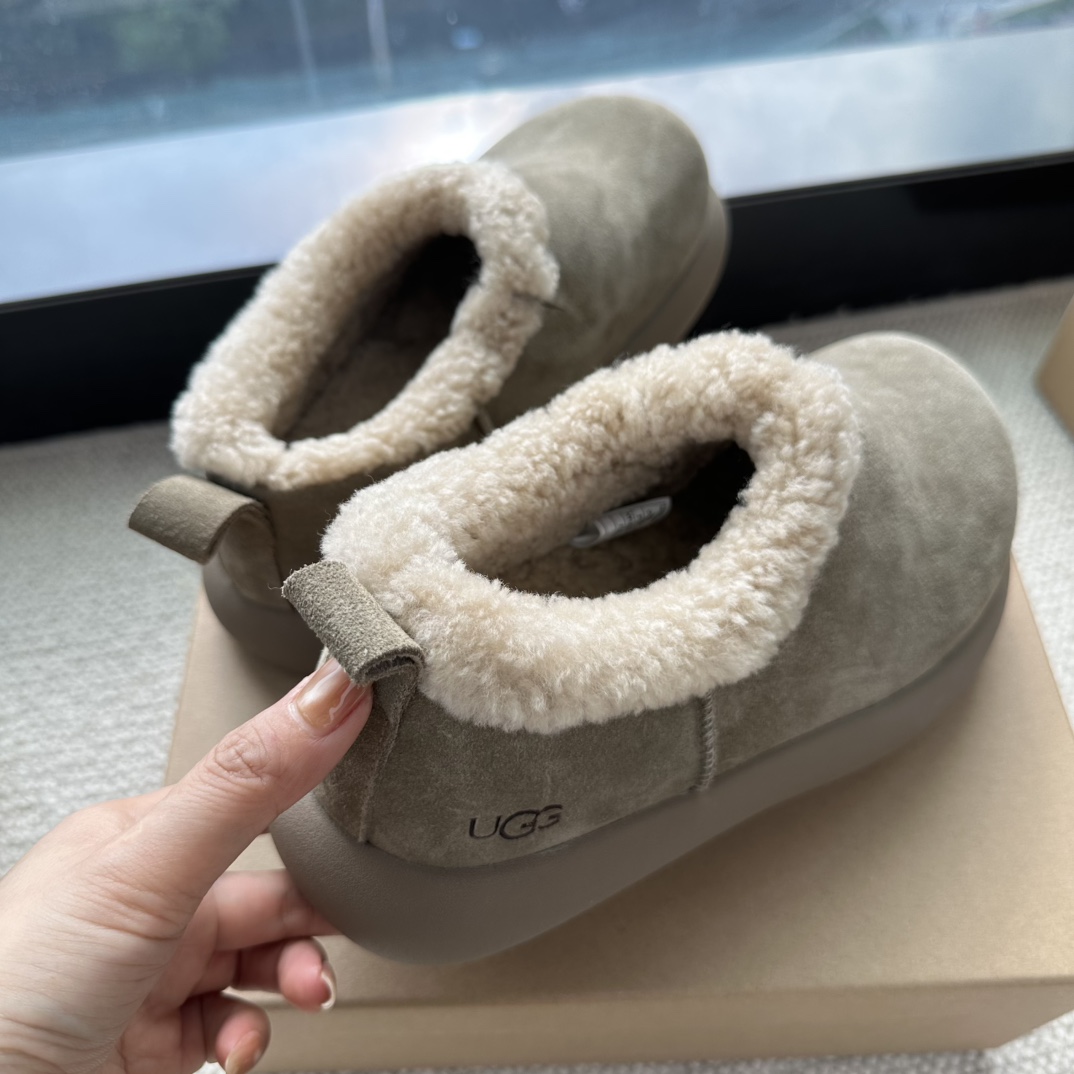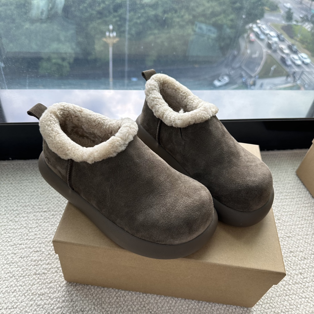 莞产‼️🔥油叽叽| ‼️ 增高厚底设计 小土豆。谁能想到一双棉拖能把舒适和时髦平衡得这么绝!UGG这波操作真的赢麻了~ 高级感拉满,内里的羊毛绒软乎乎的,踩进去像陷进云朵里,秋冬在家穿它,脚丫子再也不会冷冰冰~而且它的版型好特别,圆头厚底的设计,慵懒又随性,配堆堆袜出街也很有氛围感,直接拿捏住今年最火的“丑萌风”! 几个低饱和大地色都很百搭,不管是居家还是搭配卫衣、大衣,都能穿出不一样的风格,真的是秋冬宝藏单品没错了! 尺码:35 36 37 38 39 40 拍预定选项!✈️ 东莞发货