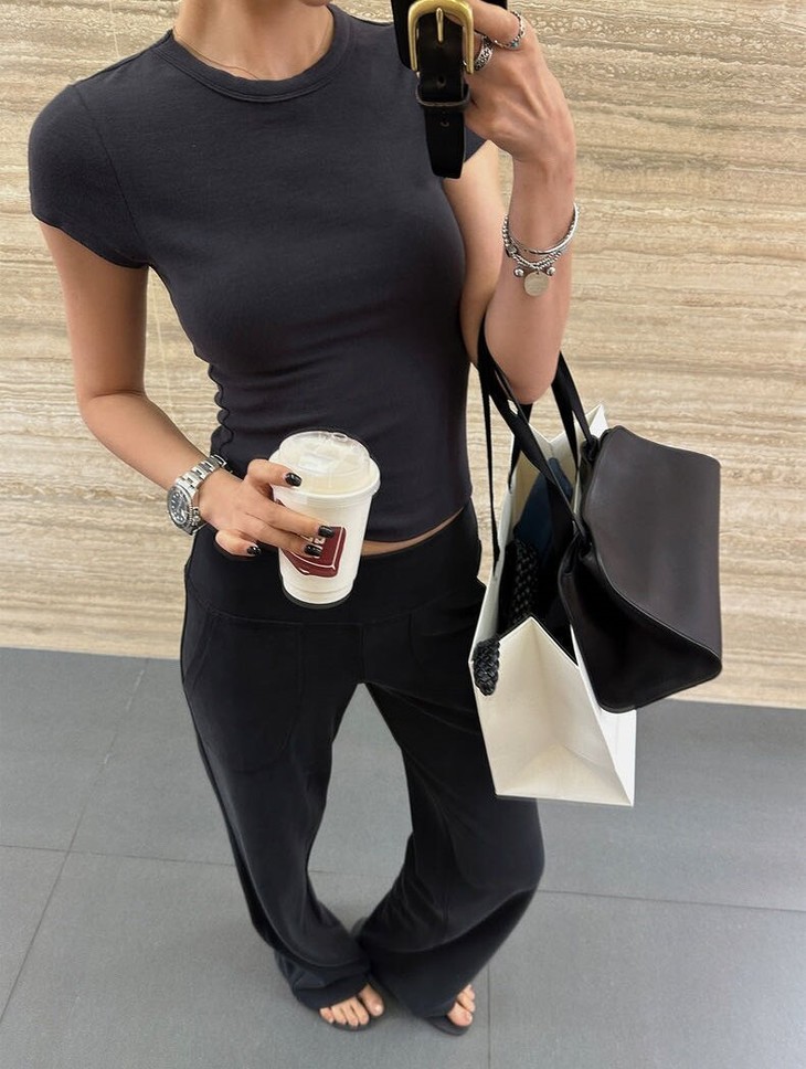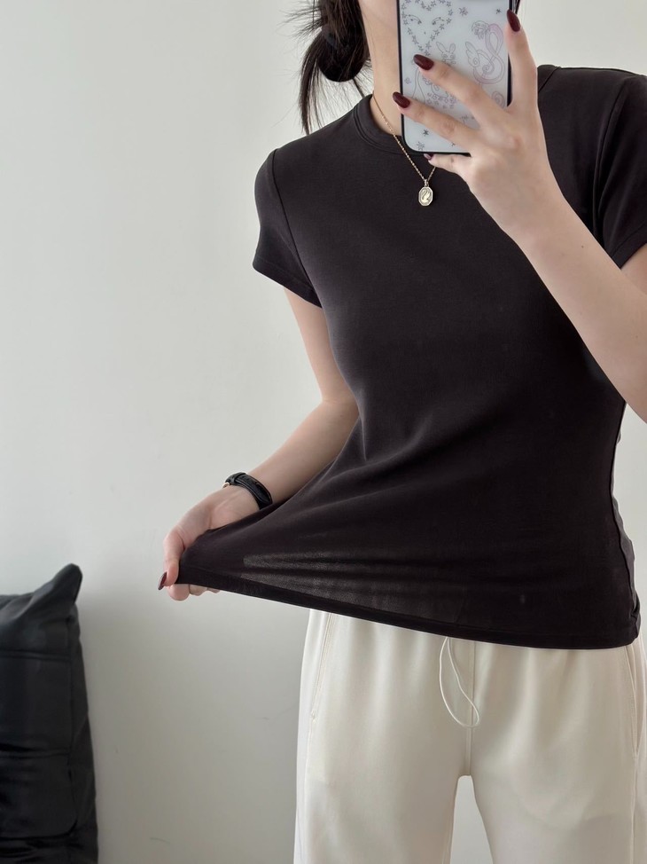Row风这件正肩膀T恤上身也太显瘦了 这款来自法式极简风百搭t恤 越基础越好看,弹力挺大的 属于那种高密回弹面料 📷模特身高163cm,体重98斤 试穿黑色M码
