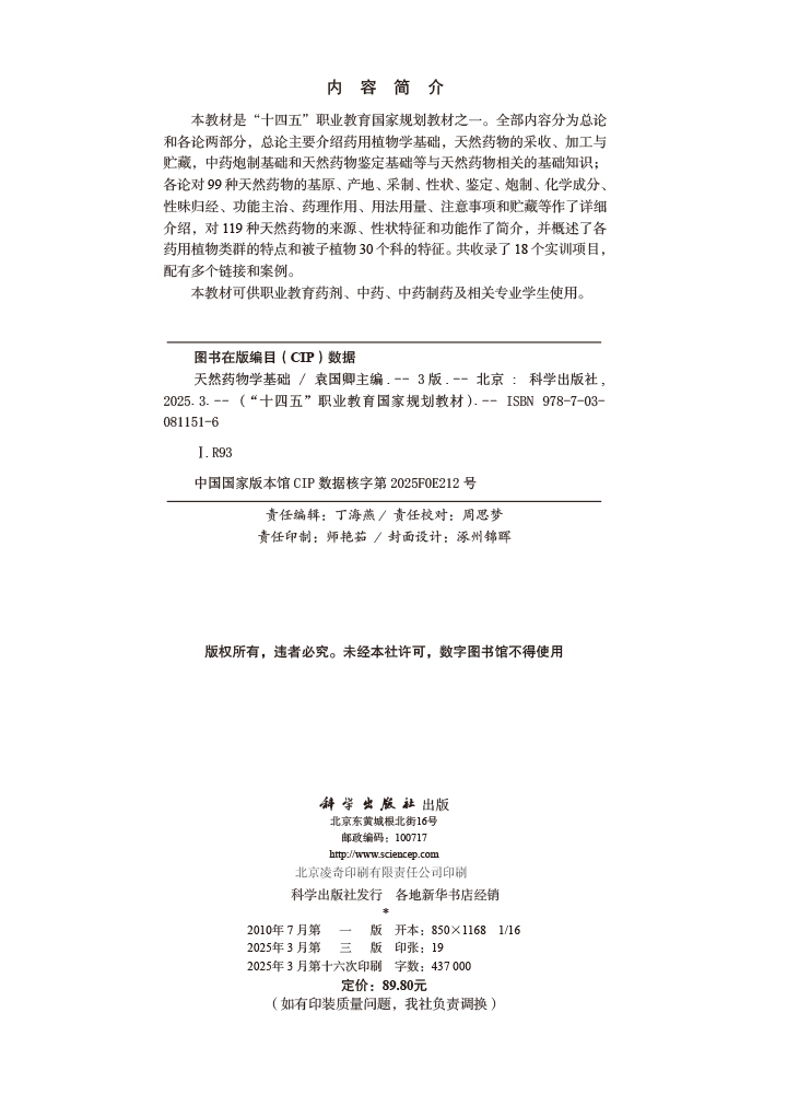 天然药物学基础 第3三版 职业教育新形态教材 袁国卿主编 供职业教育药剂 中药 中药制药及相关专业使用 9787030811516科学出版社