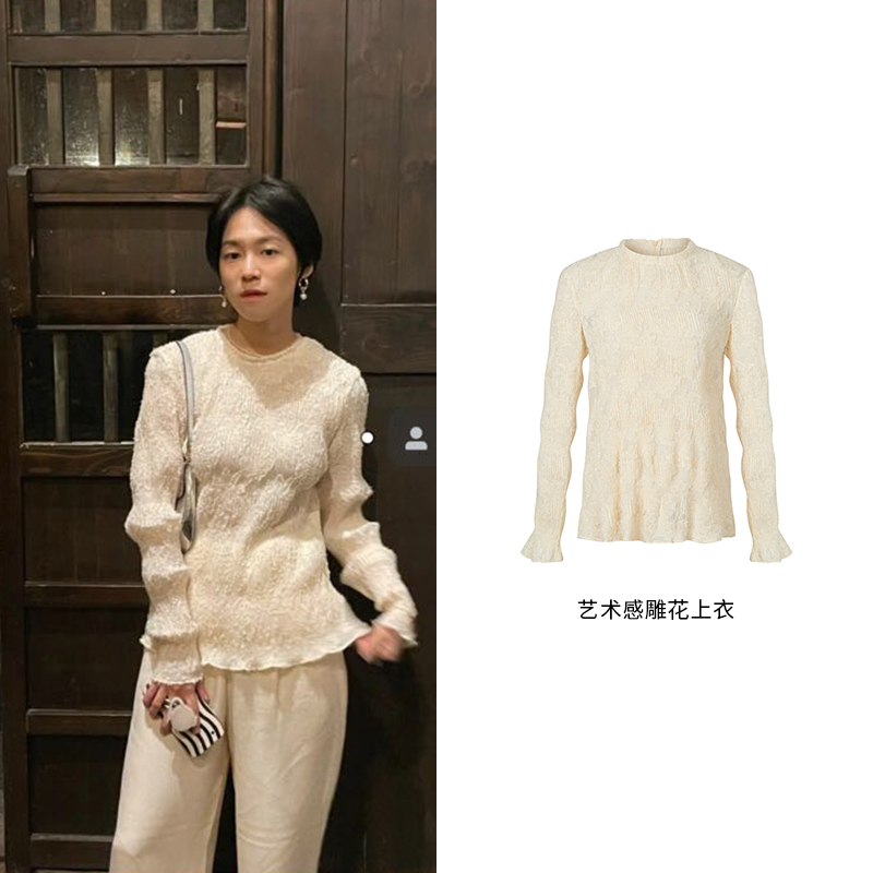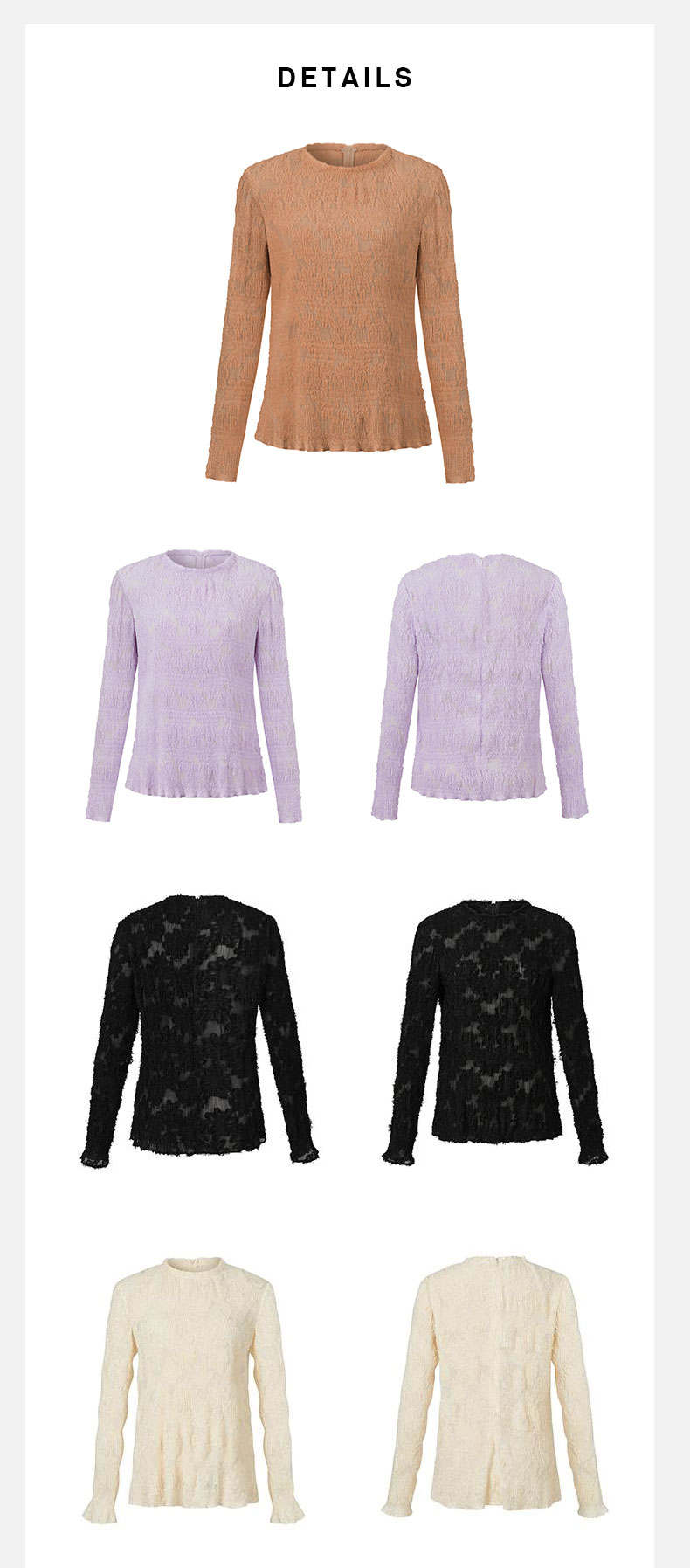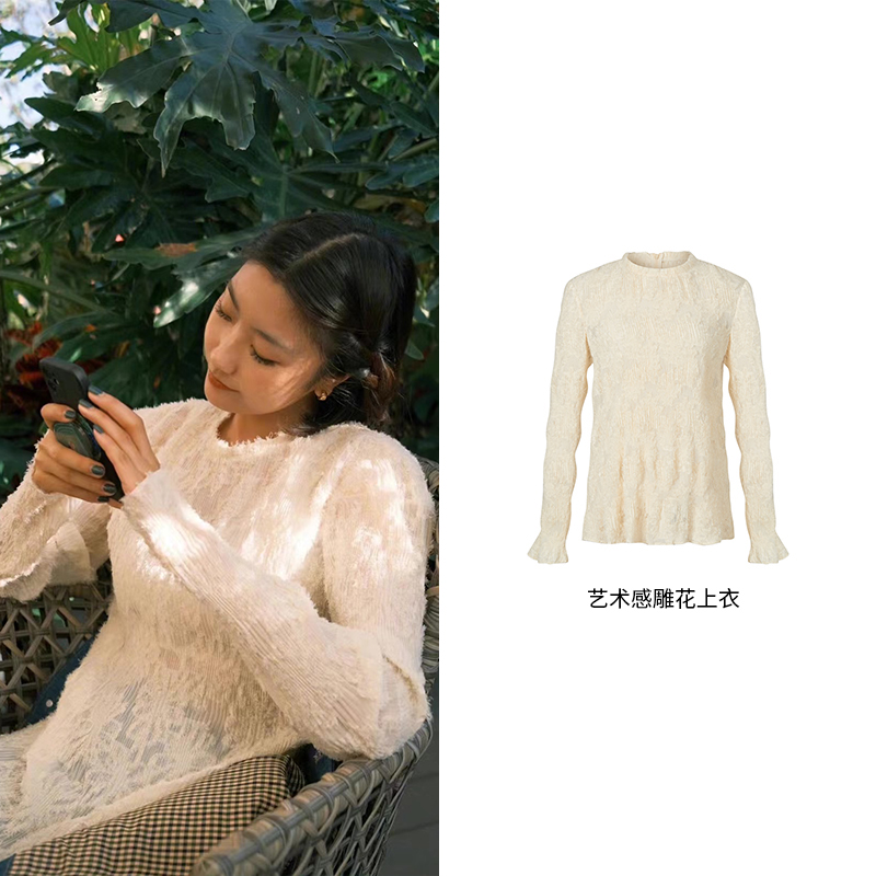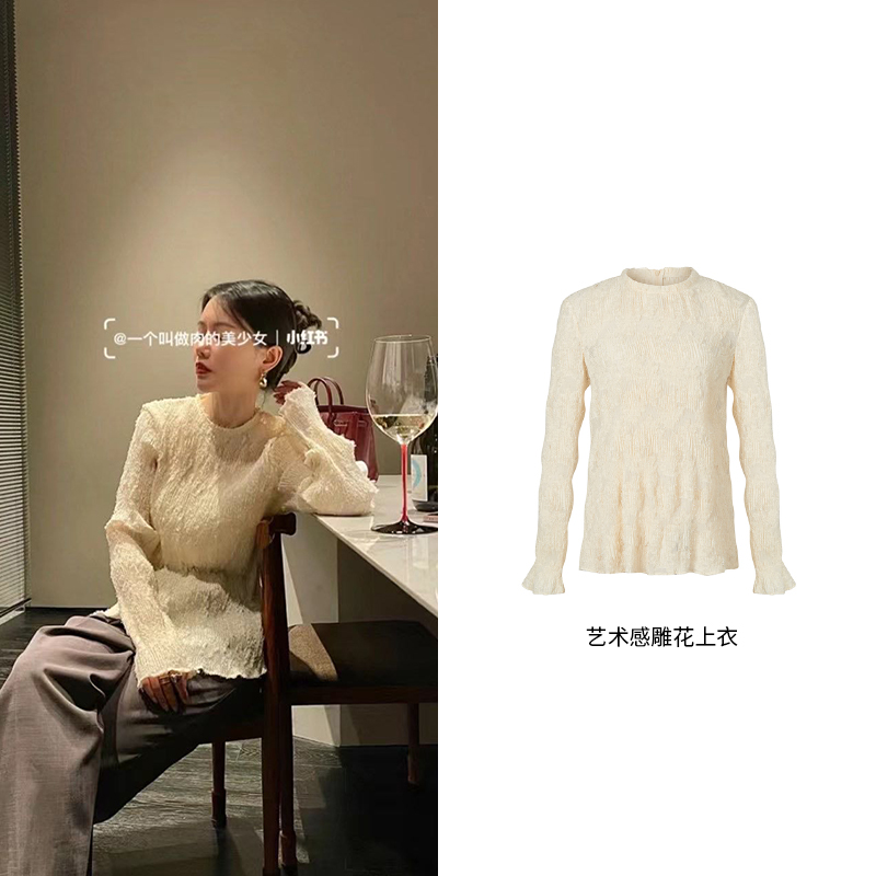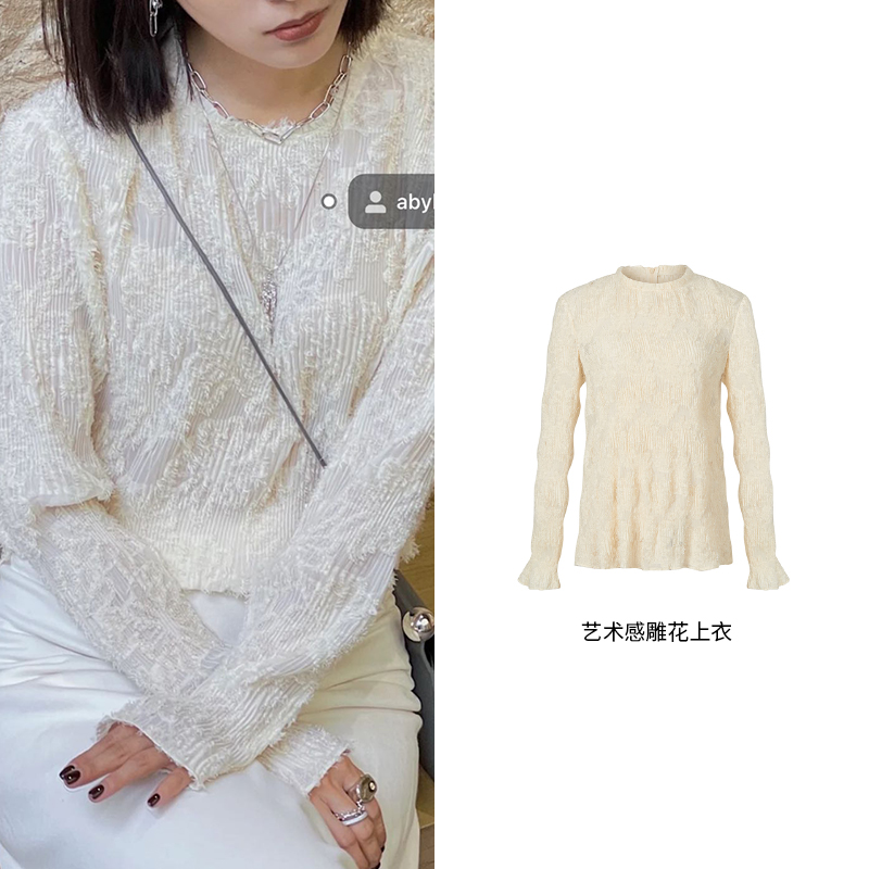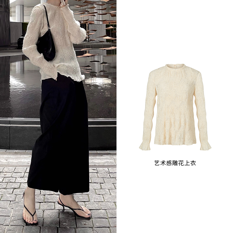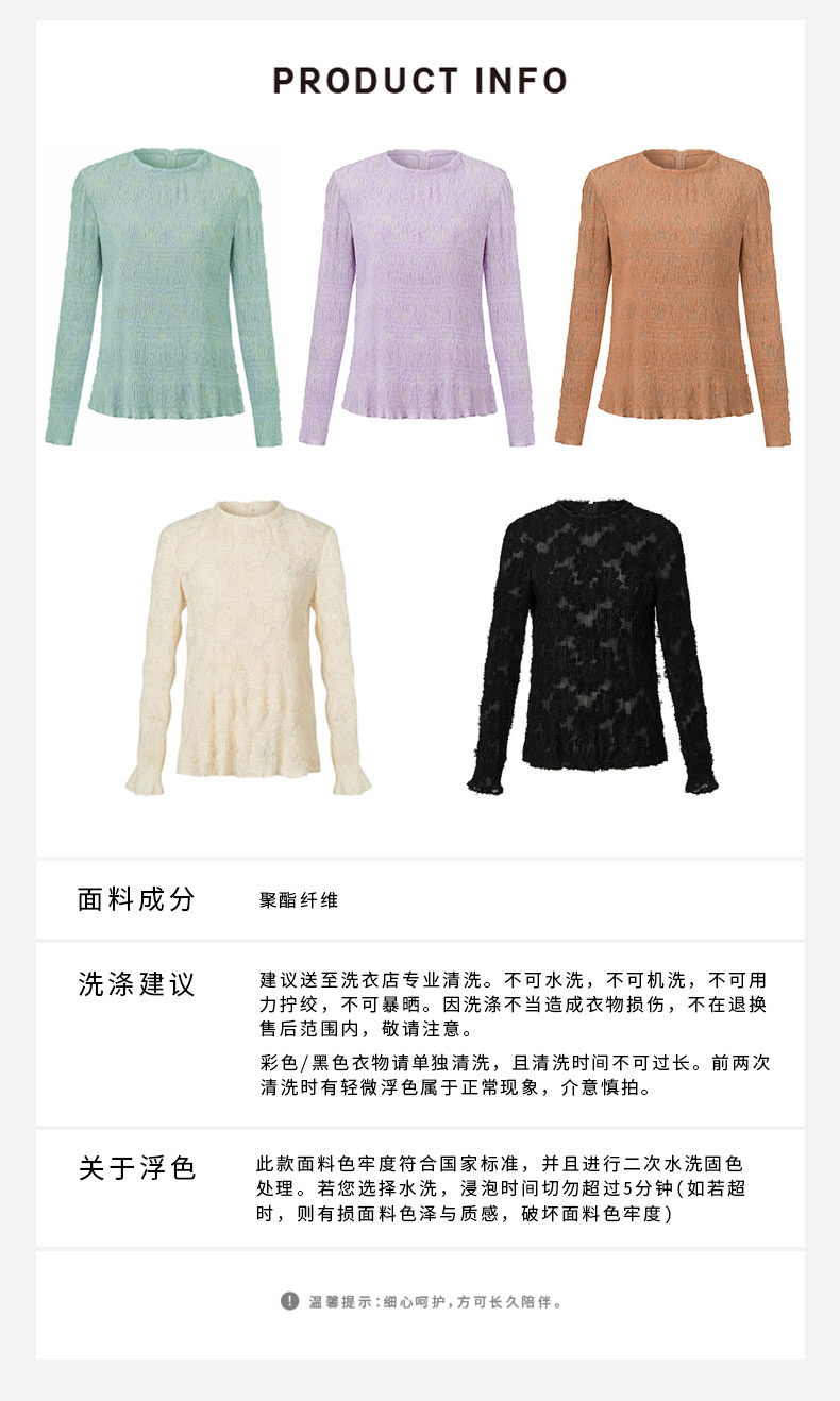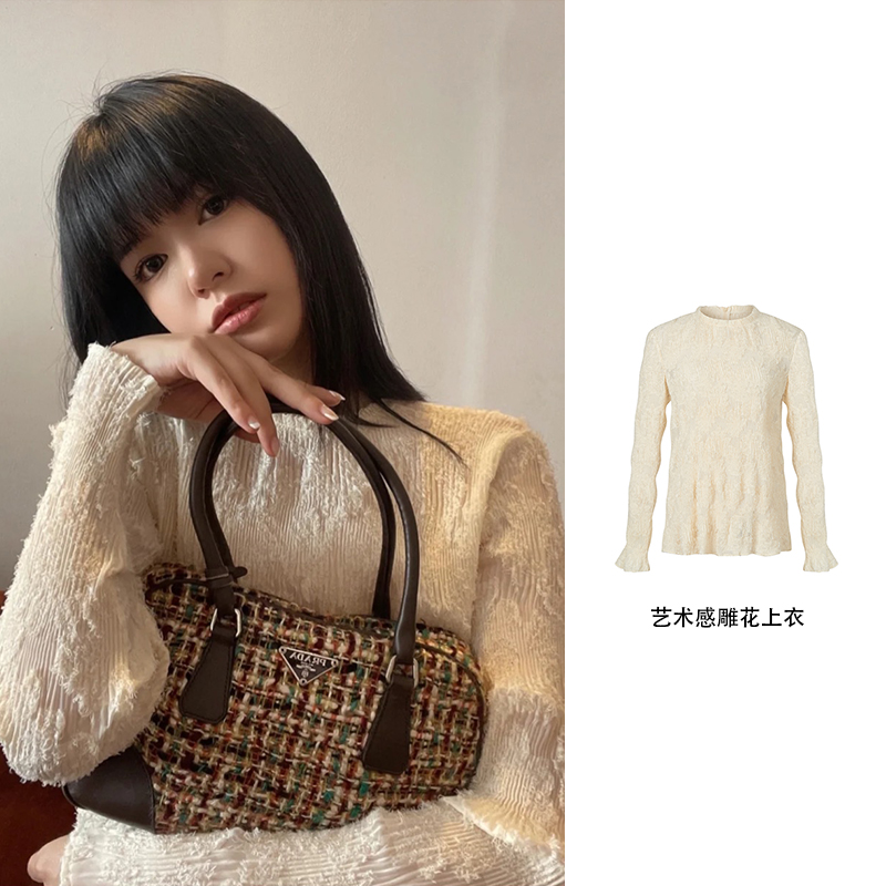 HIDEMI 到店必入艺术感雕花弹力上衣 黑色/米白色/奶油紫/巧克⼒⾊/清风绿