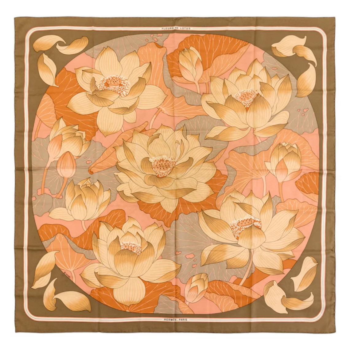 1961年法国爱马仕出品Christiane Vauzelle设计《莲花》主题棕色款丝绸方巾