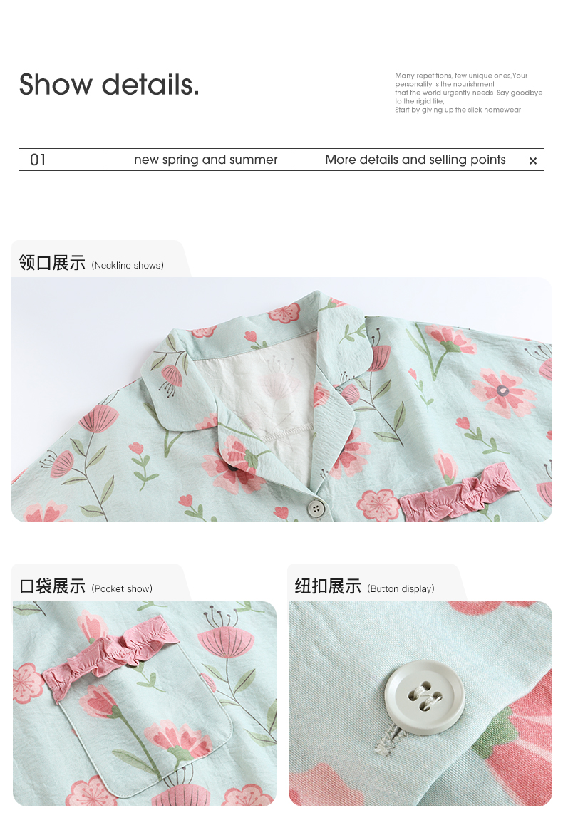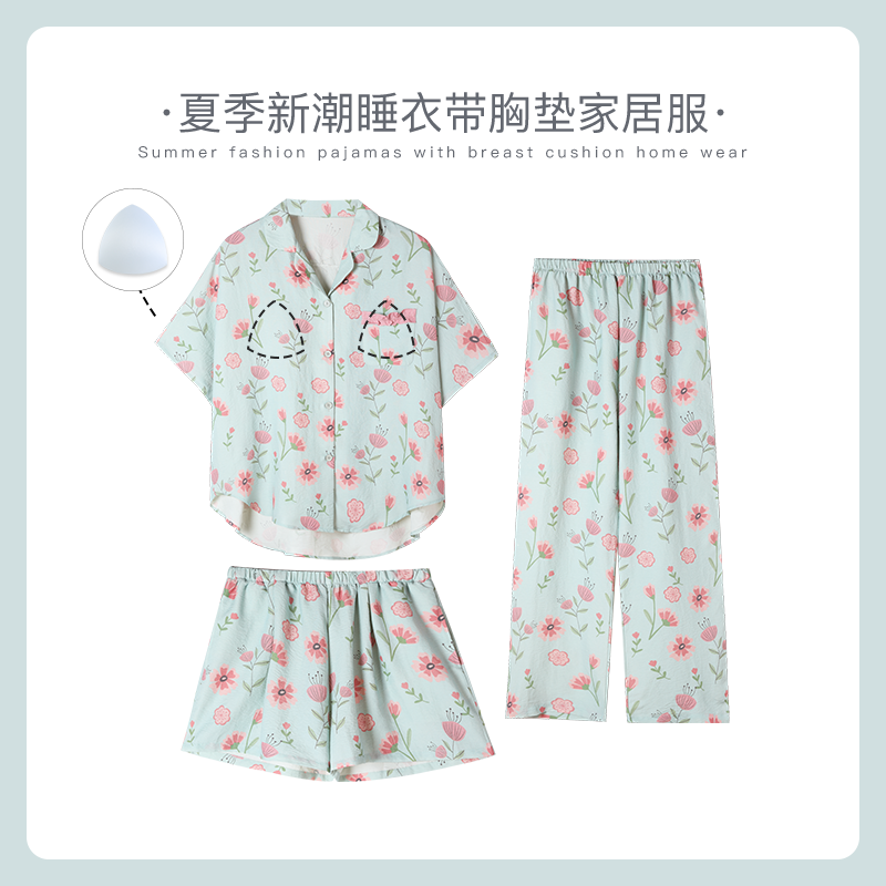 可人儿小众设计师新款泡泡绵女士睡衣夏季短袖可外出家居服三件套