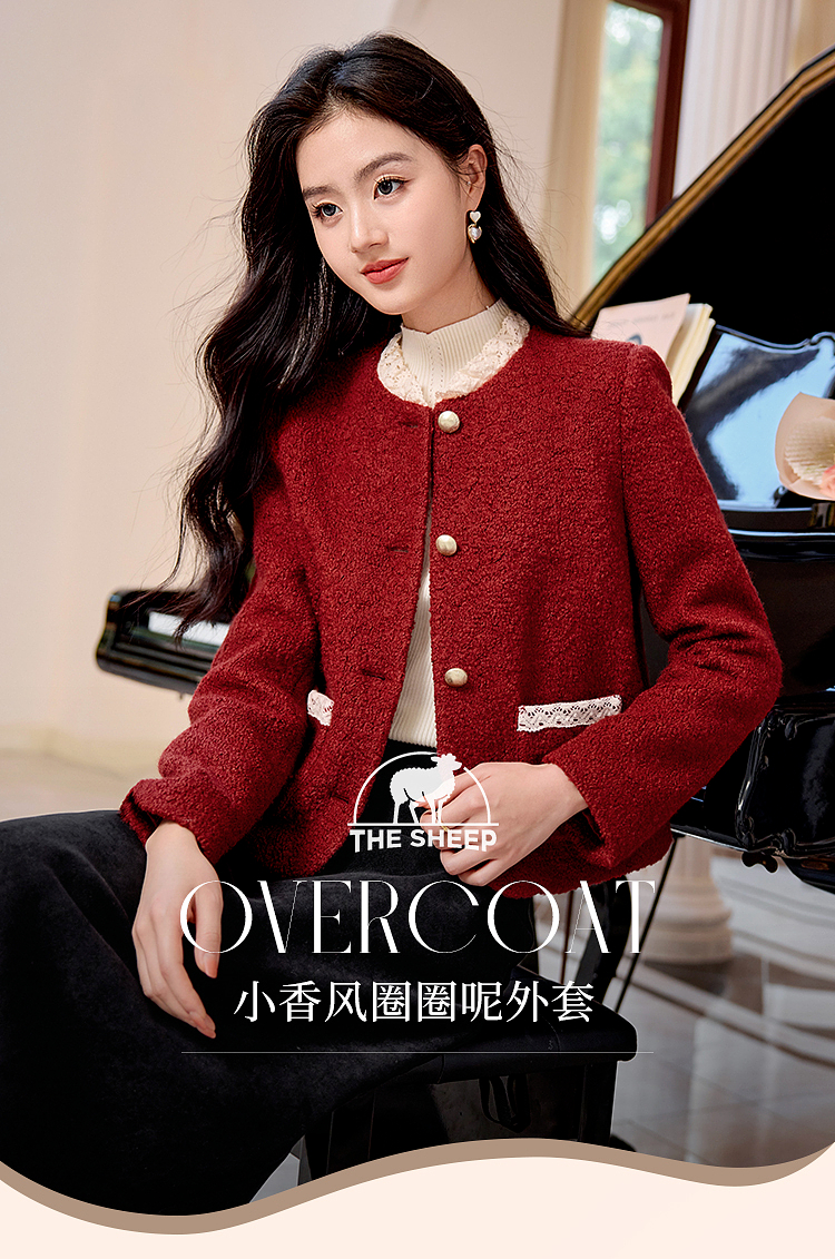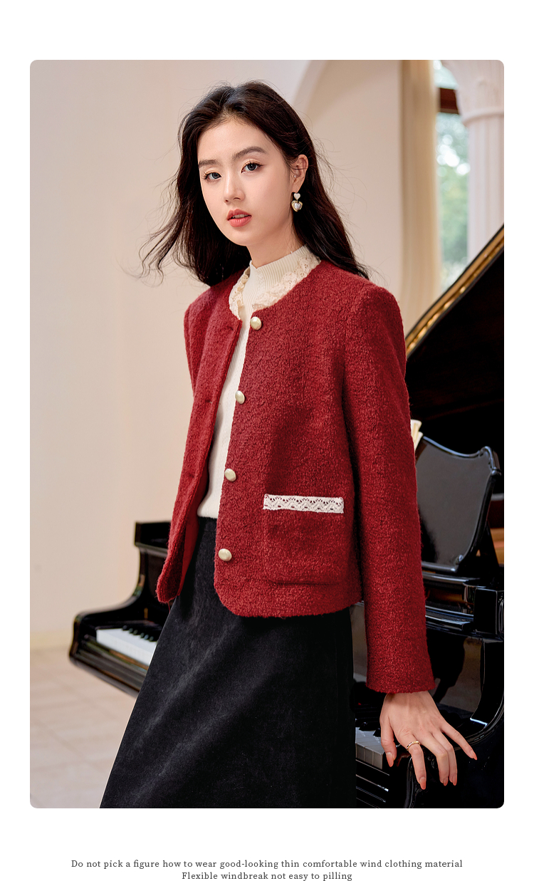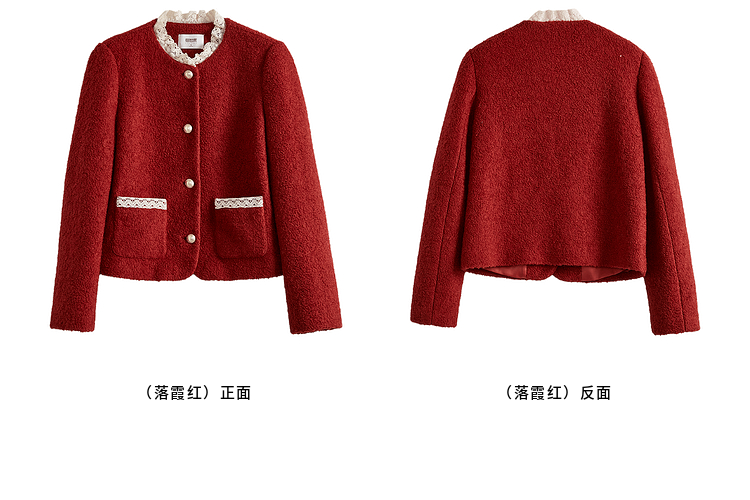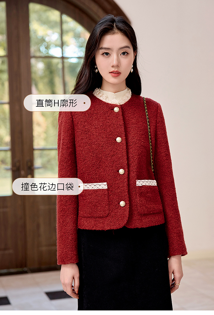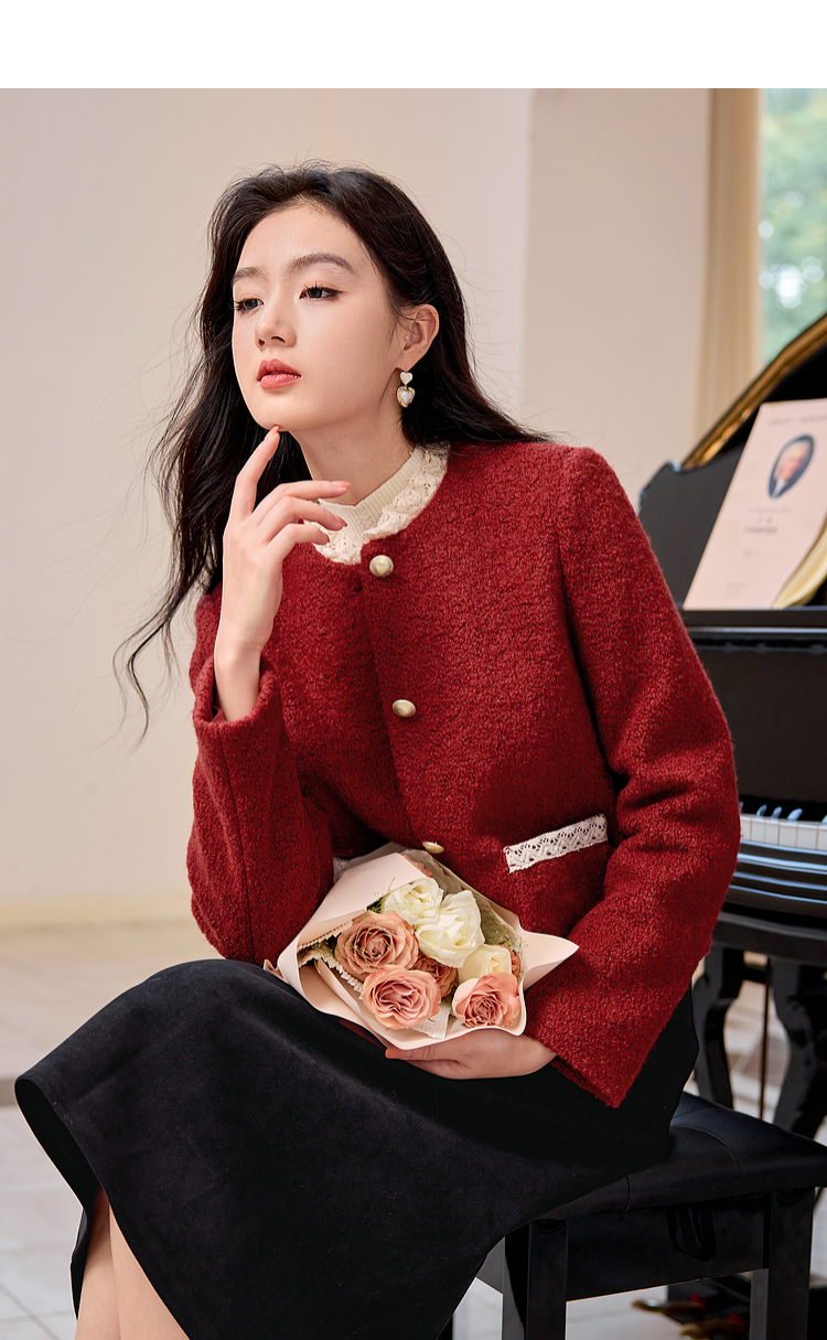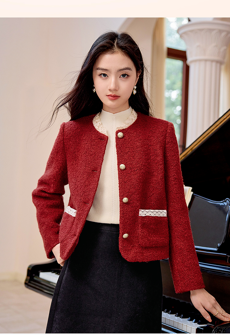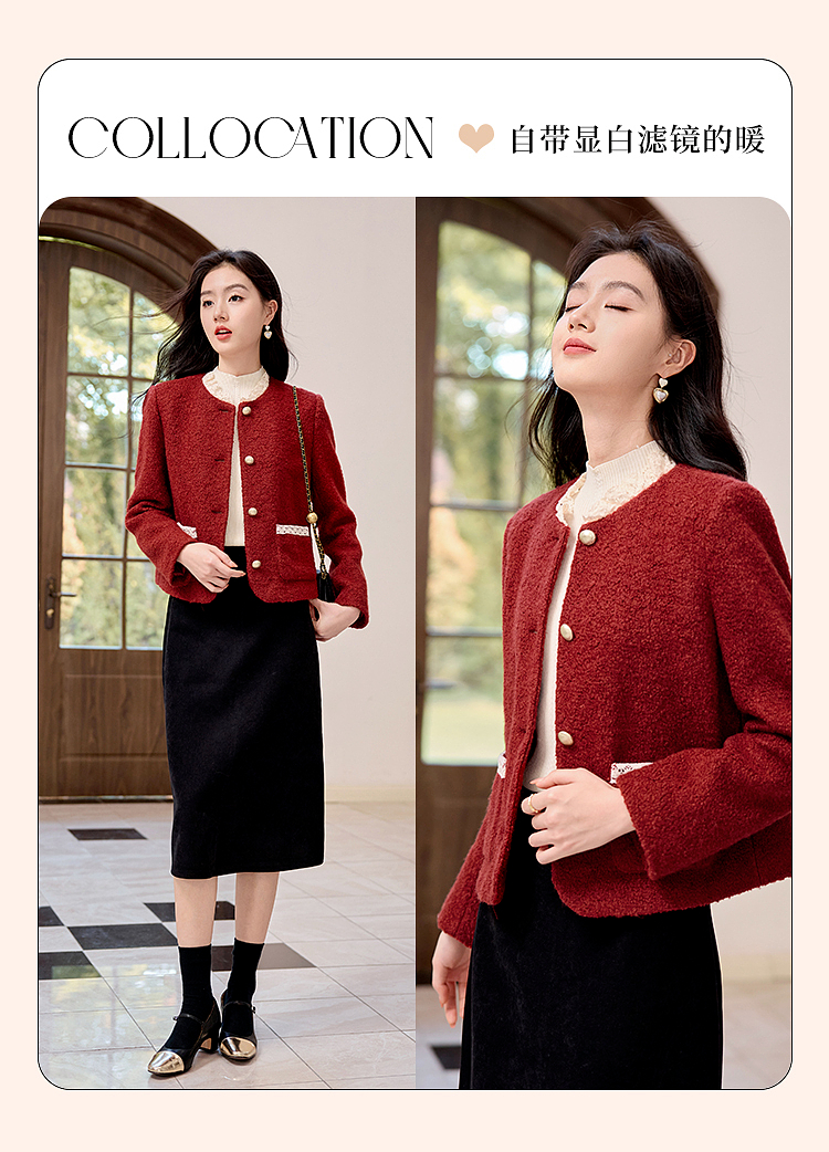 【年终特卖】熙世界*红色羊毛呢外套女短款软糯小香风呢子上衣2025秋冬新款