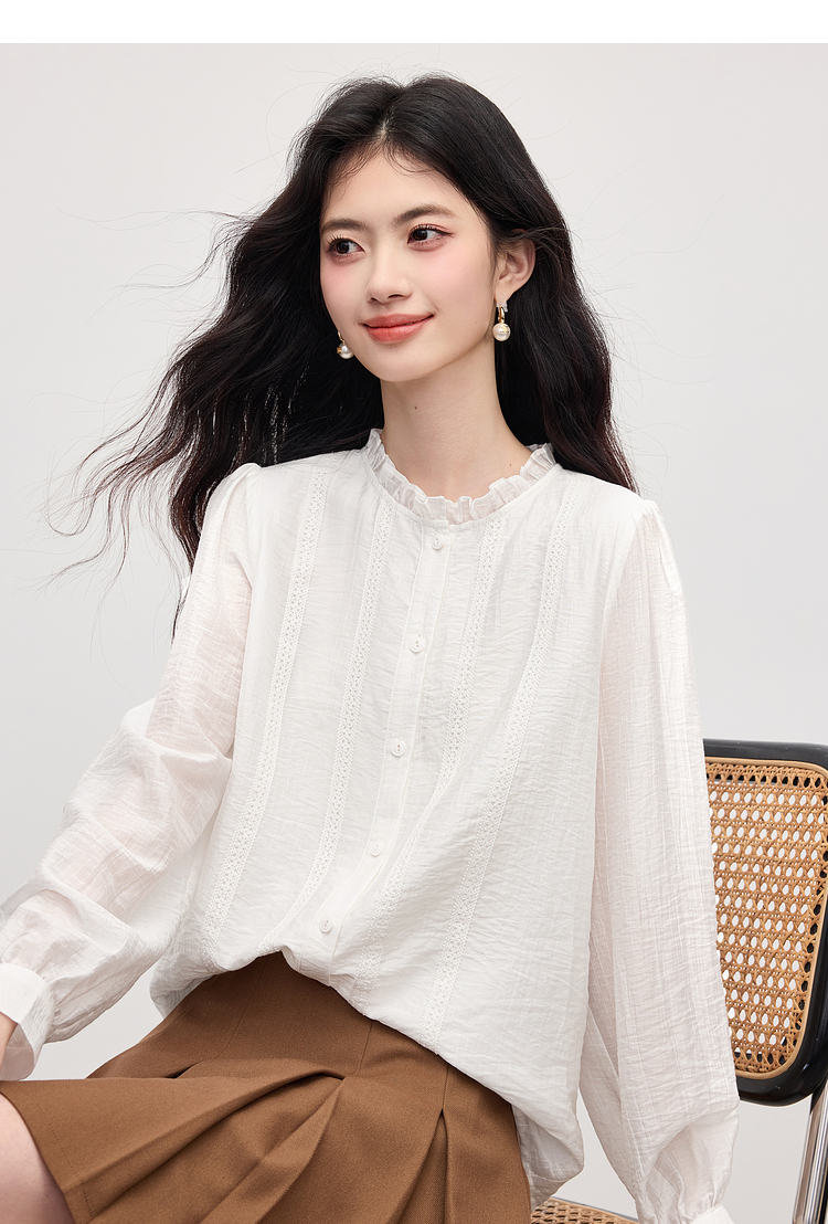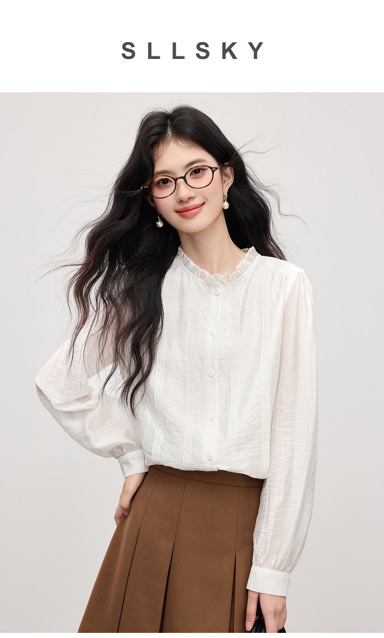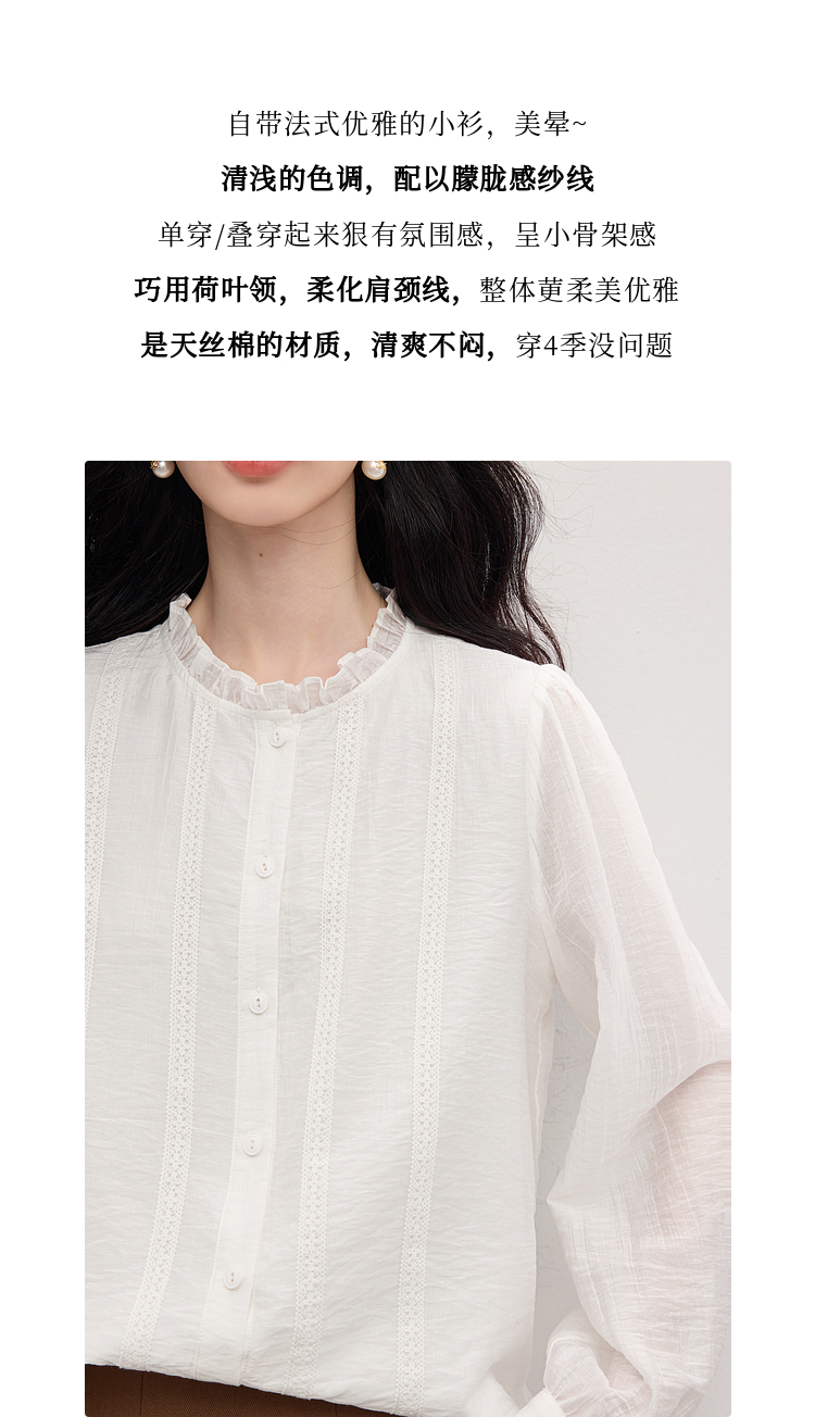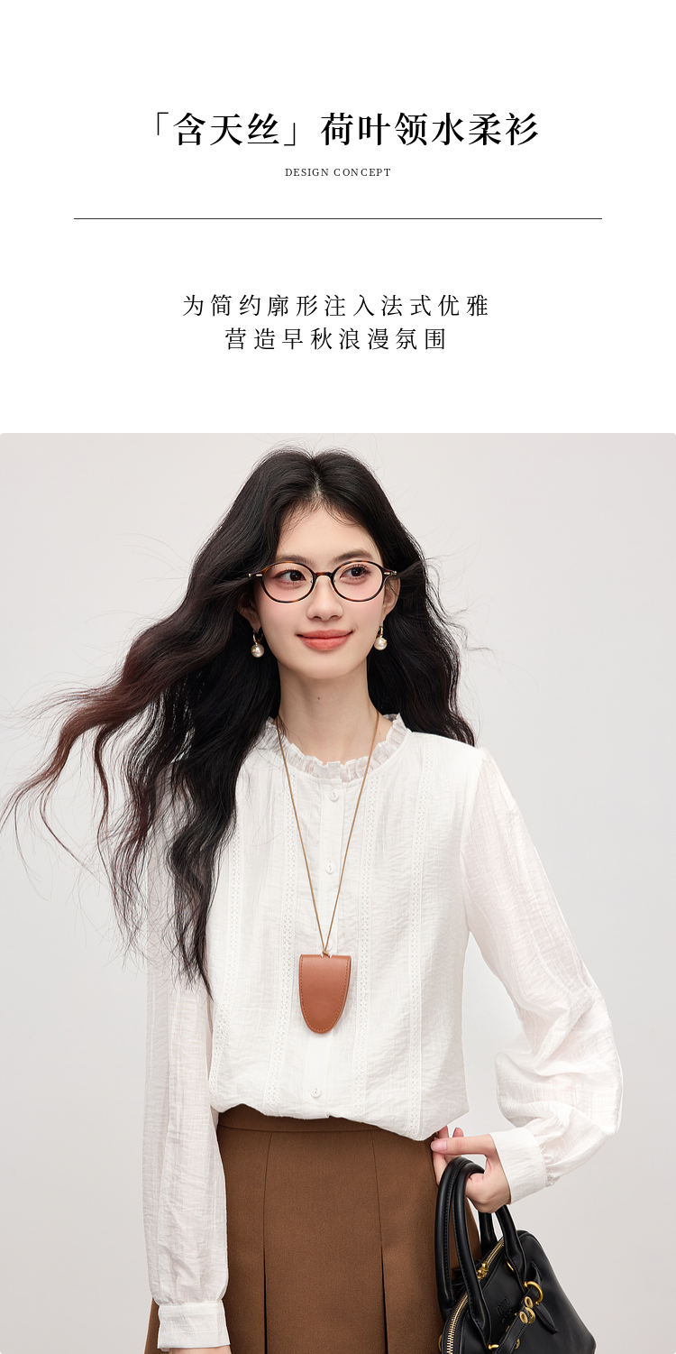 【09/03新品】熙世界莱赛尔天丝白色衬衫女2025秋日新款优雅气质长袖荷叶领上衣