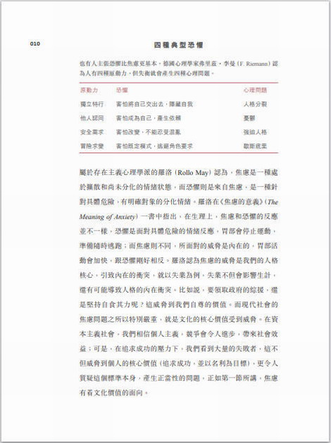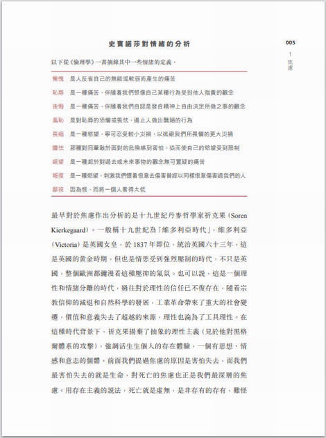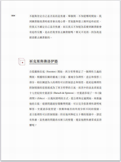 本書為梁光耀博士《哲學課》系列叢書的第5部作品,全書共分為10個章節,分別討論了焦慮、憂鬱、後悔、內疚、怨恨等9種負面情緒,加上複雜且亦正亦邪的愛欲,從這10種情緒入手,討論當今社會的情緒問題,配合作者親手繪製配合不同章節主題的插畫,為本書添加值得玩味的美學鑒賞內容。
