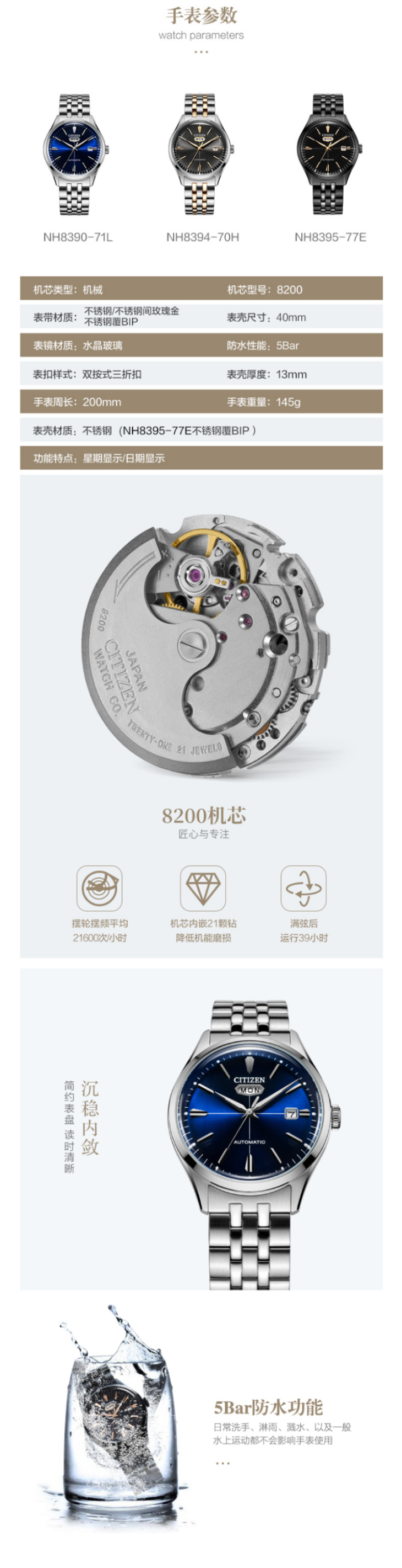 西铁城官方不锈钢表带防水机械优雅男表NH8390-71L