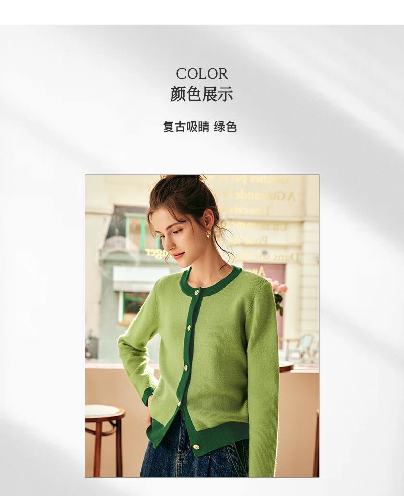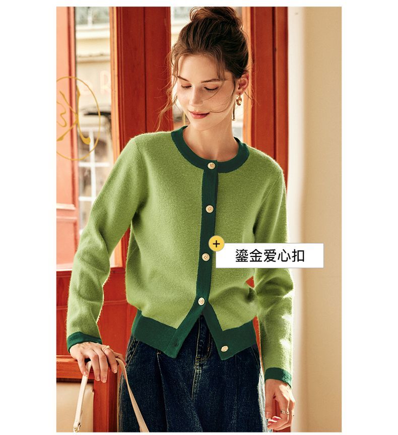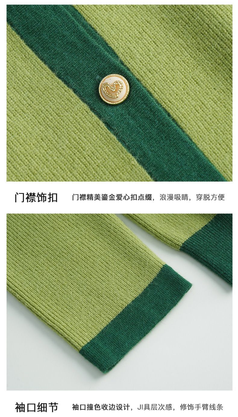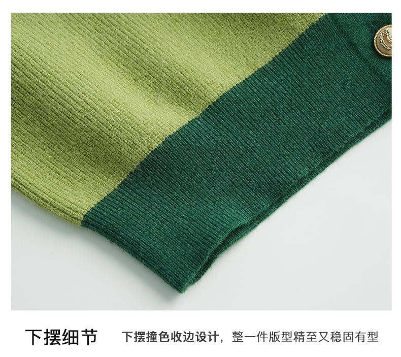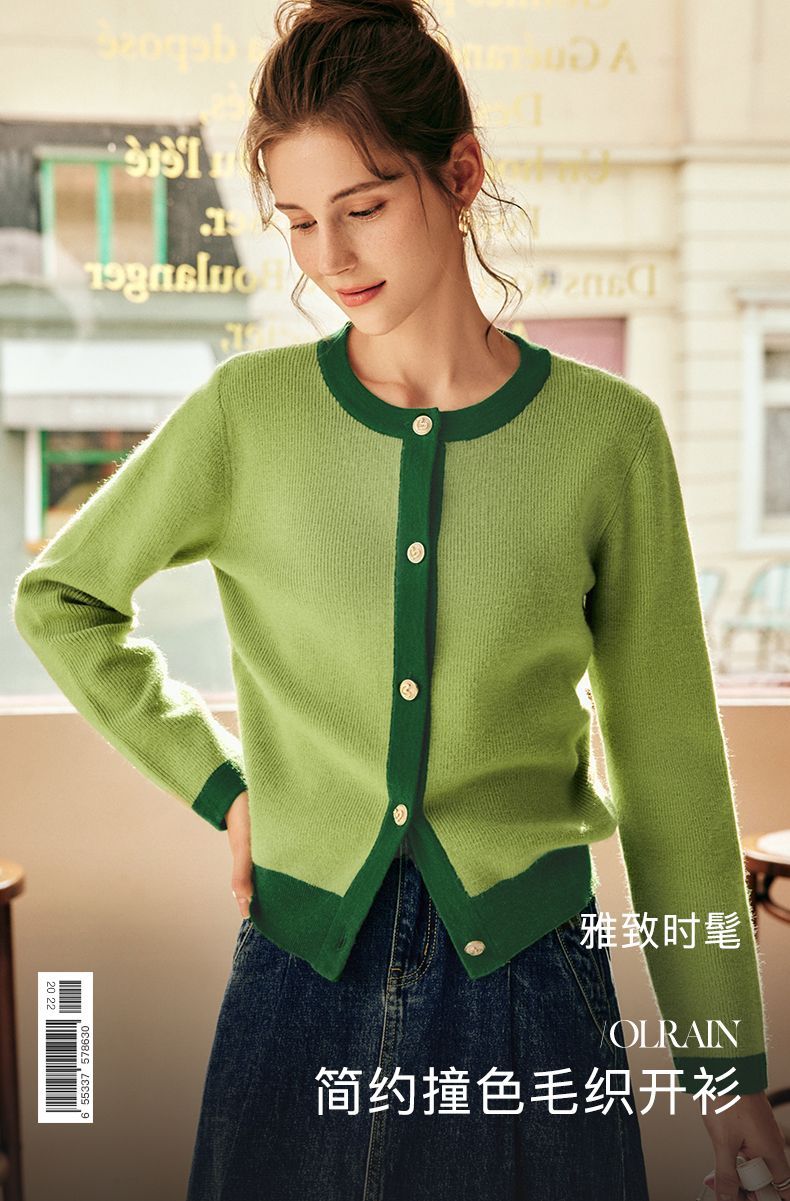 OLrain欧芮儿法式绿色毛衣女秋季2022年新款修身简约撞色针织开衫