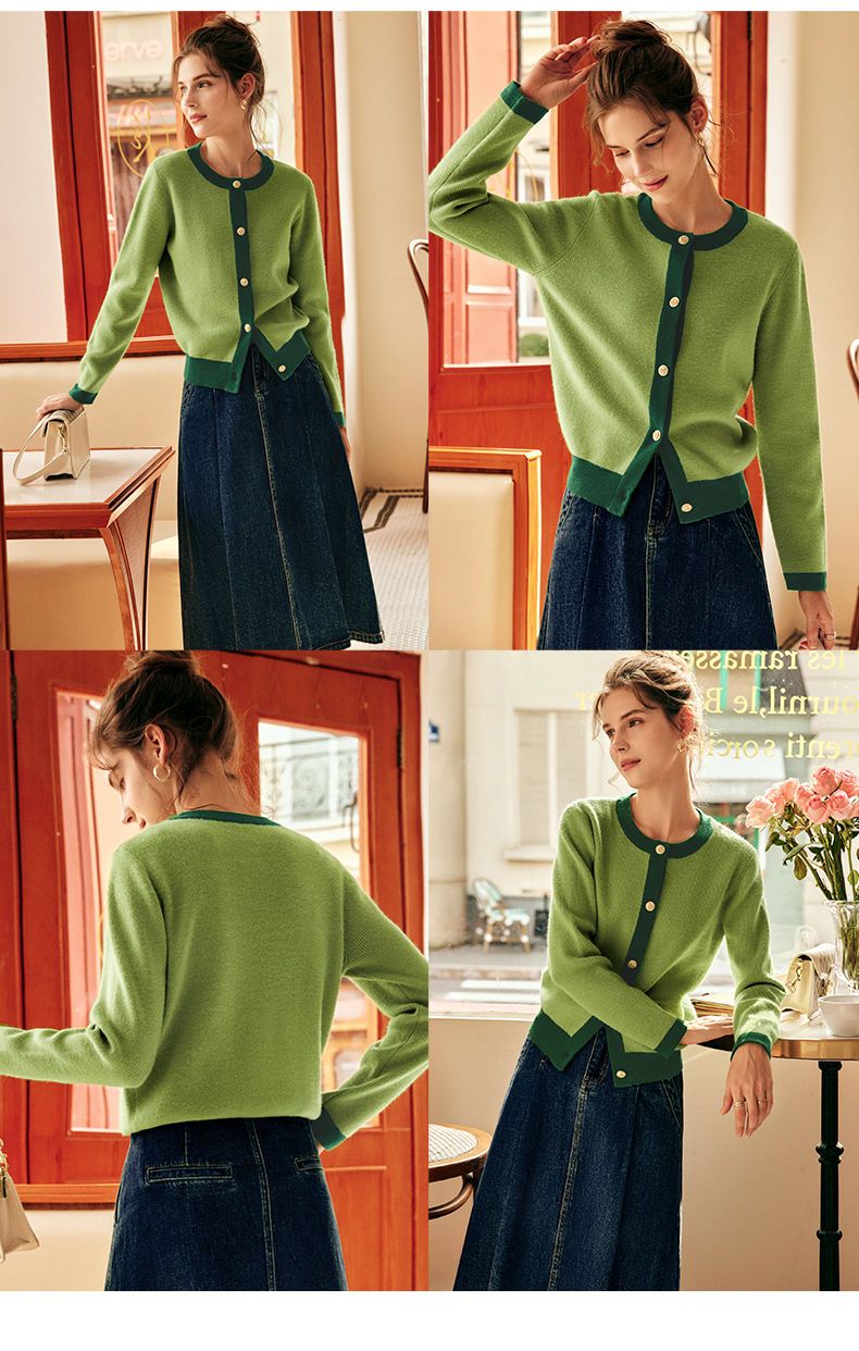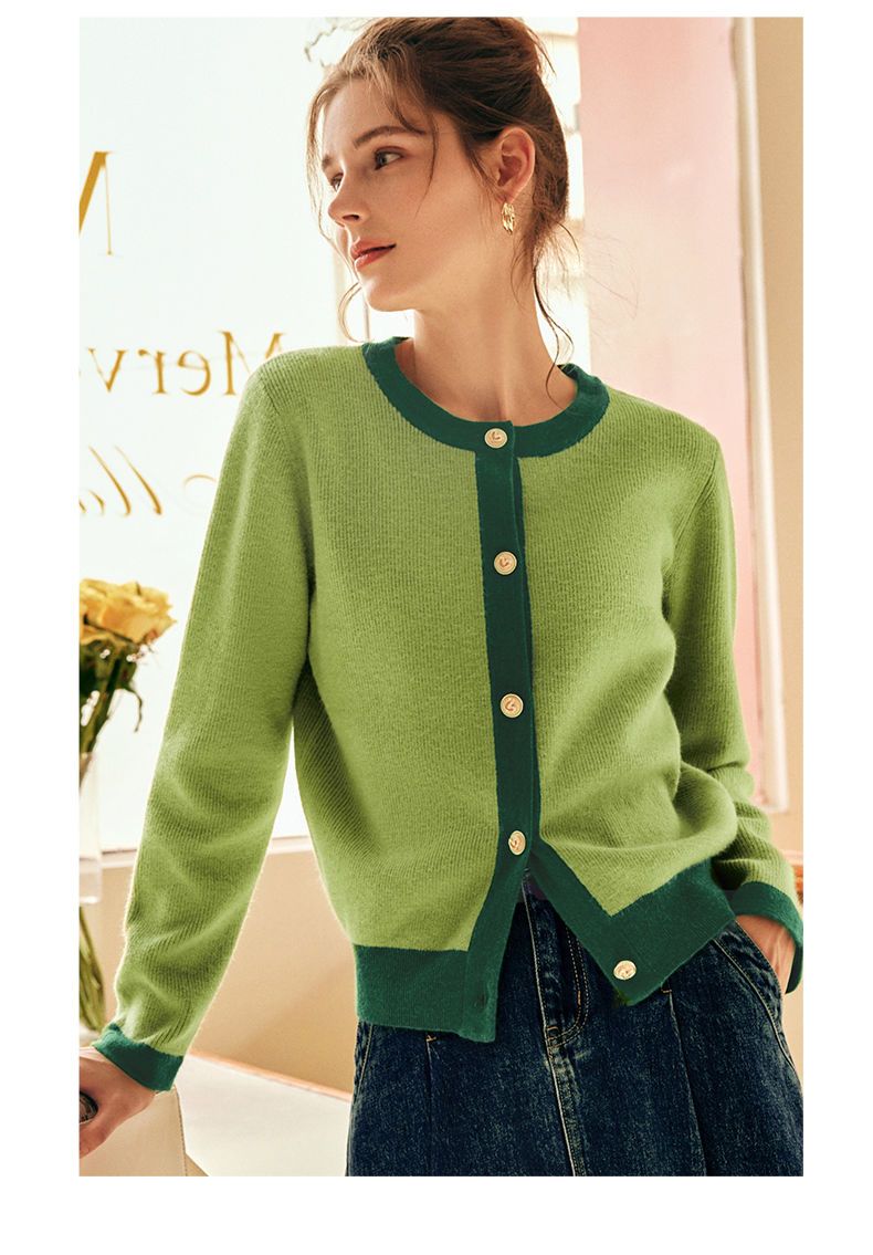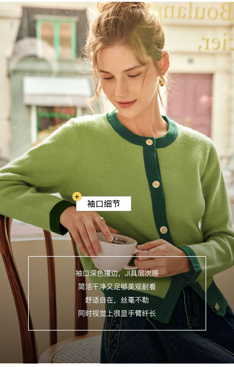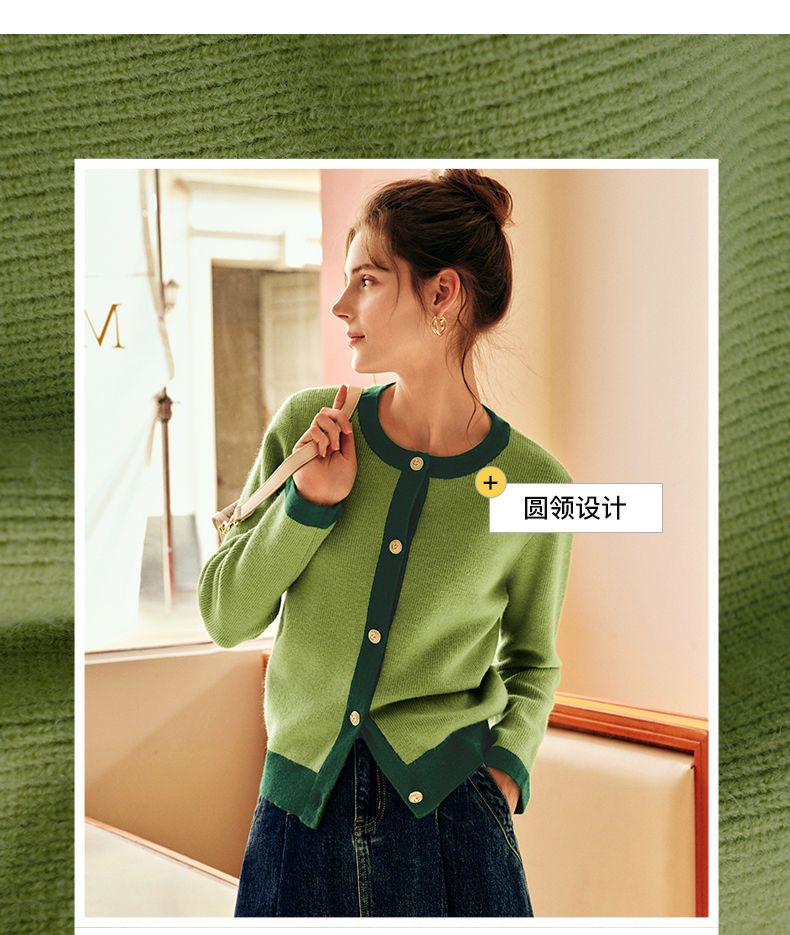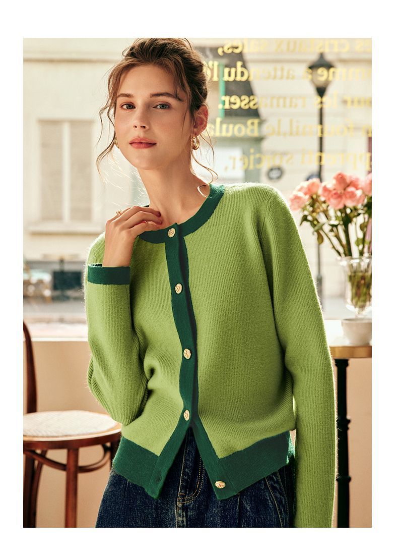 OLrain欧芮儿法式绿色毛衣女秋季2022年新款修身简约撞色针织开衫