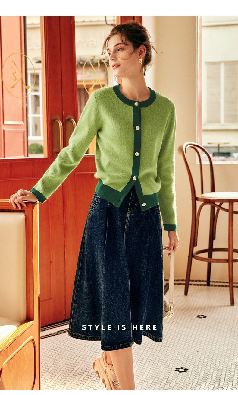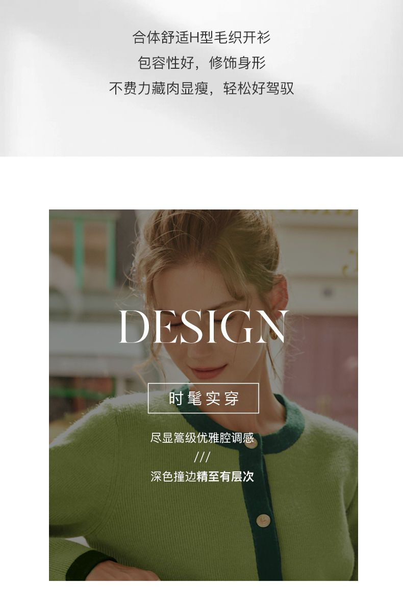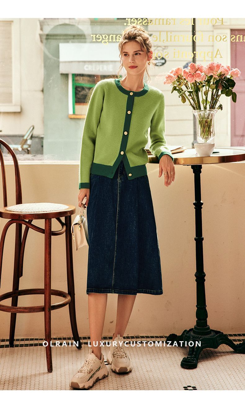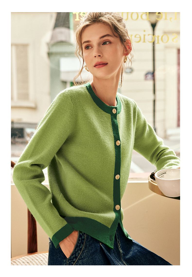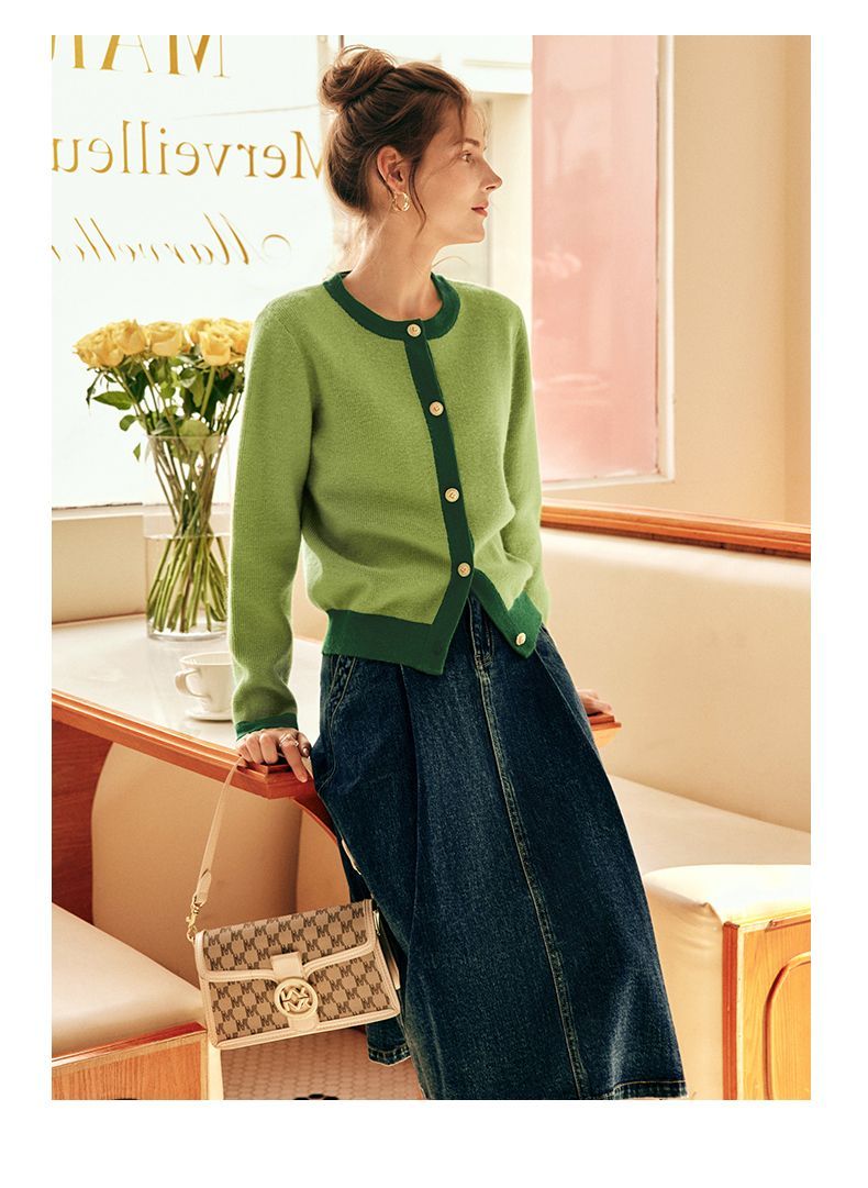 OLrain欧芮儿法式绿色毛衣女秋季2022年新款修身简约撞色针织开衫