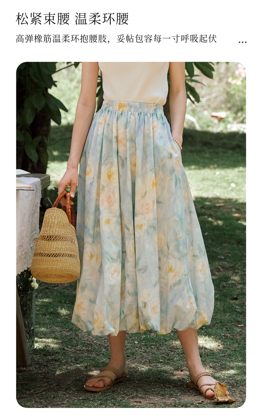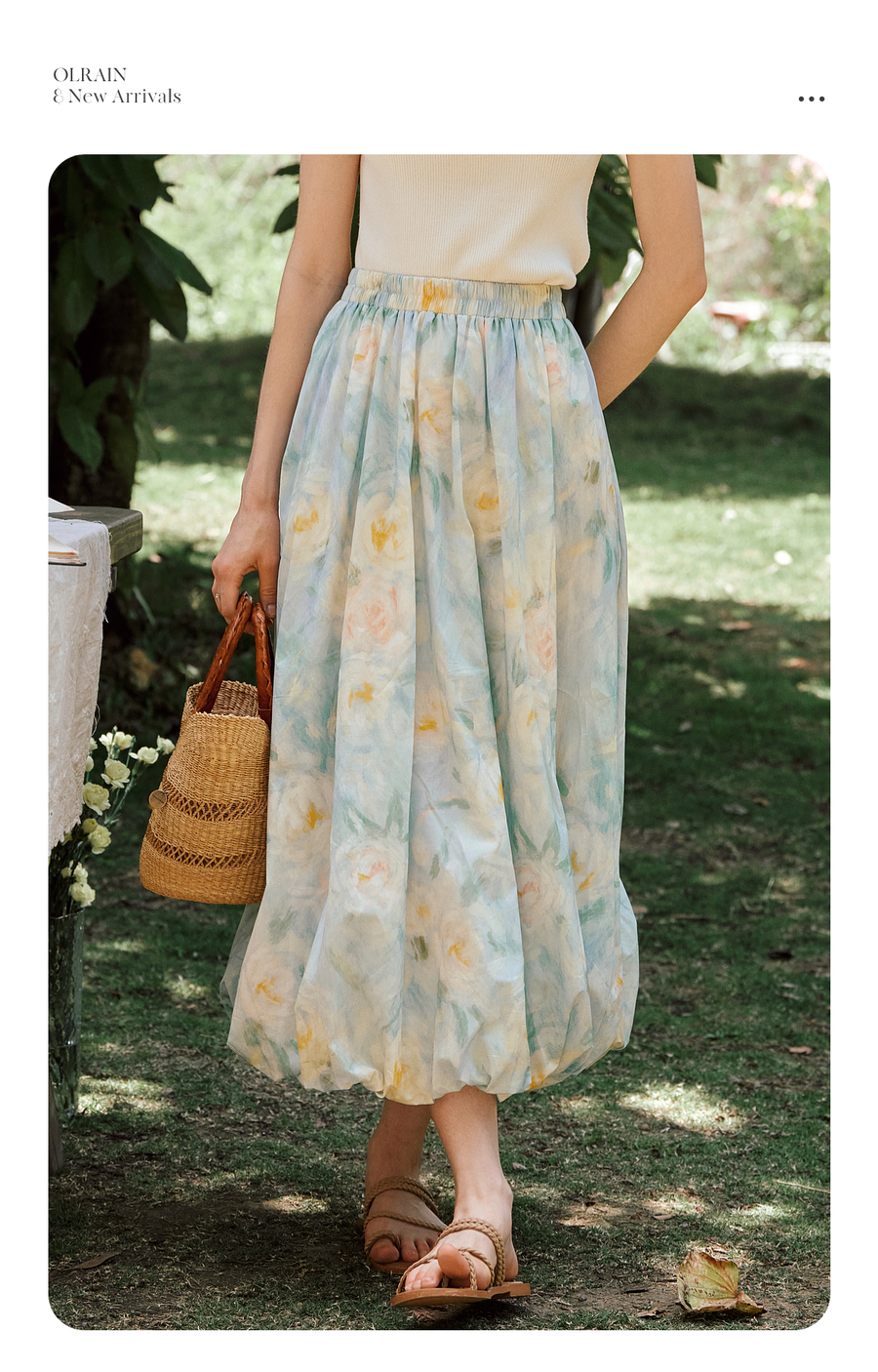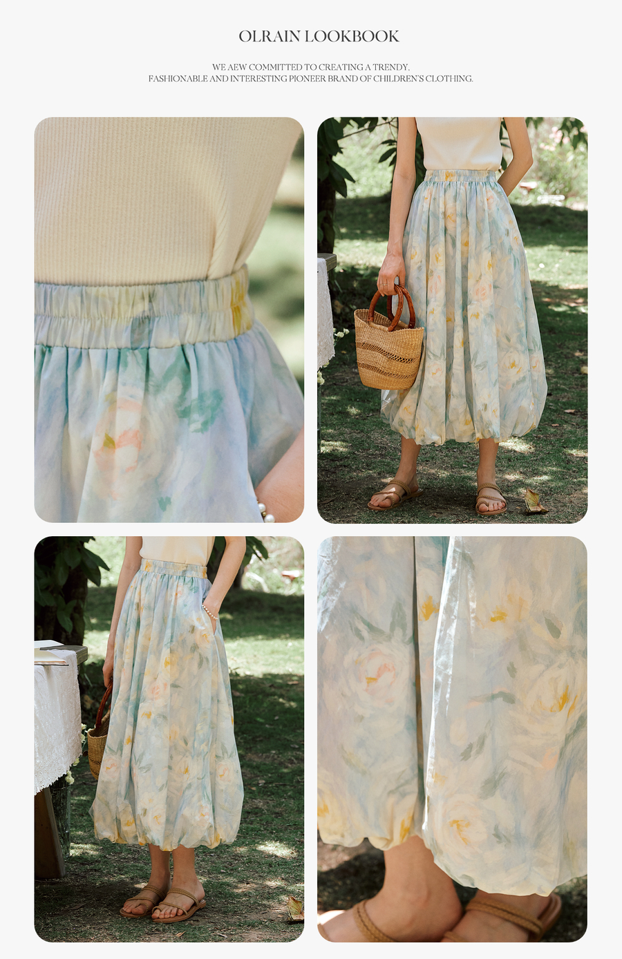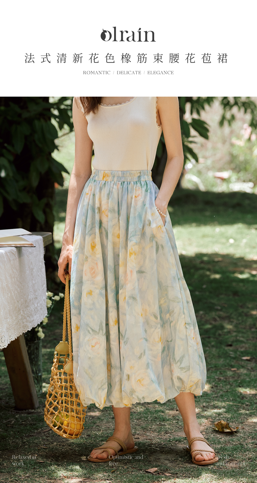 OLrain欧芮儿法式清新花色橡筋束腰花苞裙女夏季2025新款休闲裙子