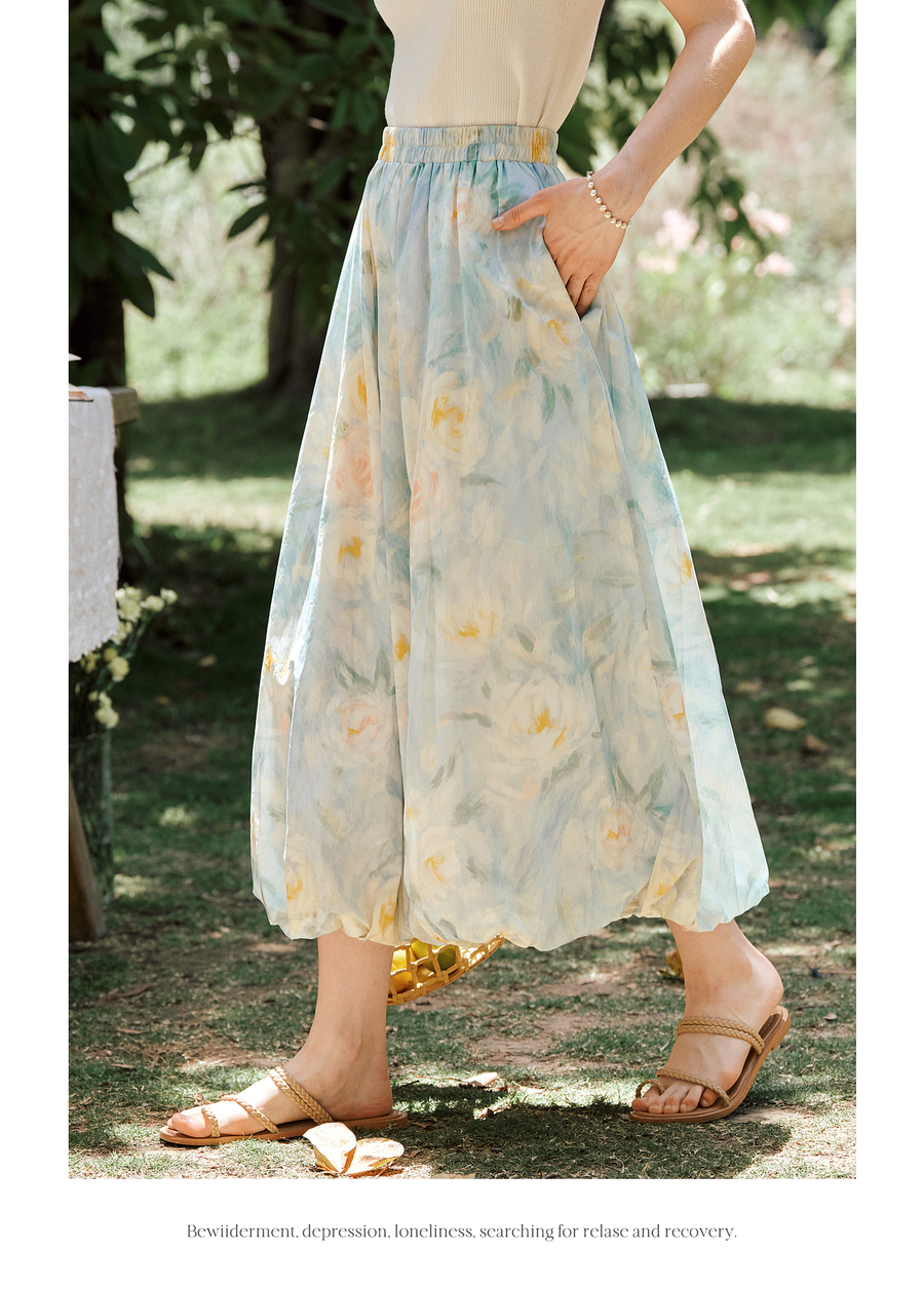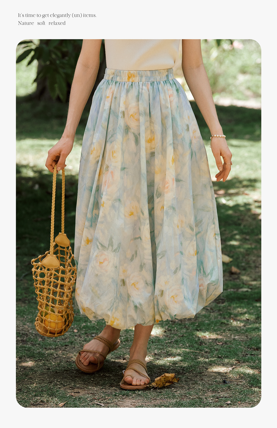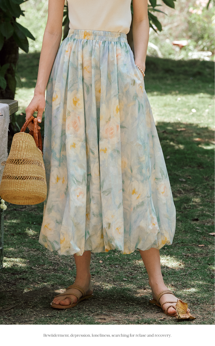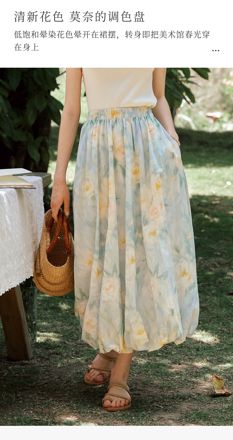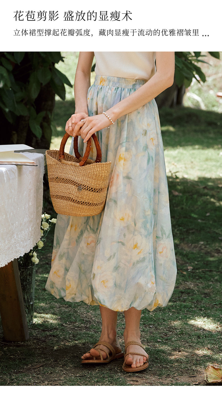 OLrain欧芮儿法式清新花色橡筋束腰花苞裙女夏季2025新款休闲裙子