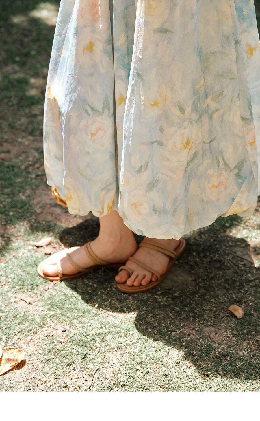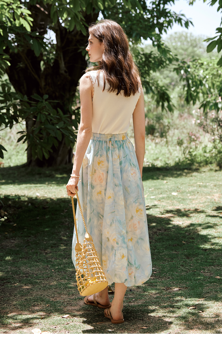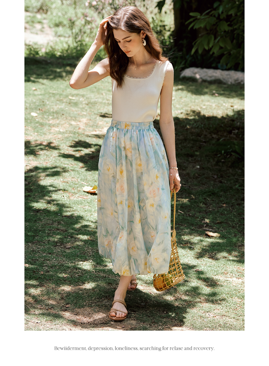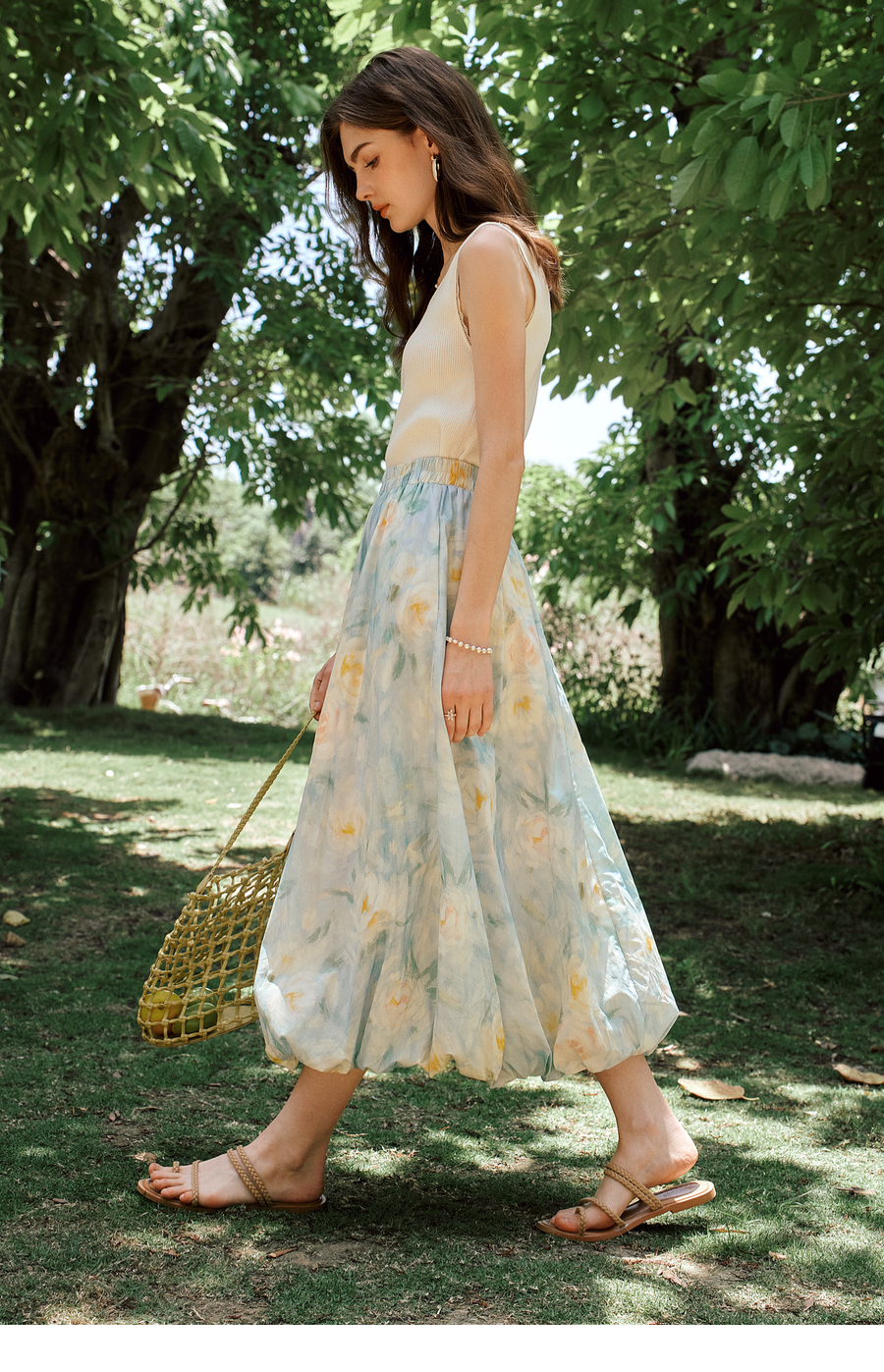 OLrain欧芮儿法式清新花色橡筋束腰花苞裙女夏季2025新款休闲裙子