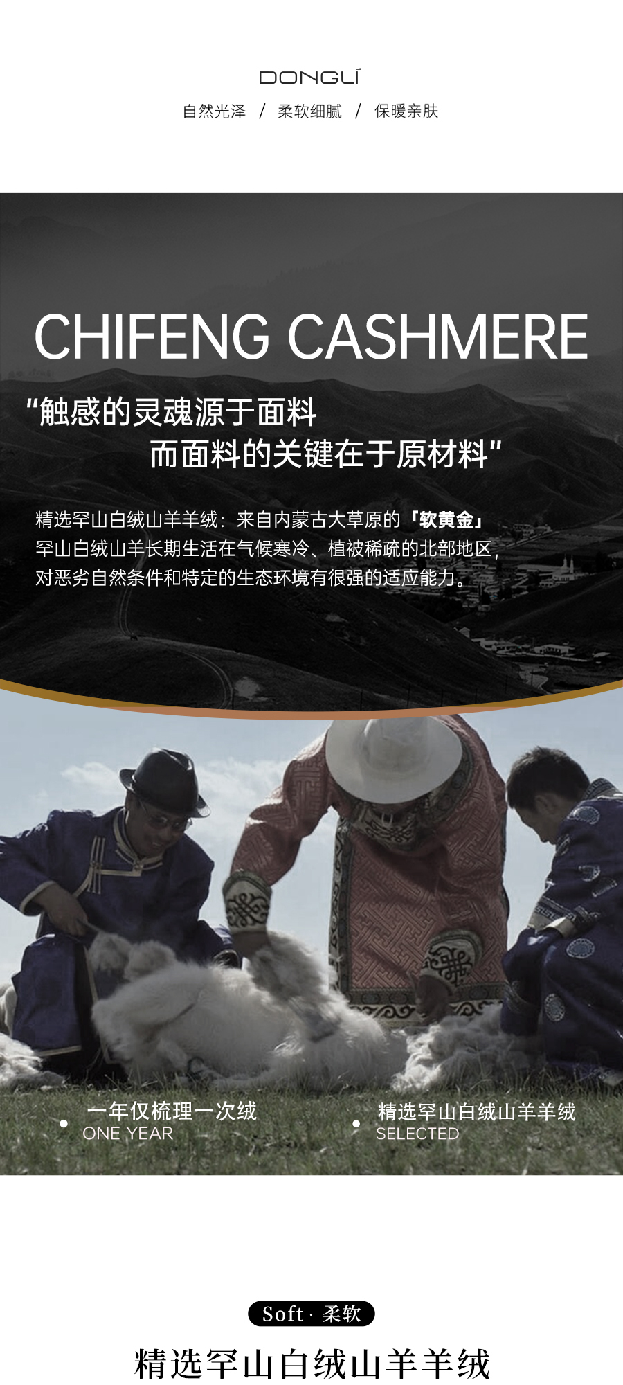 东黎羊绒是赤峰东荣集团自主品牌,自有牧场/羊绒制品全产业链优势,实现了羊绒从“牧场”到“商场”的华丽转变。