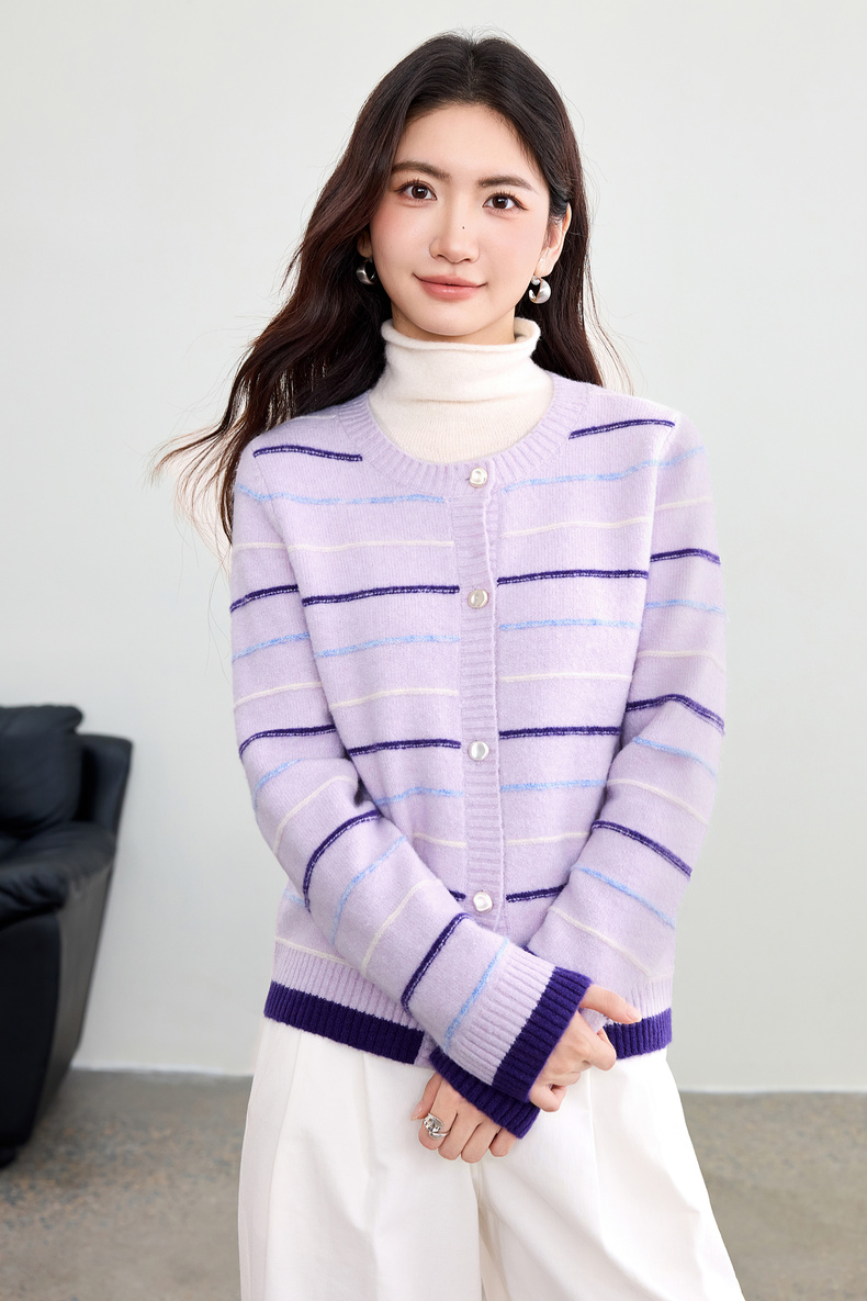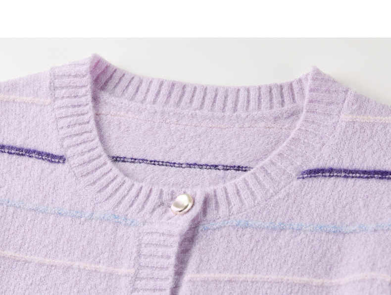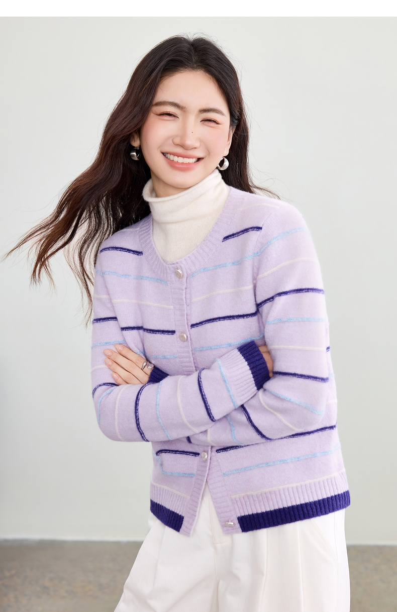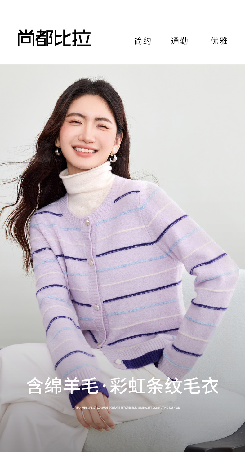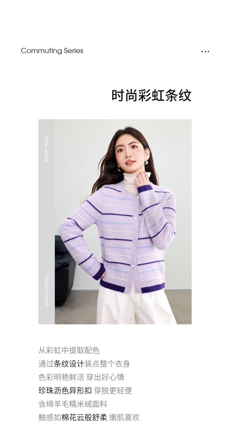 【内购】【含绵羊毛】通勤彩虹条纹珍珠沥色异形扣圆领长袖软糯开衫毛衣-W53EB3510