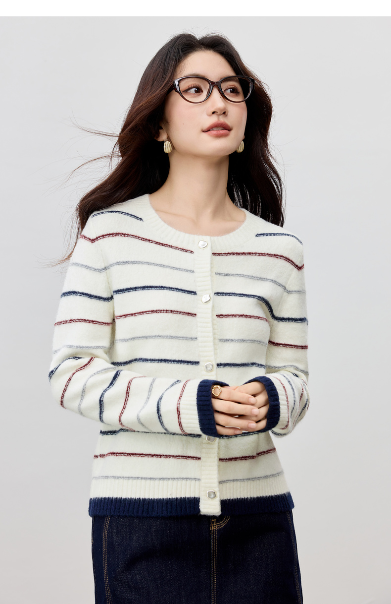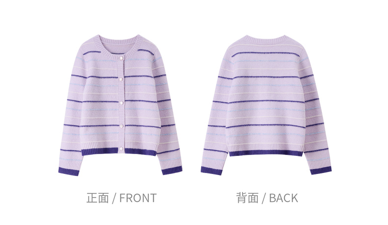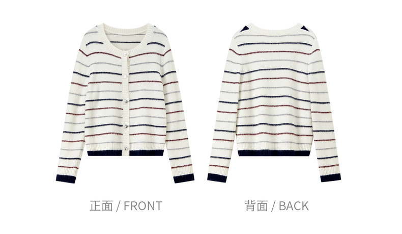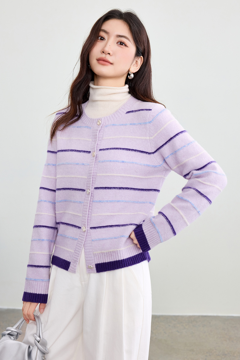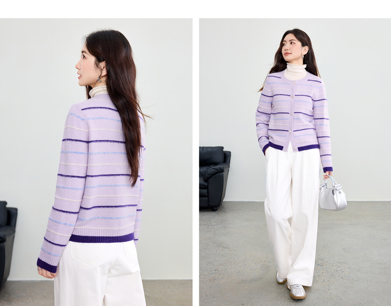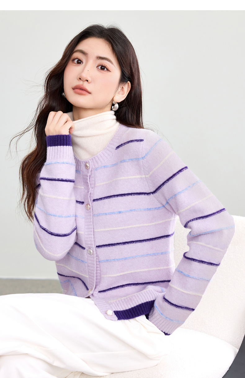 【内购】【含绵羊毛】通勤彩虹条纹珍珠沥色异形扣圆领长袖软糯开衫毛衣-W53EB3510