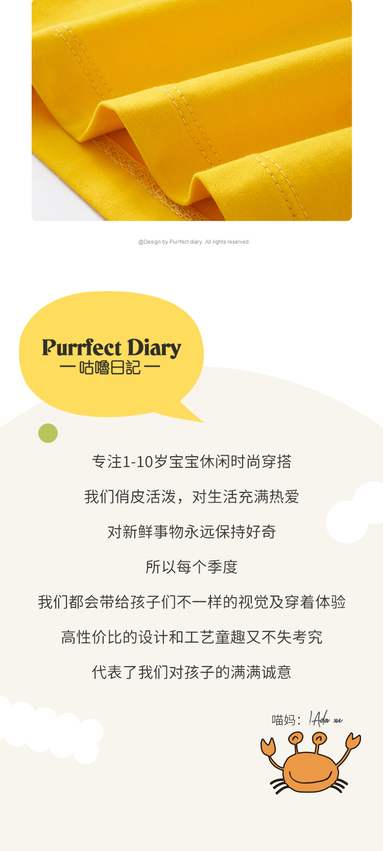 Purrfect-Diary专注于贴近自然随性的穿着概念,轻奢平价的童装文化传播,在产品设计上更加注重婴童穿着的舒适性、安全性、更出众的国际化品牌,将欧美的育婴文化在中国进行深入的传播与推广。