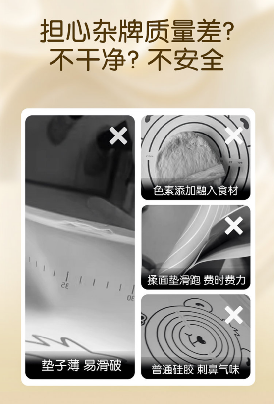市面上90%的面垫、面板 木案板易发霉又粘连 不锈钢案板既占地方又难收纳 团长替你们排了n多雷 最后才锁定硅胶面垫,只用硅胶面垫 不过并不是所有硅胶面垫都好用 要警惕市面上的劣质硅胶揉面垫 有害物质析出,威胁人体健康 刺激性气味,危害人体呼吸系统 防滑性差,用起来容易滑动,影响操作效率和安全性 容易粘面,要频繁撒面粉等干粉来防止粘连,增加了操作难度和清洁工作量